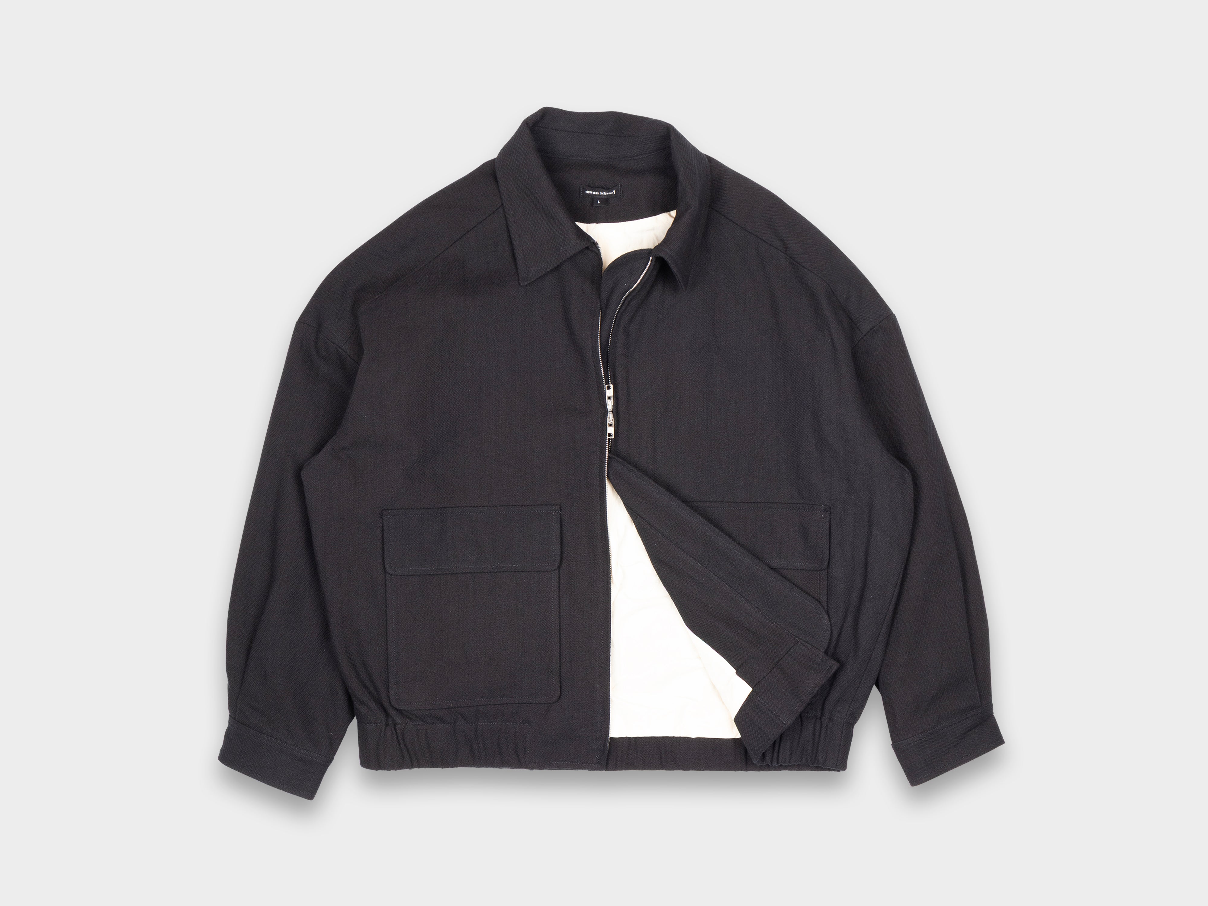 +“Zip Jacket Two" features a boxy fit, dropped shoulders and an elasticated hem. Large front pockets with top and side entry and hidden button closures. This garment also has a two-way Lampo zip, Corozo buttons and is fully lined.