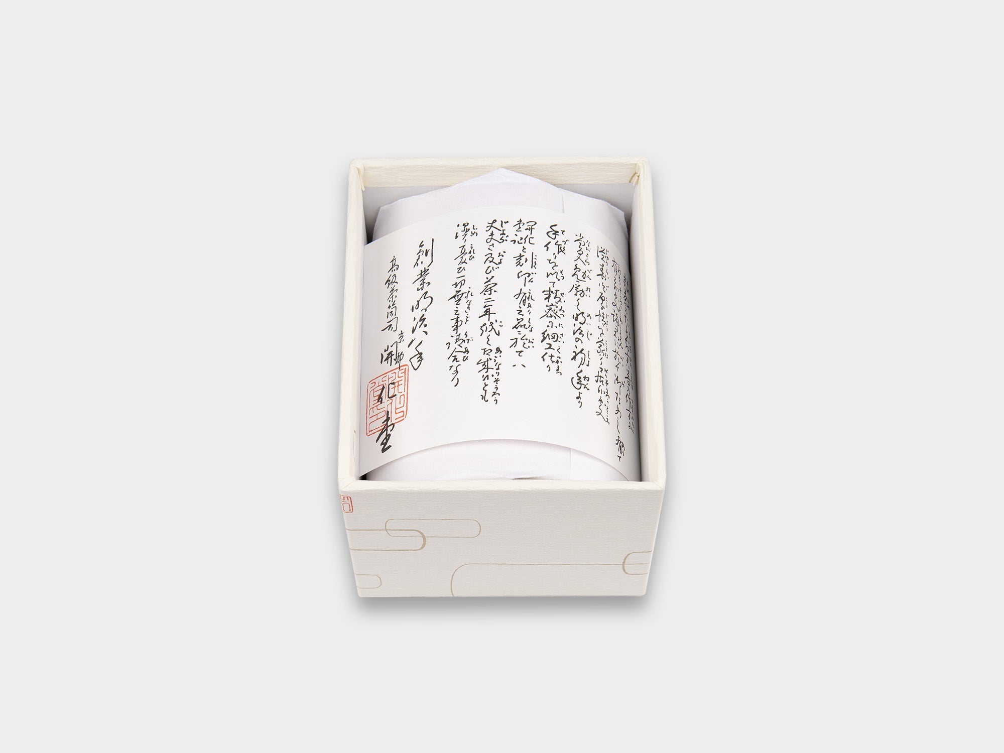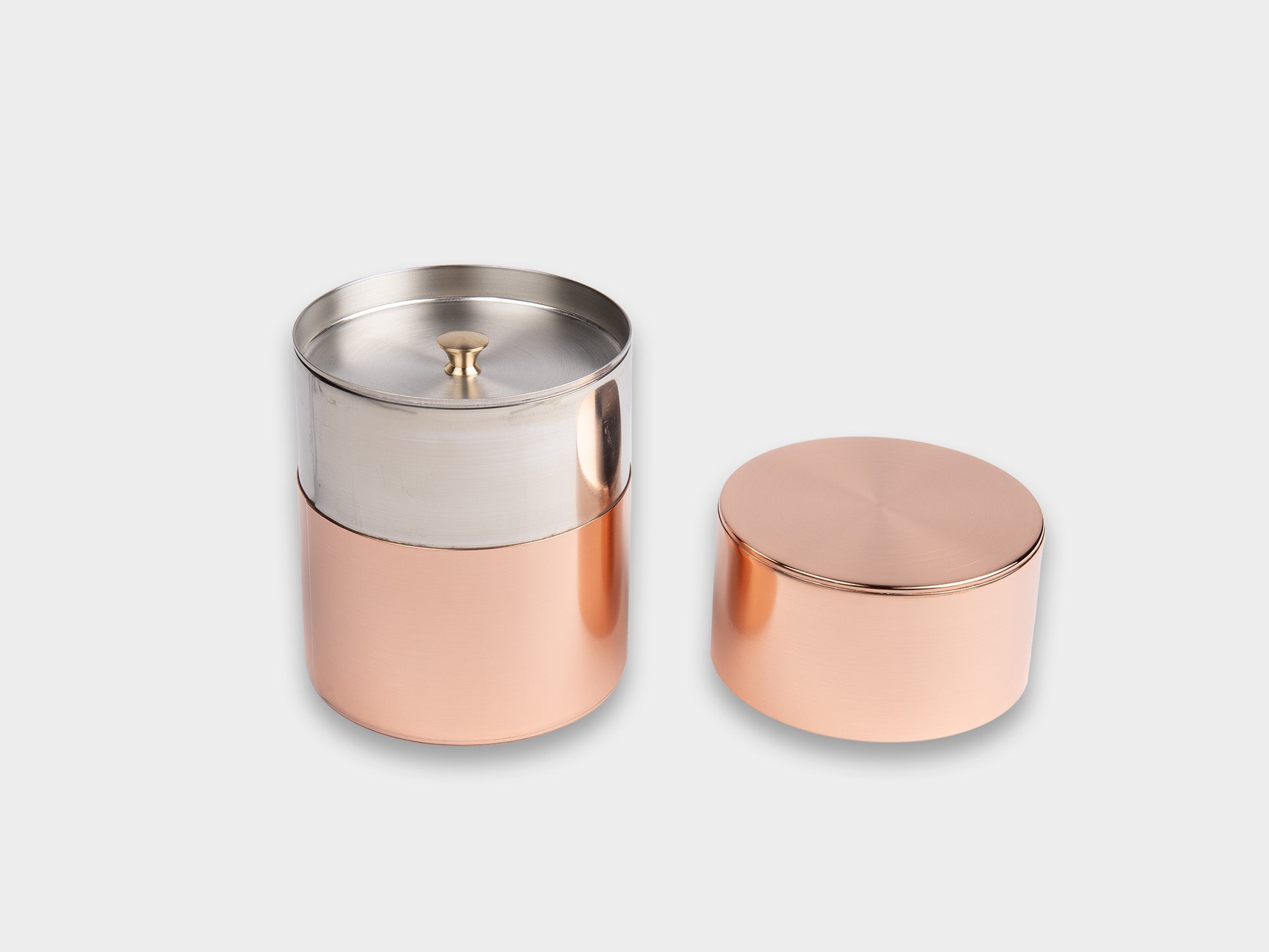 +A cylindrical shaped airtight container used to store tea and other dry food products. The process of making a Chazutsu includes 130 steps; the lid is delicately lined up with the body so that when placed on it sinks slowly, sealing the caddy by expelling the remaining air. Made with a double structure; a copper outer layer and tinplate inner layer. The tin is made using a traditional manufacturing method called ‘dobozuke’, which gives it its matte finish. It is designed to gradually change colour over the duration of its life.