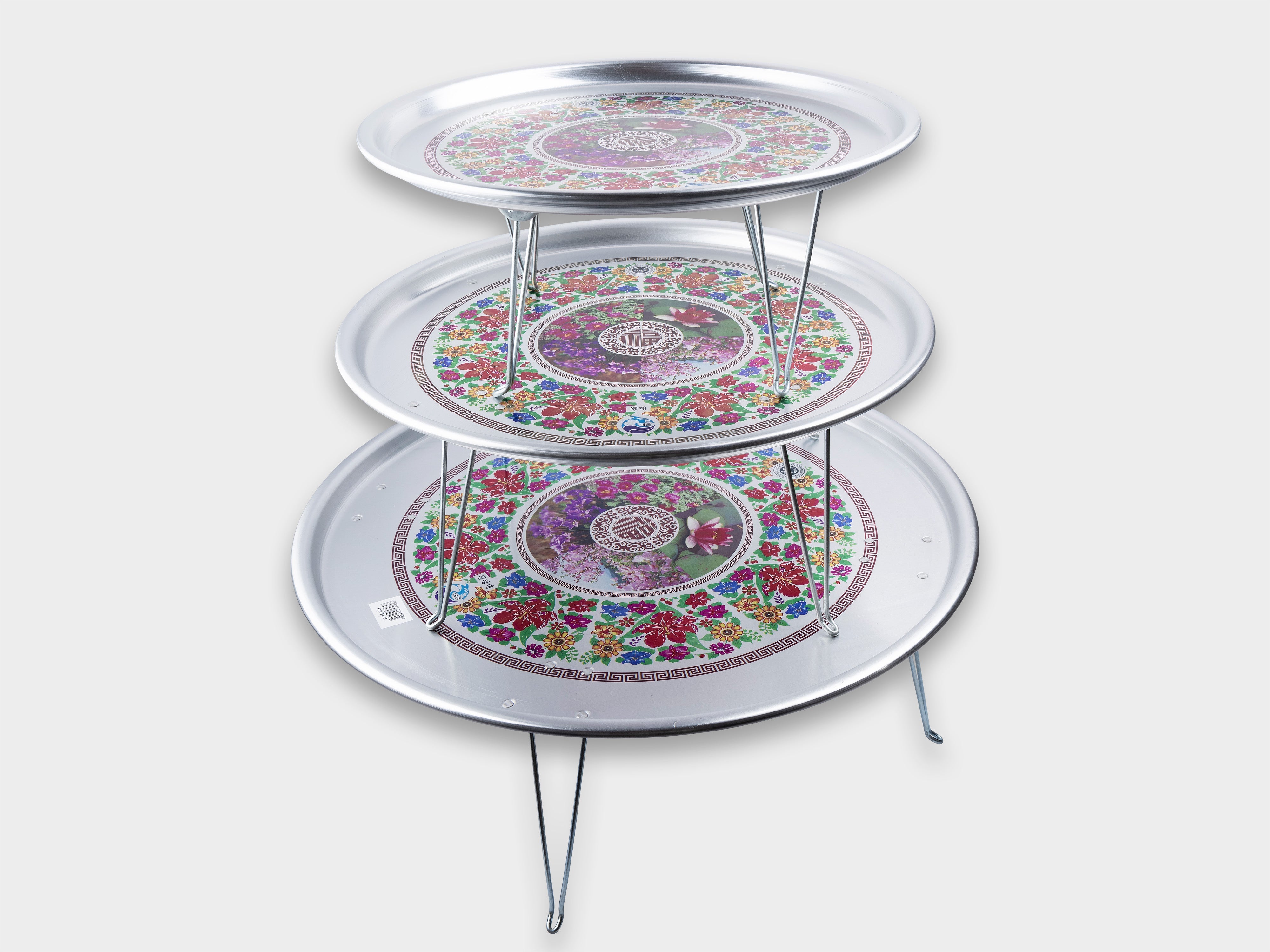 +A large aluminium tray for condiments with a printed motif. These are an ancient tool for serving food in Korea. They grow more beautiful with age and use. This particular version has folding metal legs which allow it to stand taller and save tabletop space.