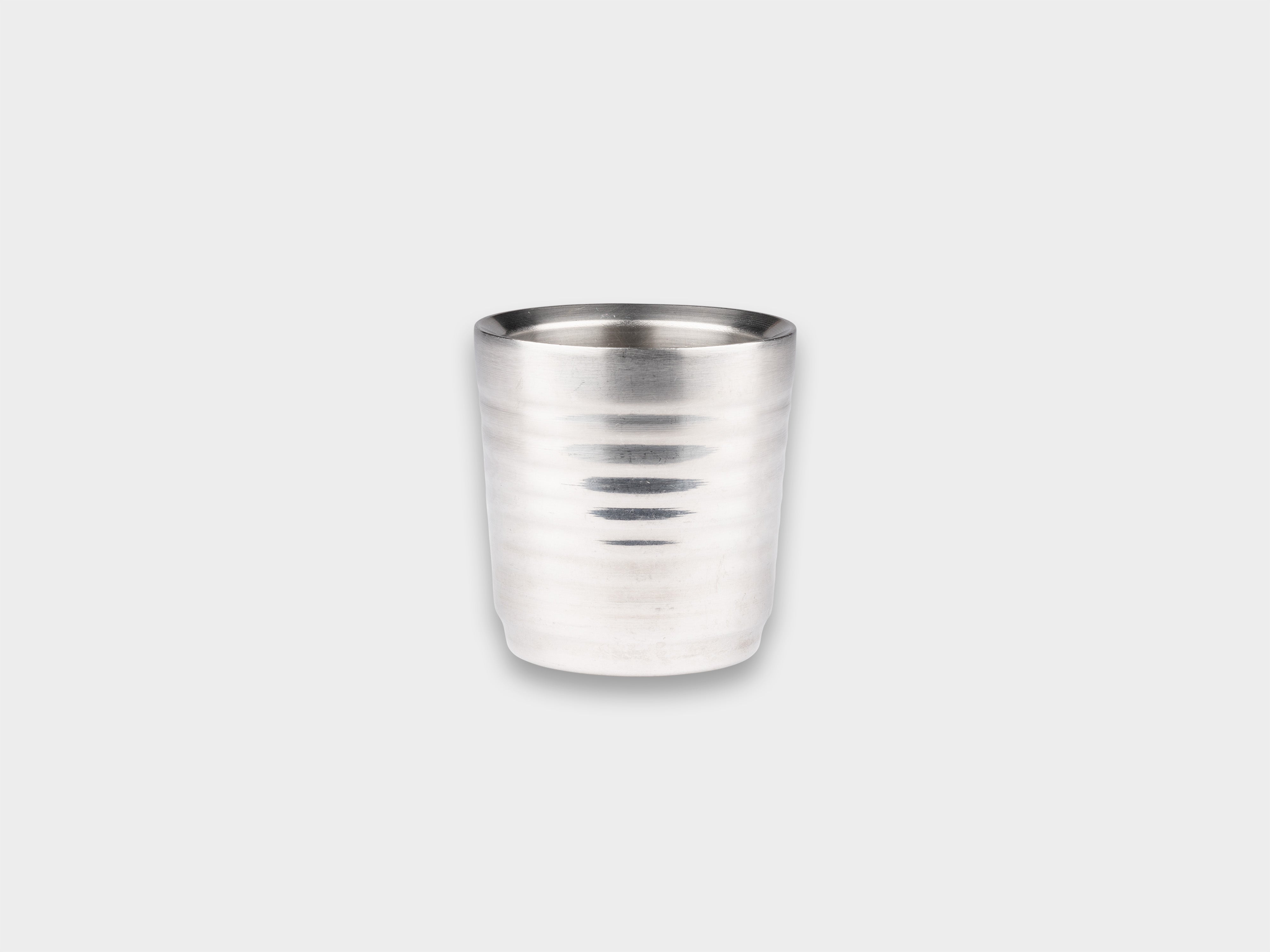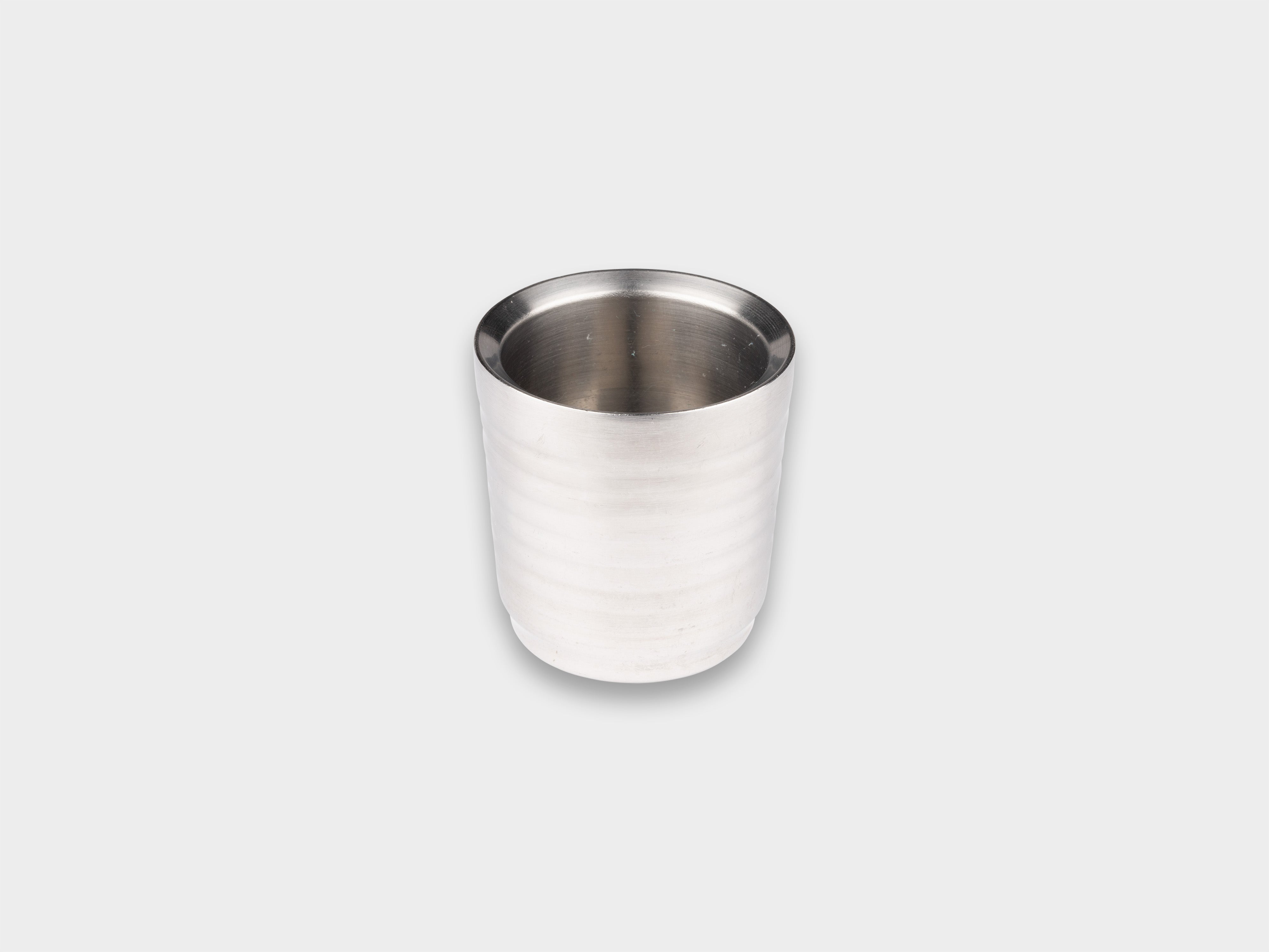 +Unusual stacking stainless steel drinking cup used for hot or cold beverages. Double wall insulated construction. Used-condition / showing some signs of wear. Variation may exist between each item.
