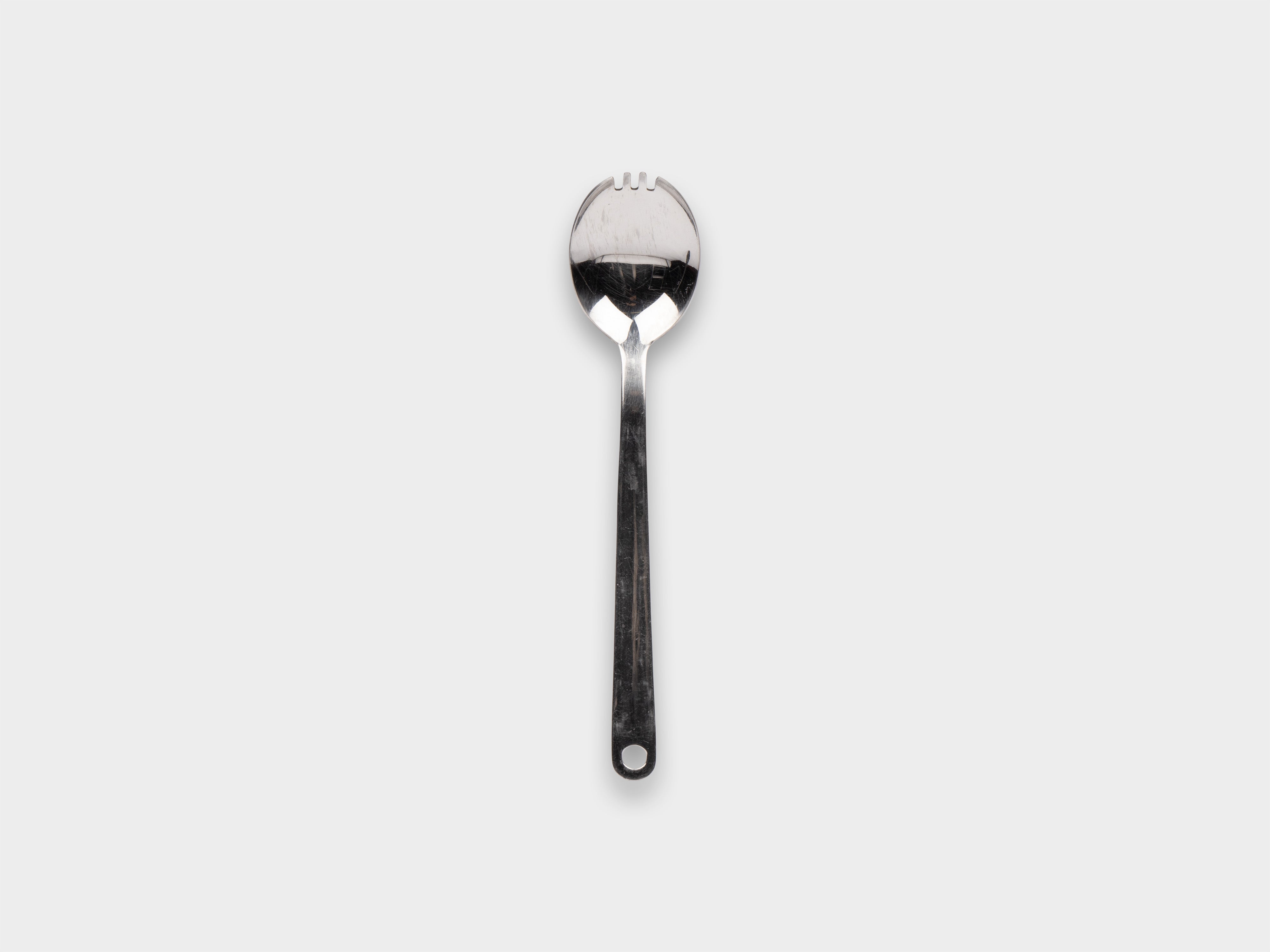 +Stainless steel utensil combining characteristics of the fork and the spoon. Used-condition / showing some signs of wear. Variation may exist between each item.