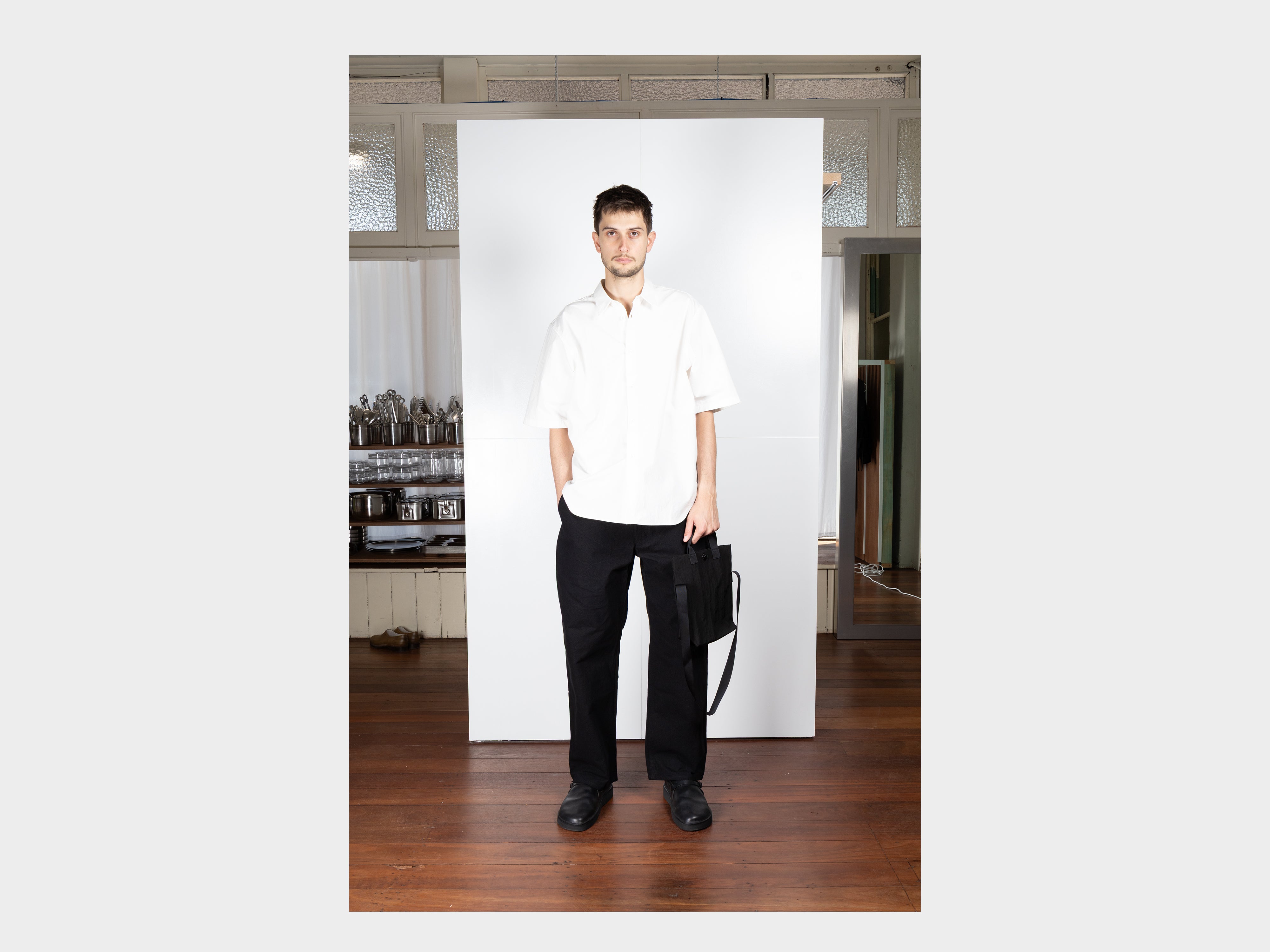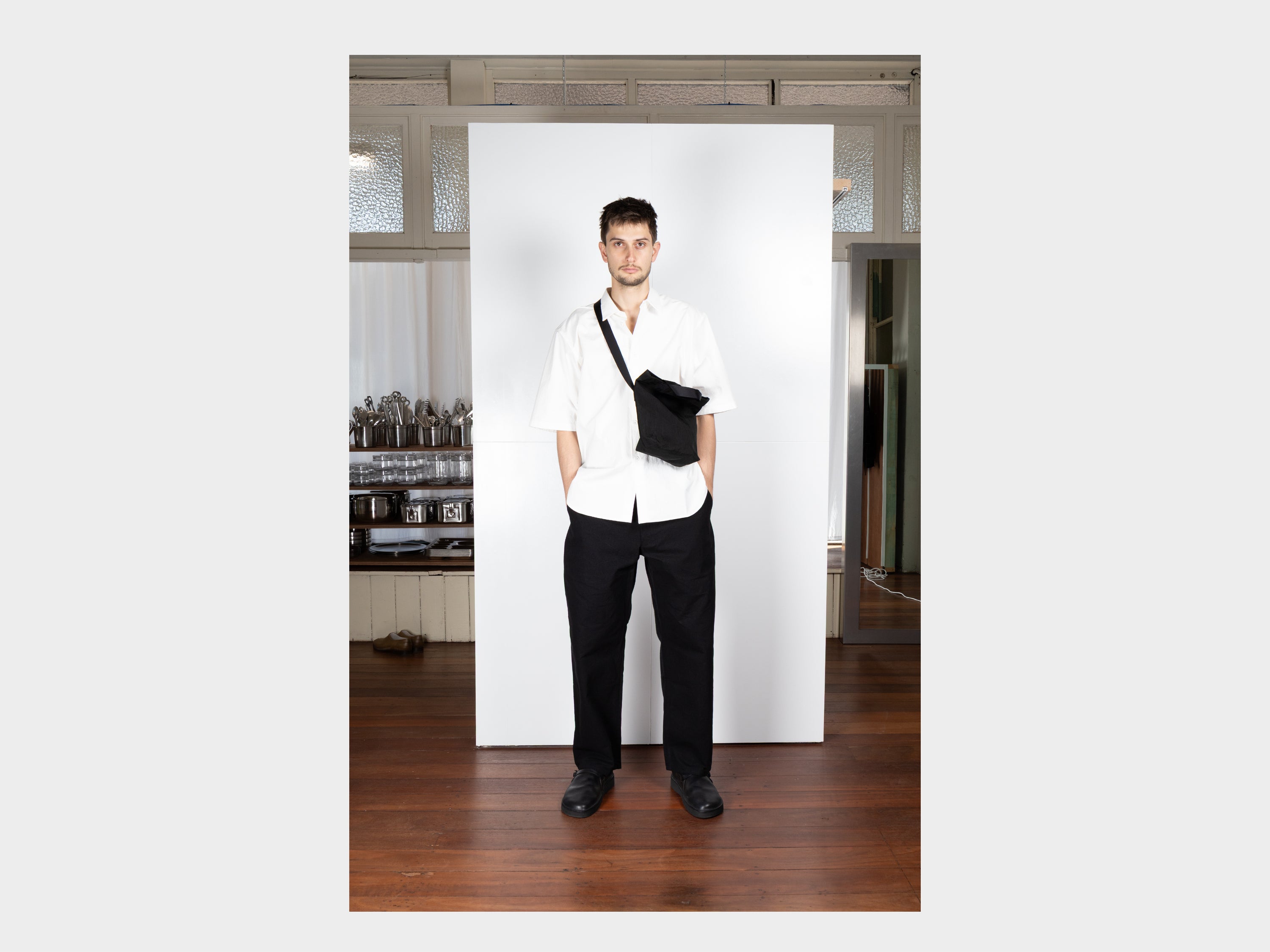 Half-size version of our original B1. Fold-over mini tote with snap hardware closure, two short handles, and single long shoulder strap designed to be worn crossbody. Made in Japan.