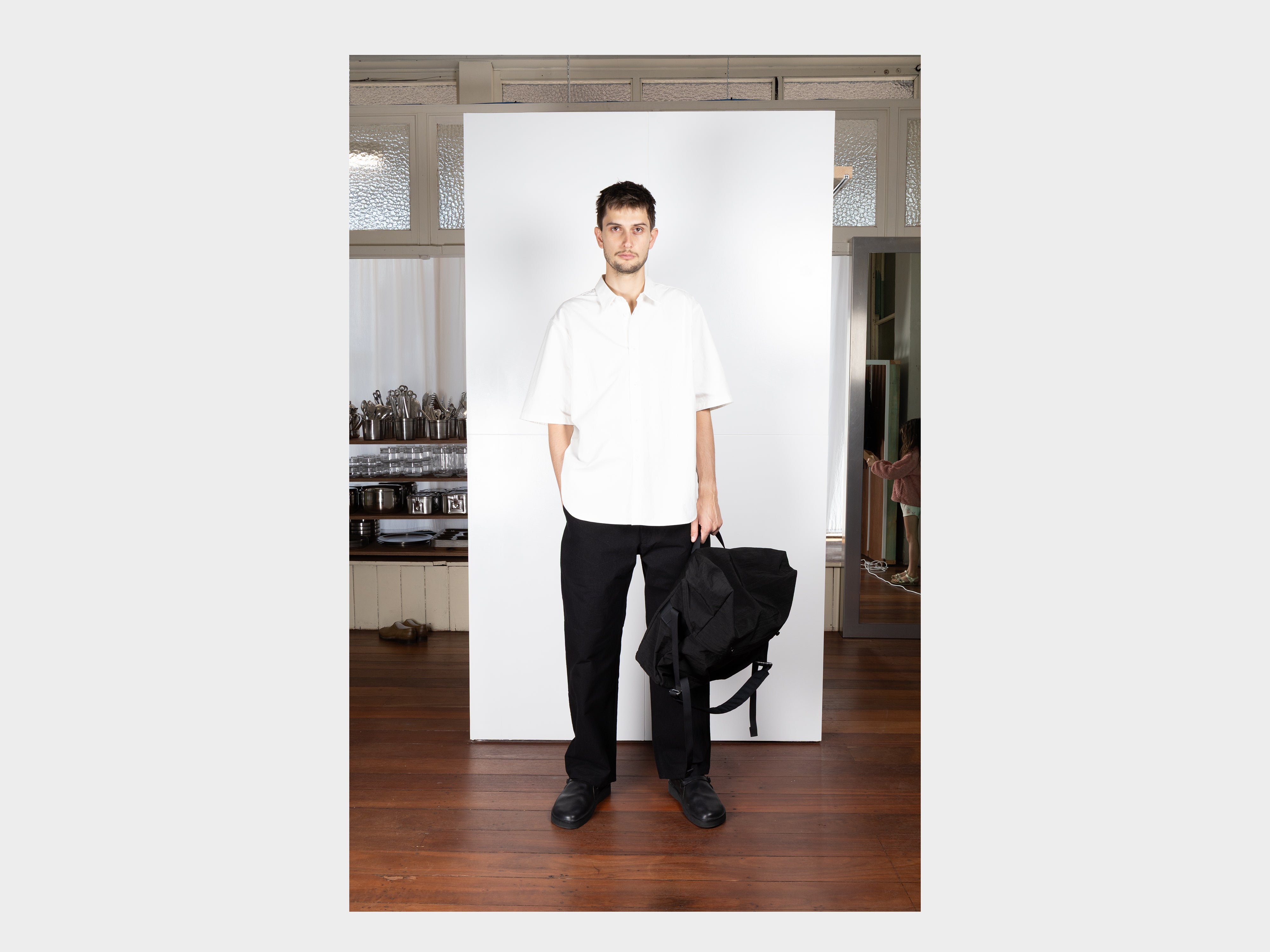 +Heat-treated compressed 100% nylon. Midweight and water-resistant, this fabric will become soft in humid conditions and remain stiff in dry conditions. Woven and finished for MAN-TLE in Fukui, Japan.