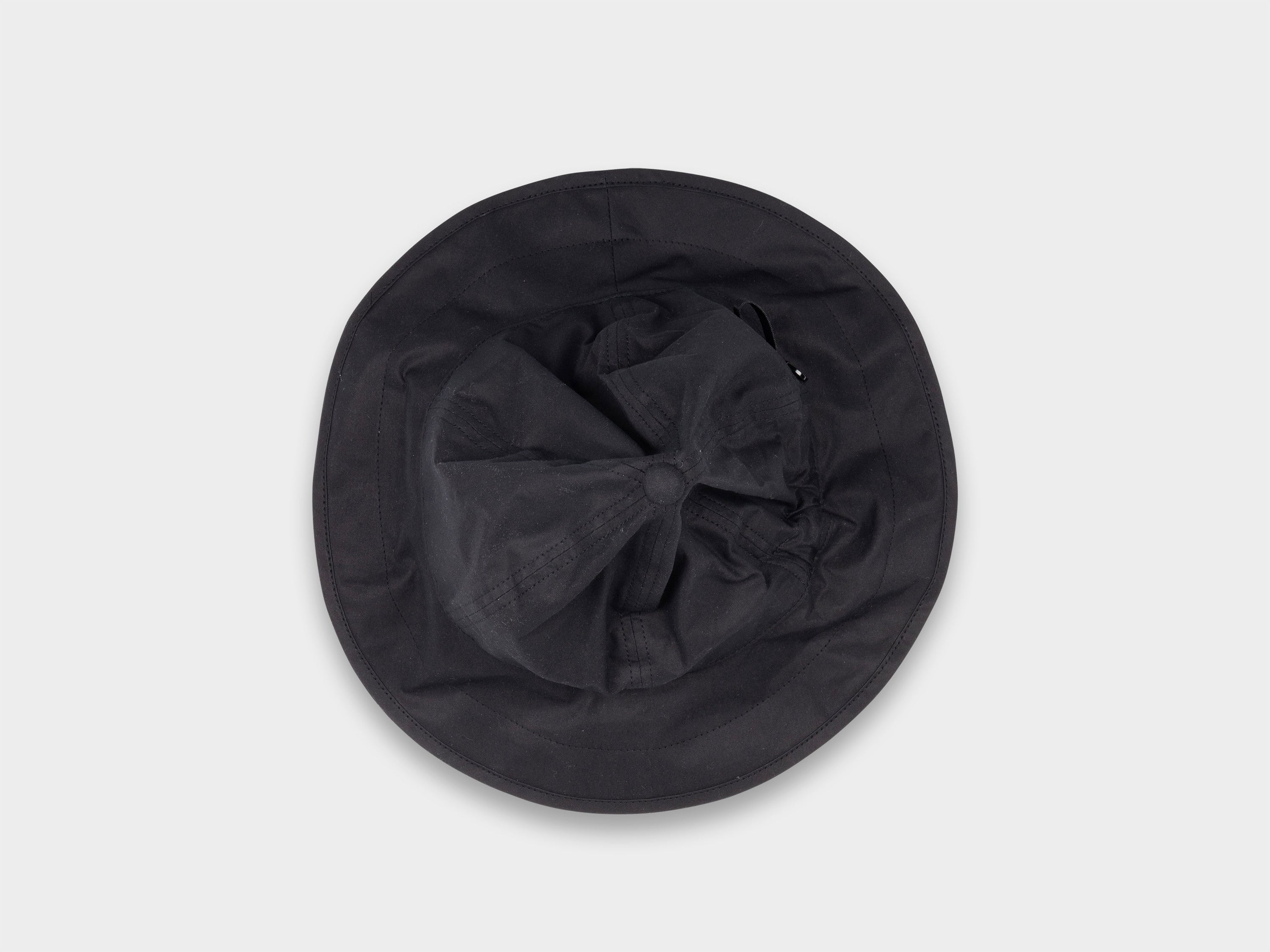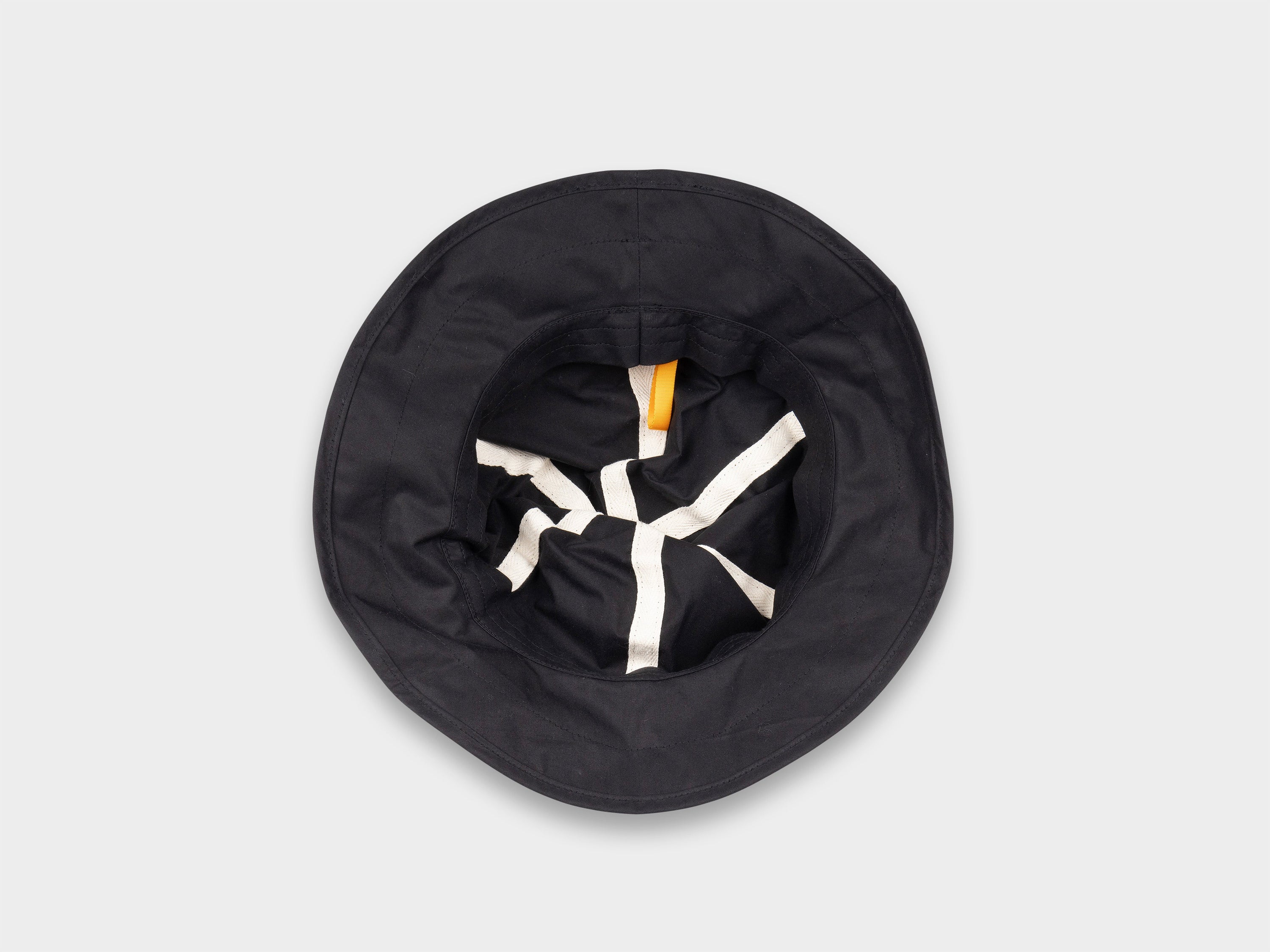 +Deep-cut six panel brim hat. Slot button threaded onto seatbelt tape, used to adjust size. Cinch to distort shape. Made in Japan.