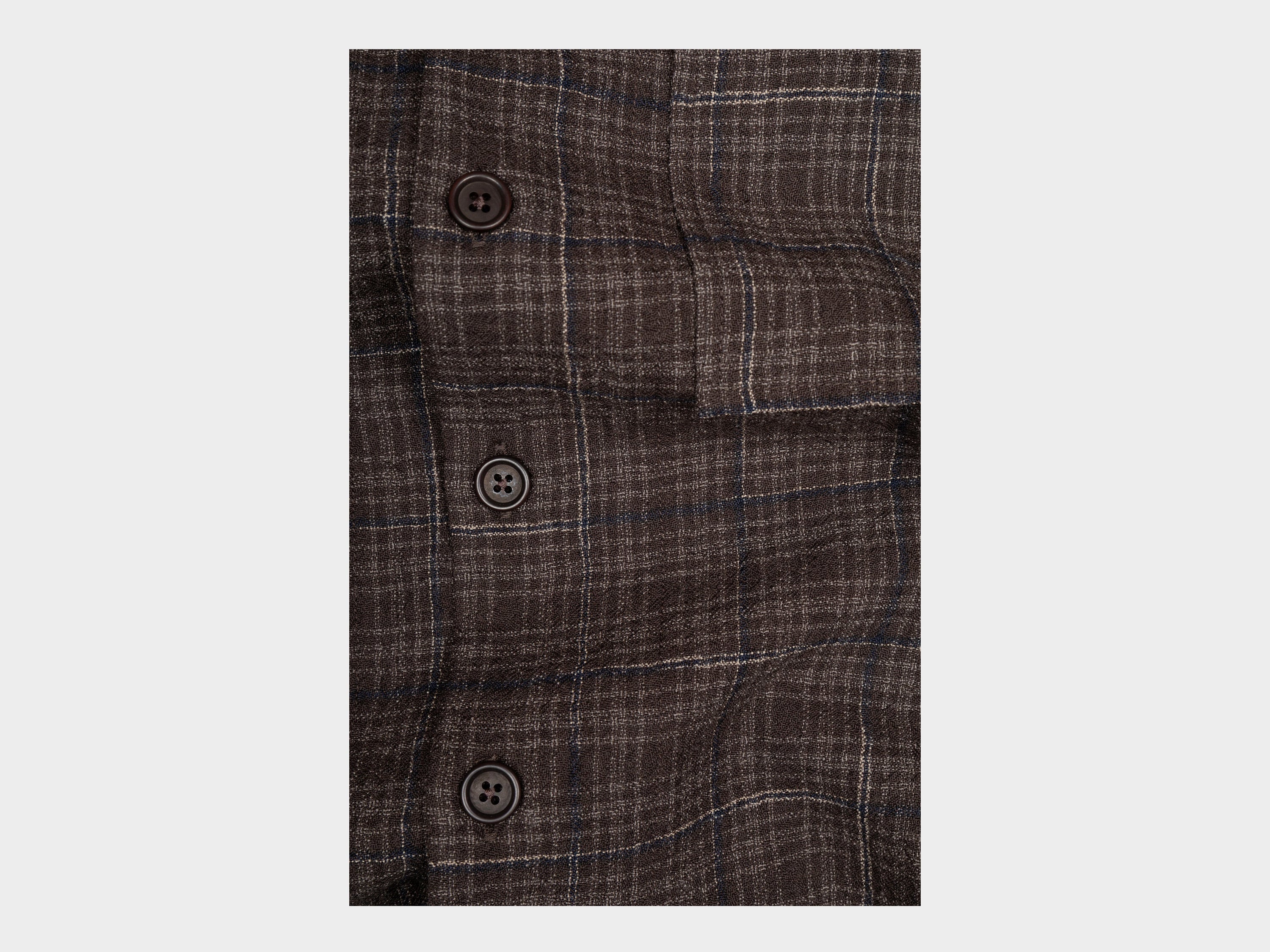 +Yarn dyed kasuri worsted wool check originally developed in the 1990’s by a legendary textile designer based in Ichinomiya, Japan. Beginning with Australian merino wool, the kasuri (ikat) dye process results in an irregular check pattern, woven loosely with a gauze structure, then washed to tighten the weave for a puckered texture. The result is an airy, light weight worsted wool with a very dry hand. A transitional three season cloth.