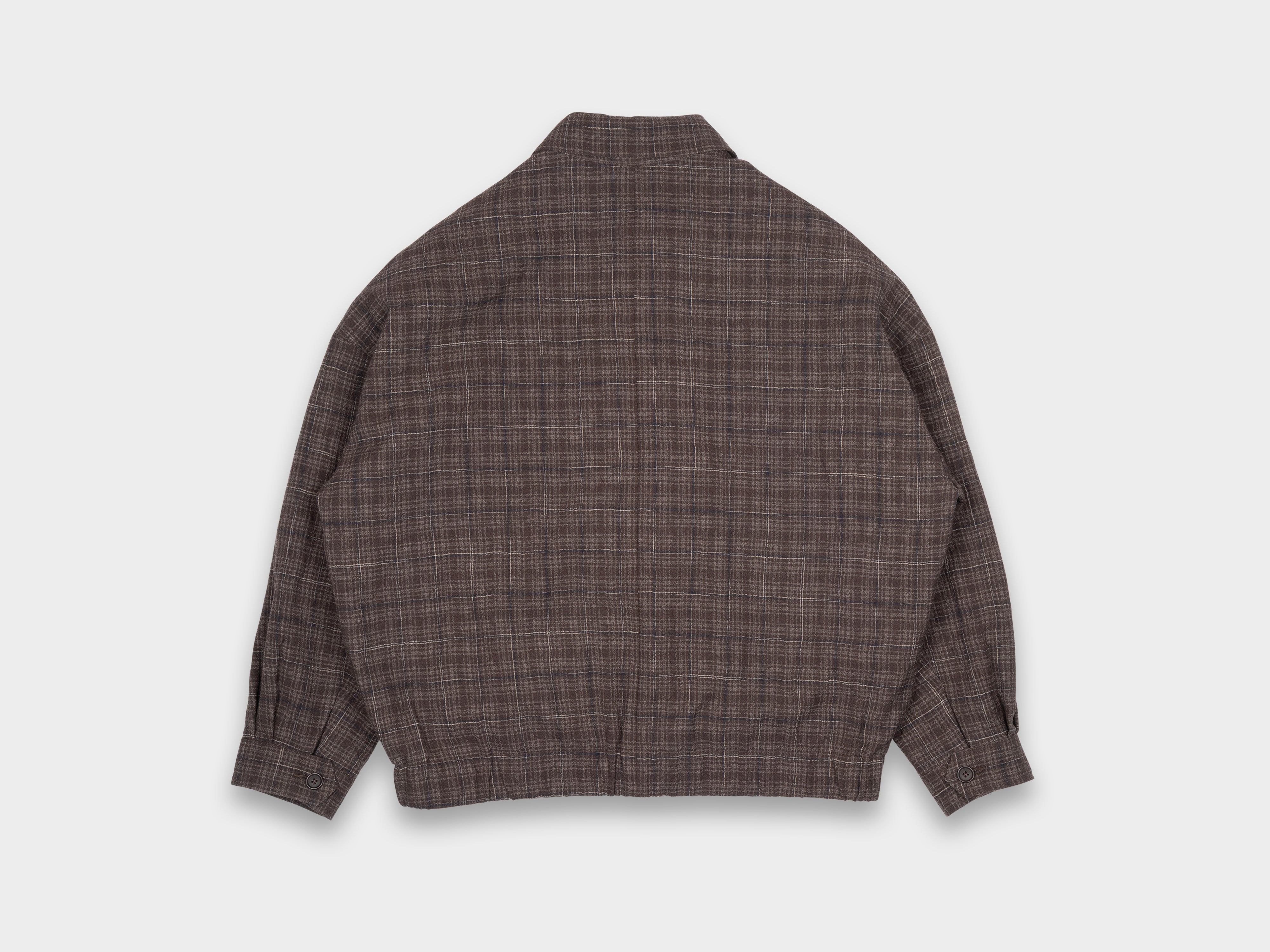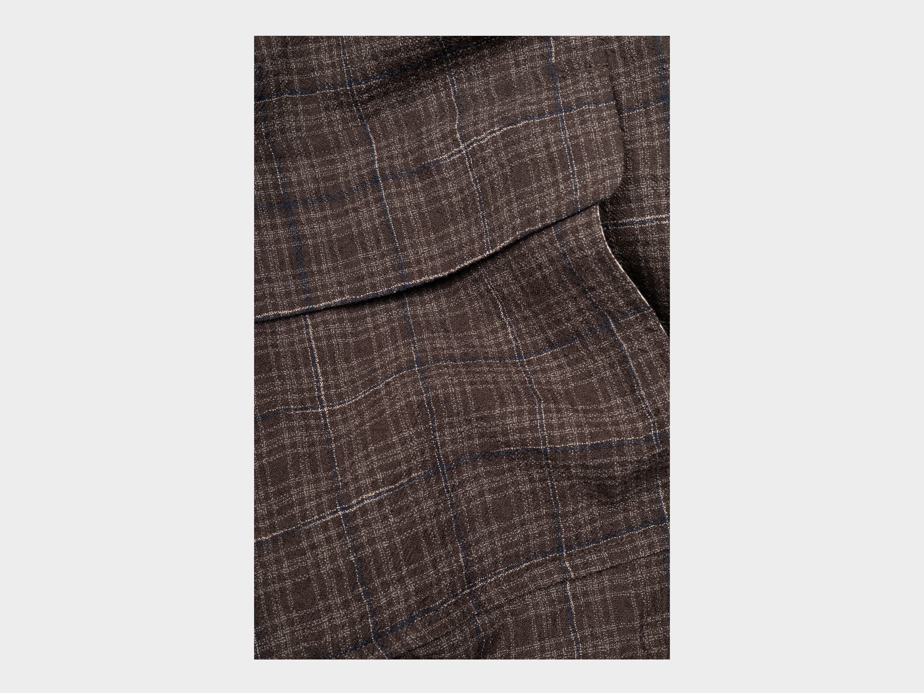 +Yarn dyed kasuri worsted wool check originally developed in the 1990’s by a legendary textile designer based in Ichinomiya, Japan. Beginning with Australian merino wool, the kasuri (ikat) dye process results in an irregular check pattern, woven loosely with a gauze structure, then washed to tighten the weave for a puckered texture. The result is an airy, light weight worsted wool with a very dry hand. A transitional three season cloth.