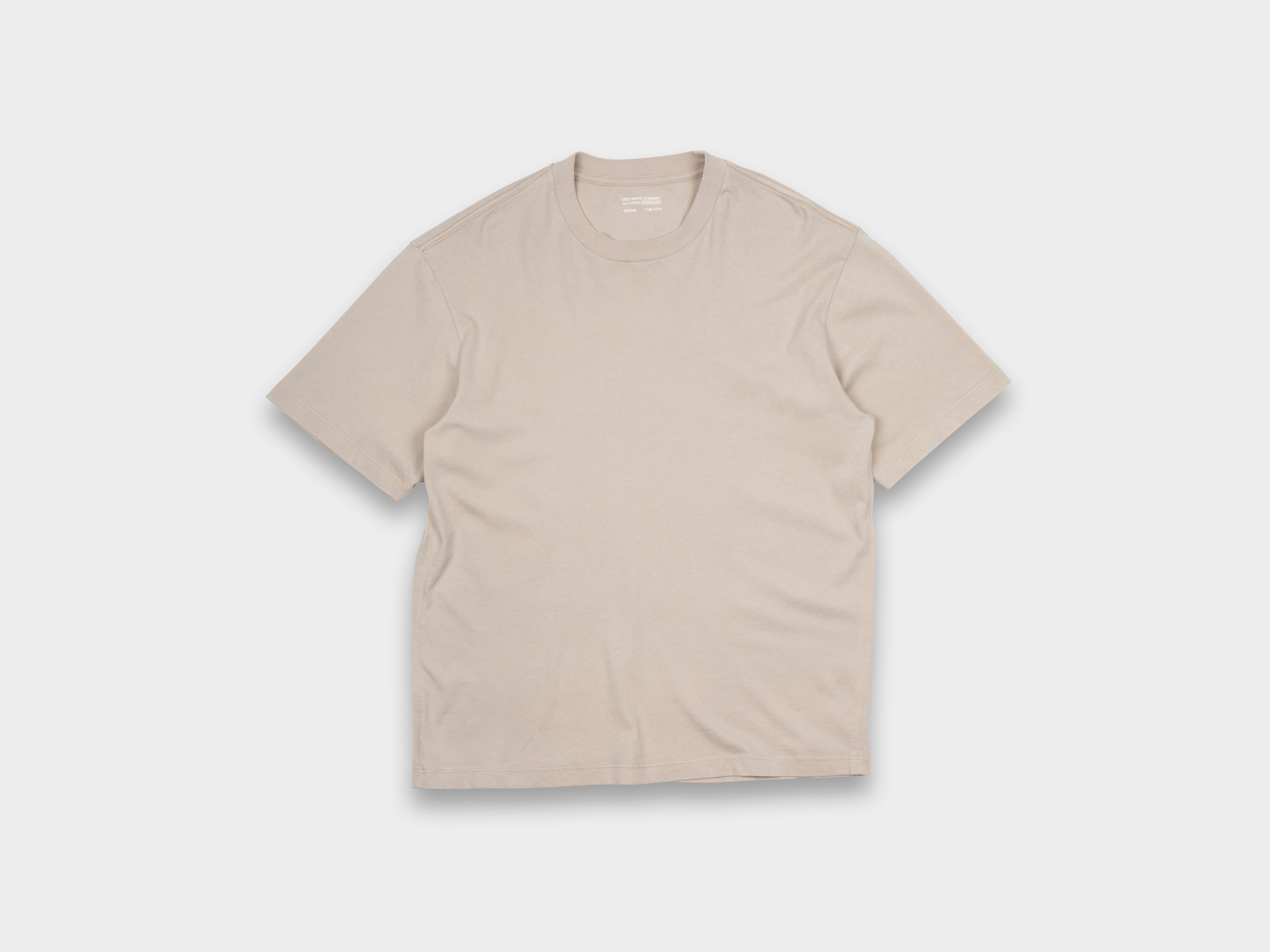 The lightest t-shirt in the Lady White Co. range. Made from custom knit jersey with a slight drape, this t-shirt is a boxy, wide fit and has a high neckline. Made in Los Angeles.