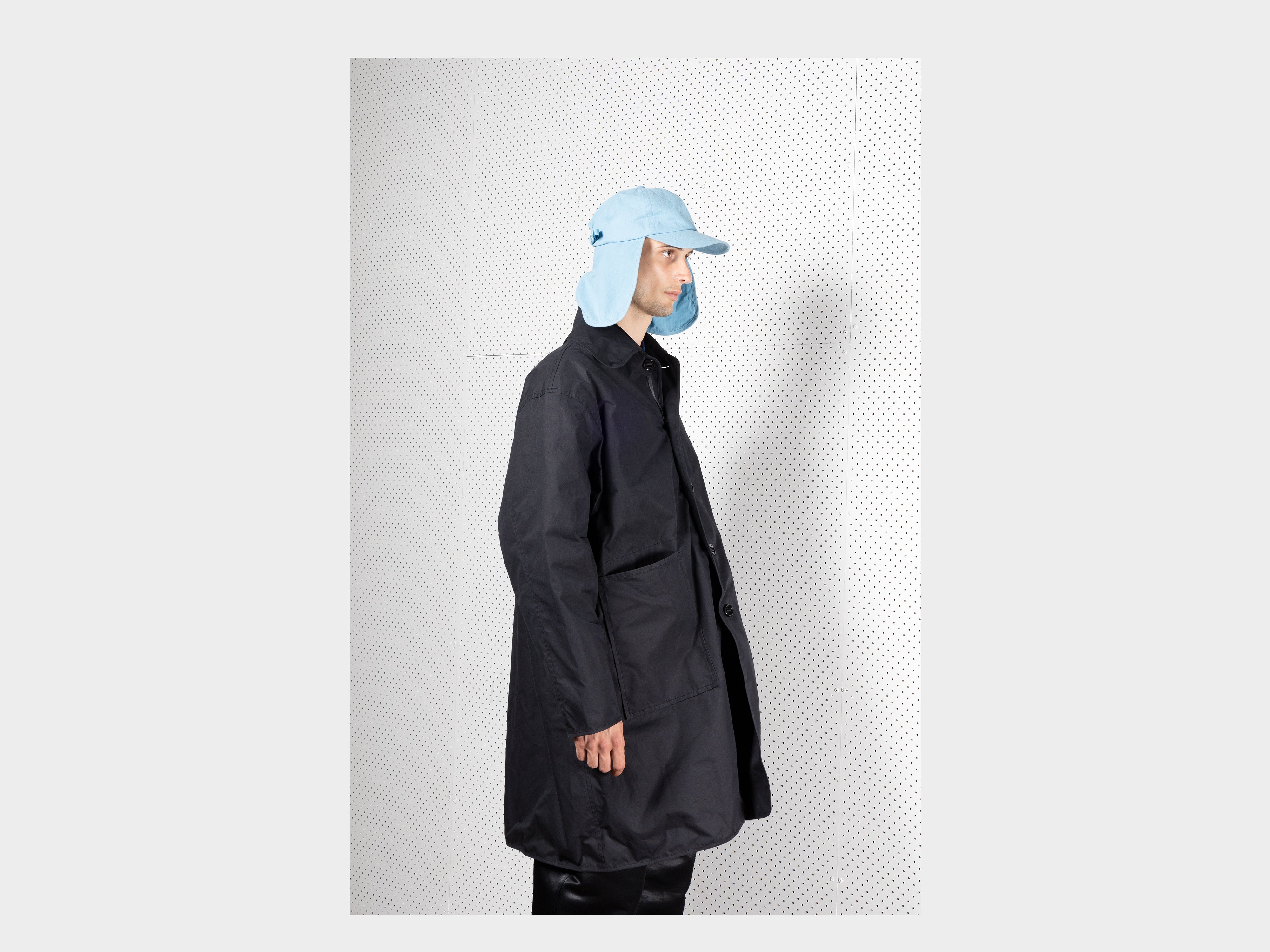 Variation on C3 "Deep Cap" with added sun-flap to protect neck and ears. Slot button threaded onto seatbelt tape, used to adjust size. Made in Japan.