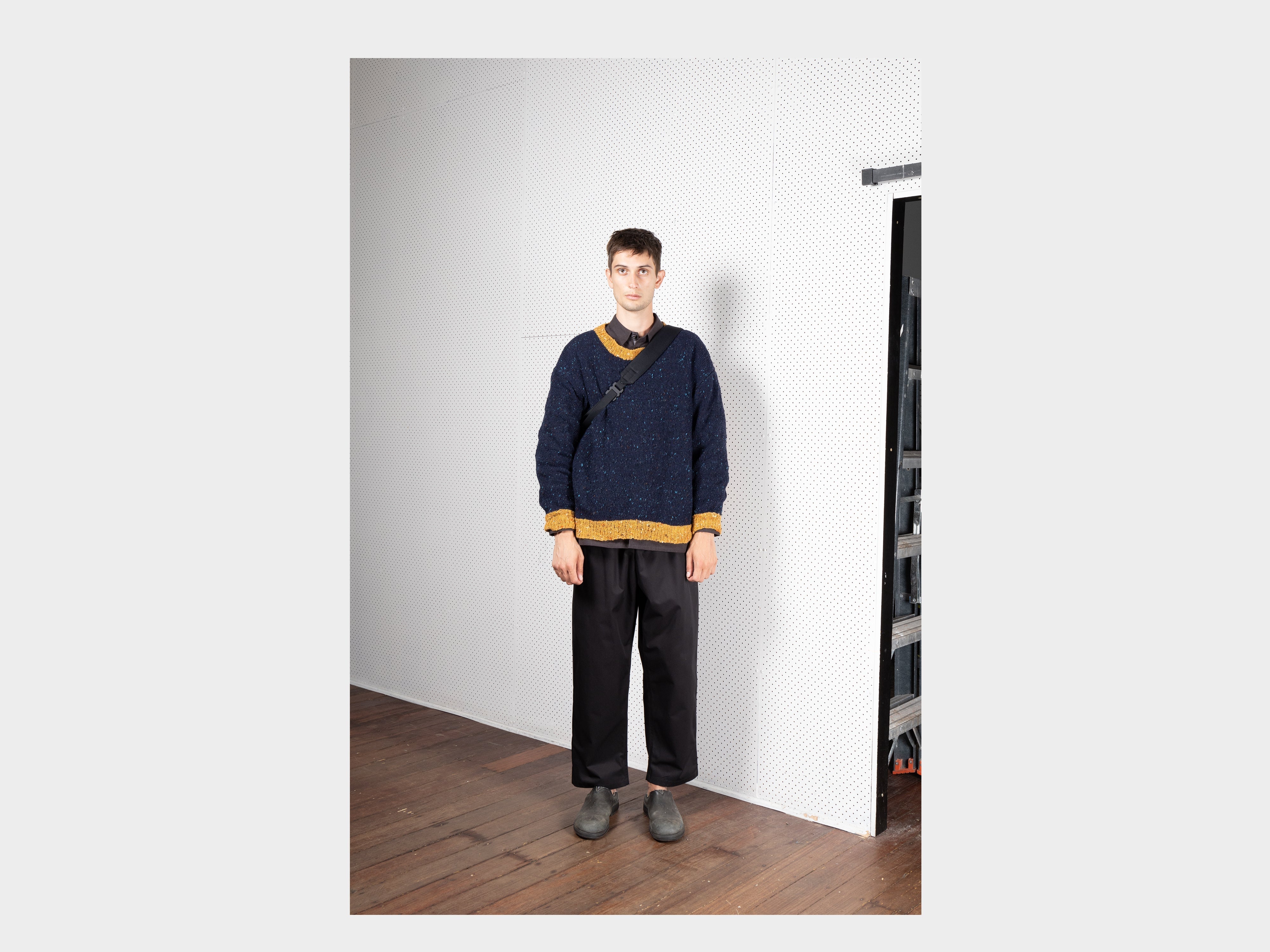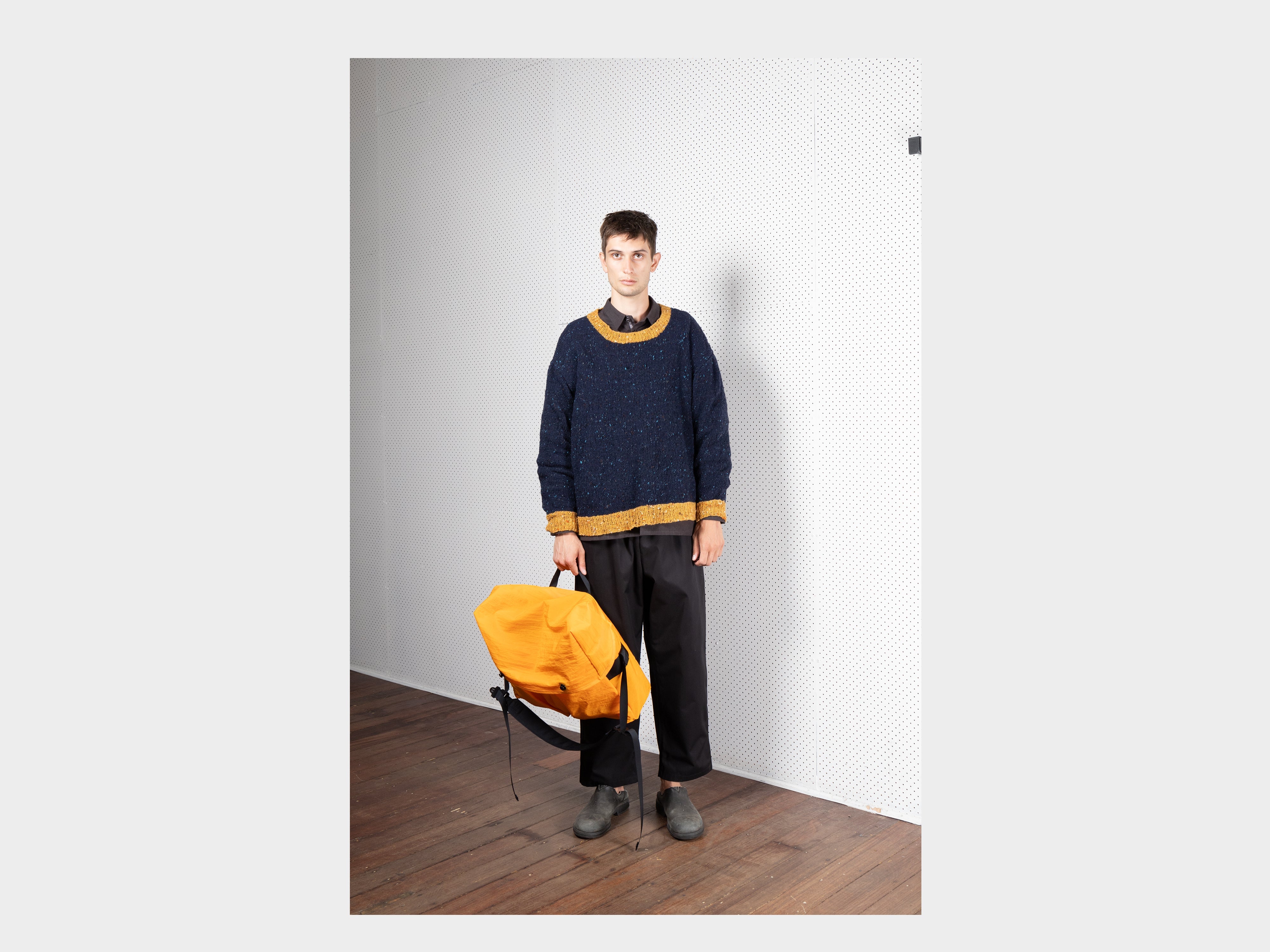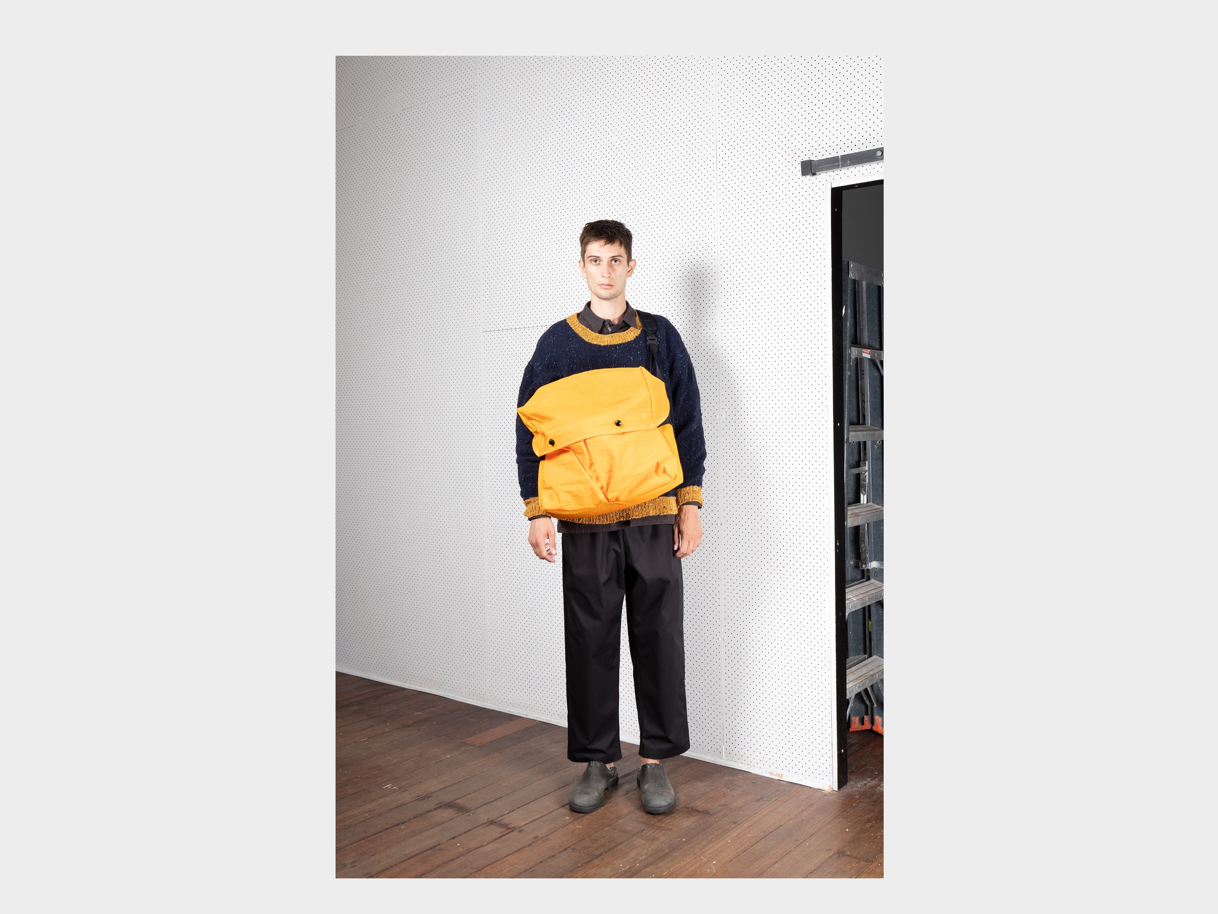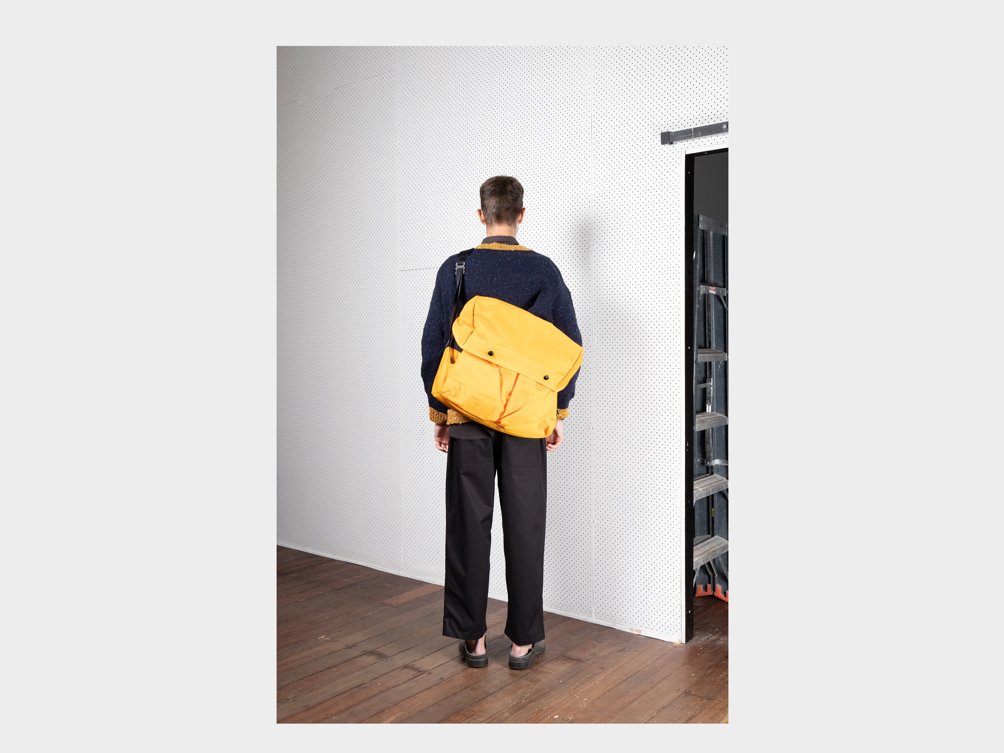 +Crossbody messenger bag made in collaboration with designer Rikiya Matsumura, based on a Royal Mail delivery bag. Spacious main compartment with an internal padded laptop sleeve, front bellow pockets, and a high-density strap with a shoulder pad. Features MAN-TLE signature hardware – uncoated brass snap closure made for MAN-TLE in Germany and a Jotun powder-coated aluminum strap slider, laser-cut for MAN-TLE in Australia. Bag made in Japan.