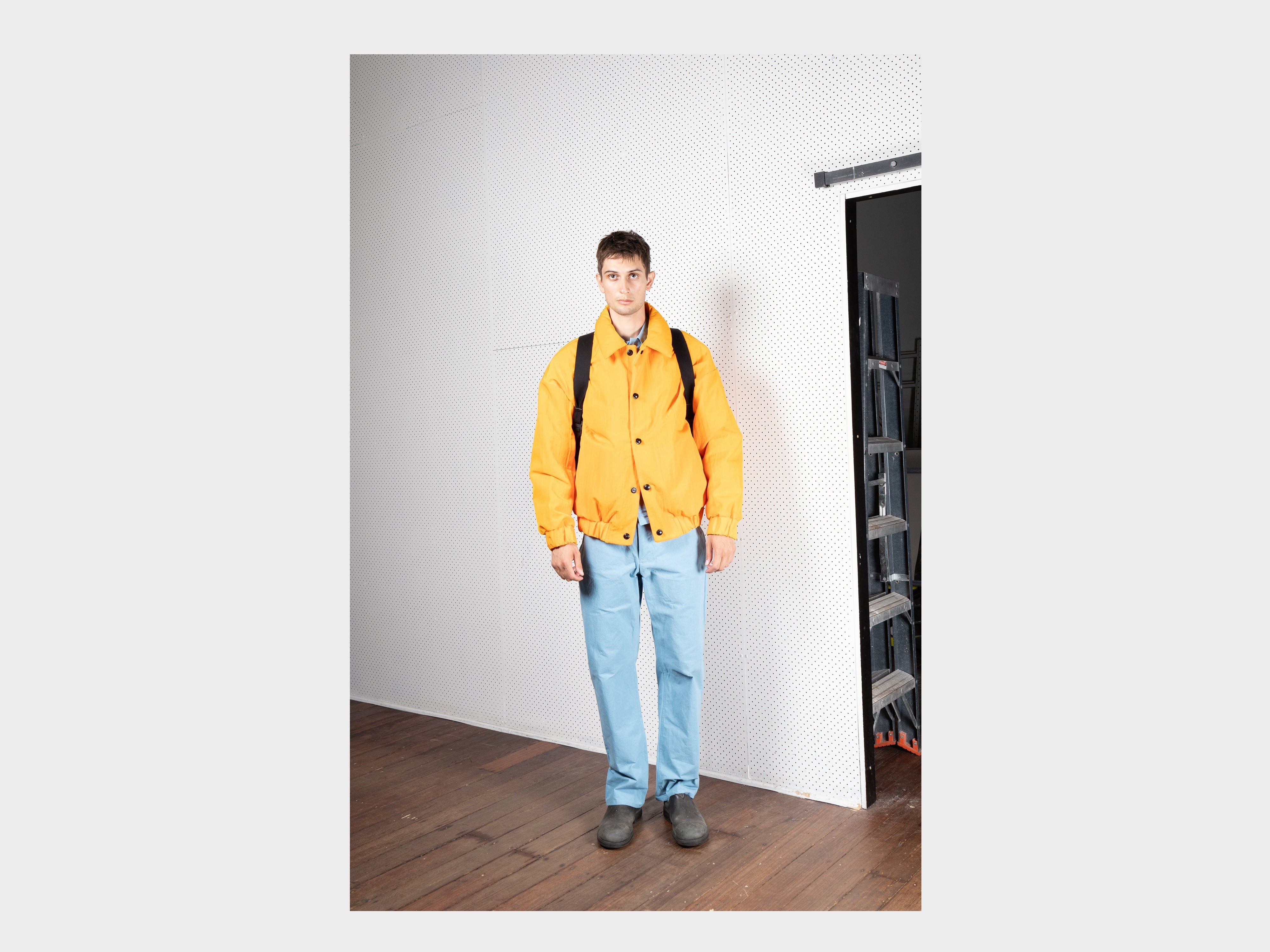 +Heat-treated compressed 100% nylon. Midweight and water-resistant, this fabric will become soft in humid conditions and remain stiff in dry conditions. Woven and finished for MAN-TLE in Fukui, Japan.