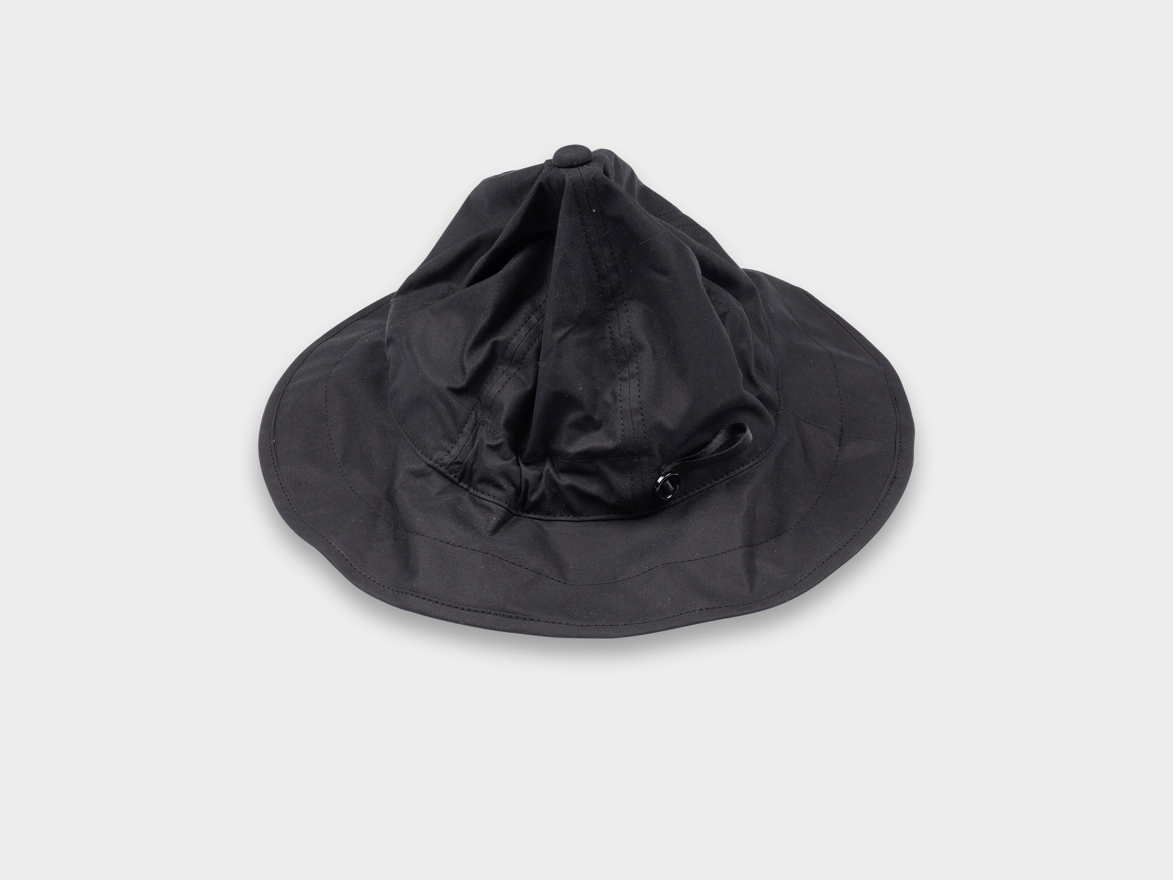 +Deep-cut six panel brim hat. Slot button threaded onto seatbelt tape, used to adjust size. Cinch to distort shape. Made in Japan.