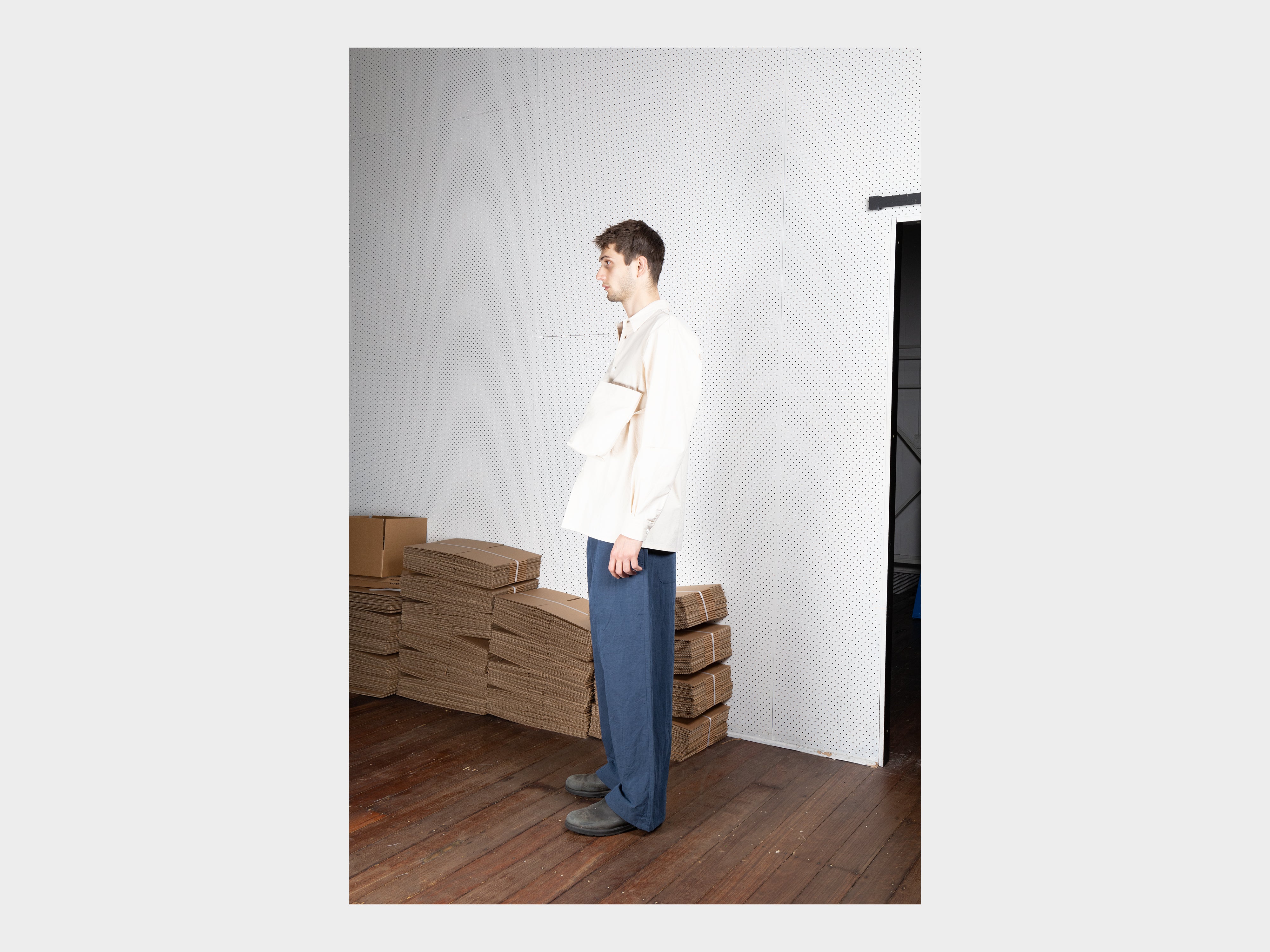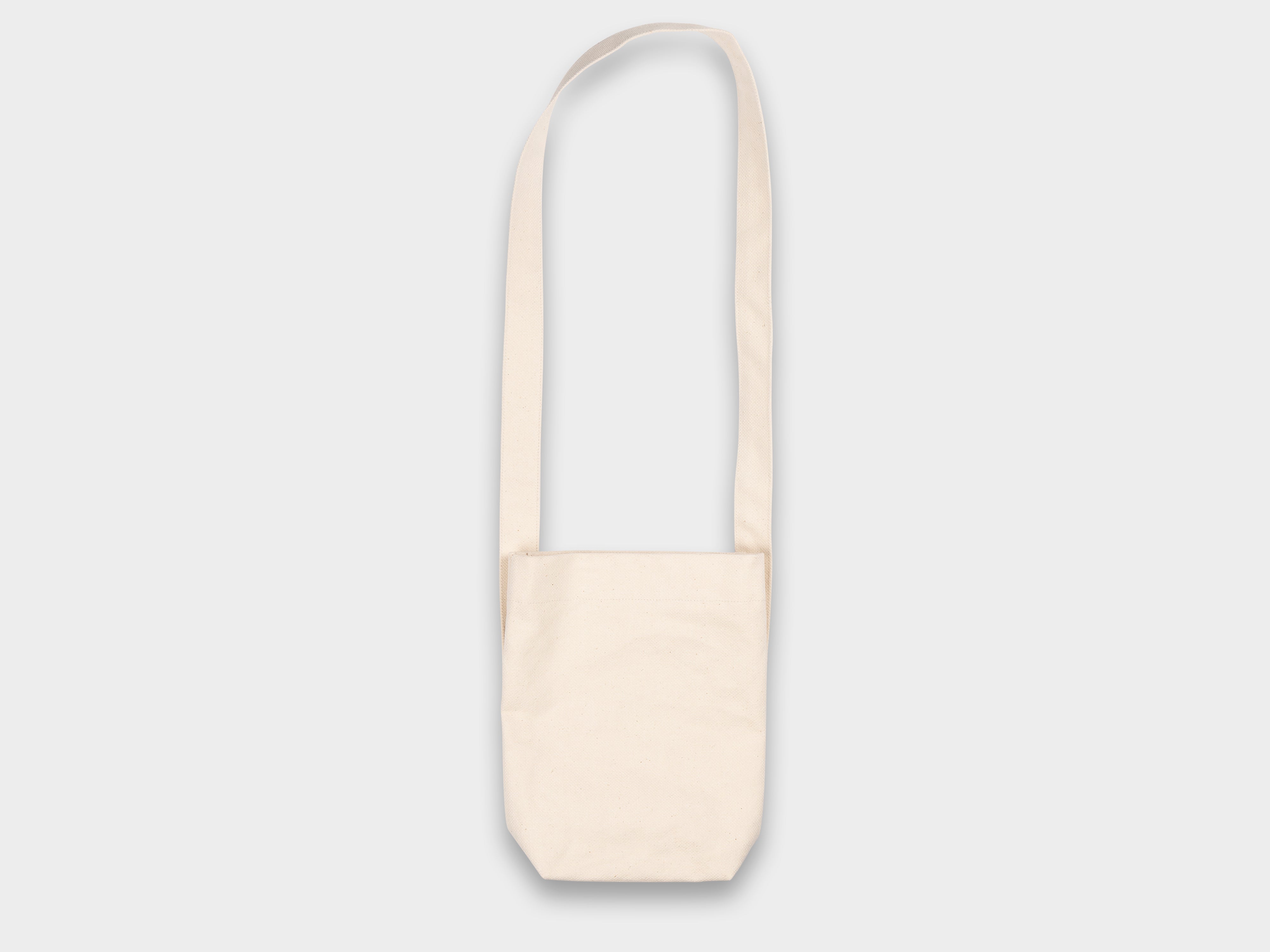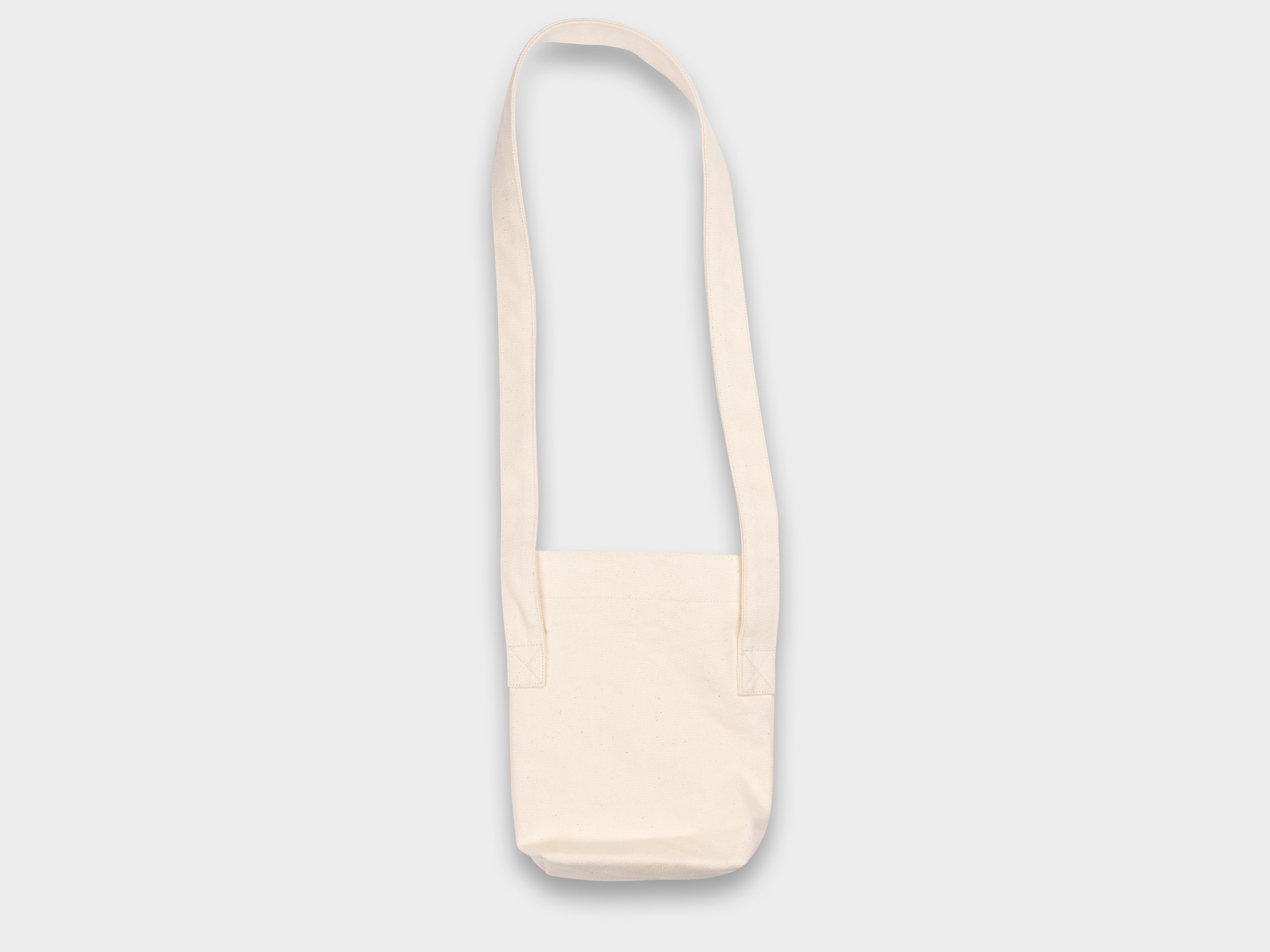 Mini tote with a single long strap, from our collaboration with Shinji Sekizuka of Iwakura AA. Unbleached cotton canvas MAN–TLE products, stocked at Iwakura AA, were offered custom dyeing at the iconic mudworks Kanai Kougei. This is an original, undyed B3 made for the collaboration. Designed to be worn cross body. Made in Japan.