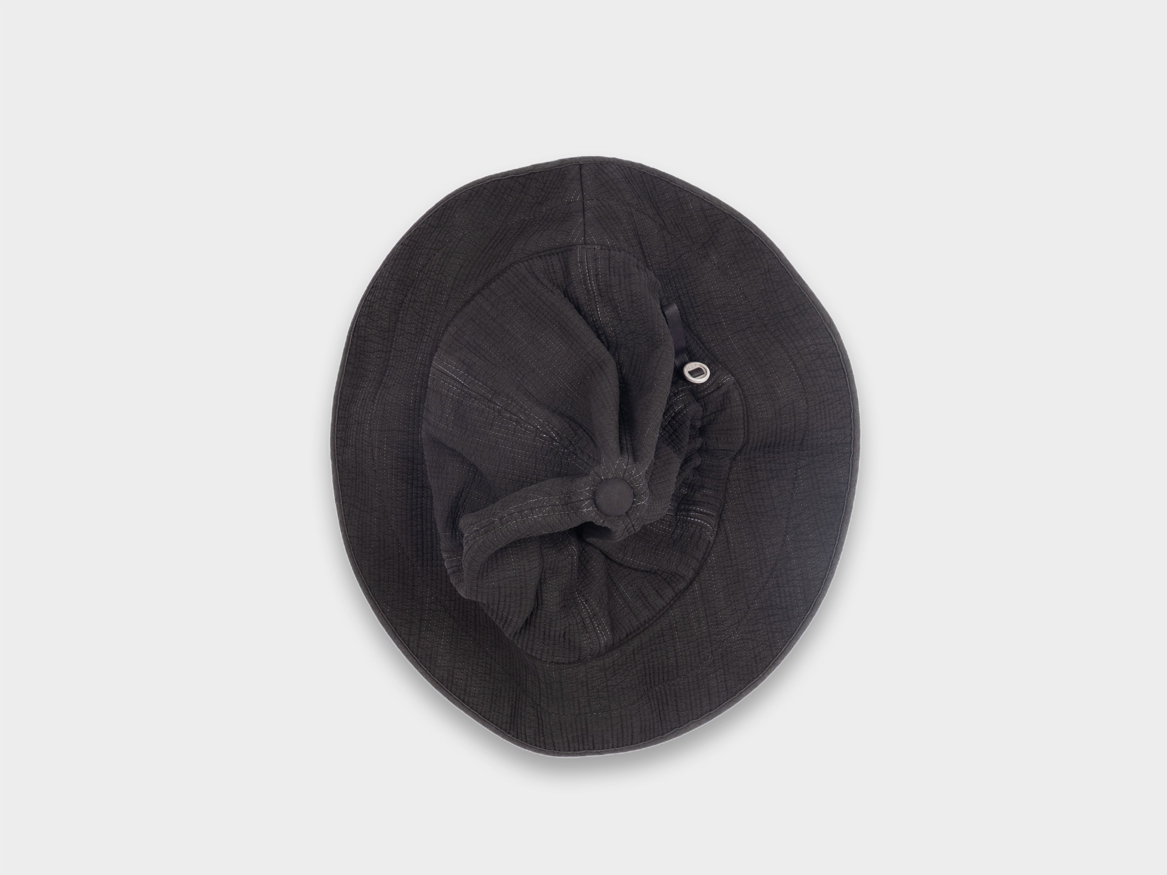 Deep-cut six panel brim hat. Slot button threaded onto seatbelt tape, used to adjust size. Cinch to distort shape. Dyeing commissioned to iconic mud works Kanai Kougei, based in Amami-Ōshima. Master craftsman Yukihito Kanai works to preserve ancient Dorozome techniques of the island using materials within reach. Made in Japan.
