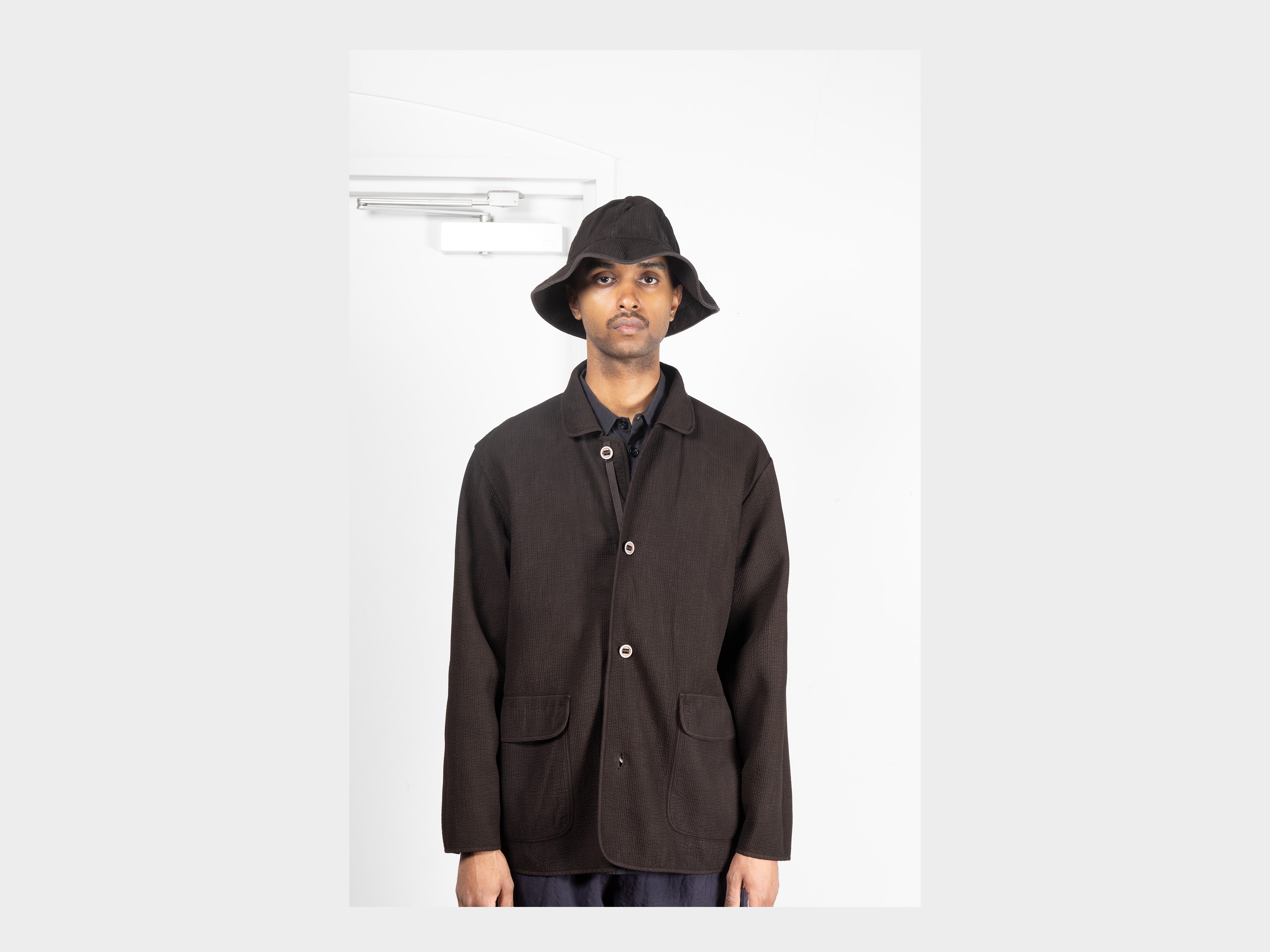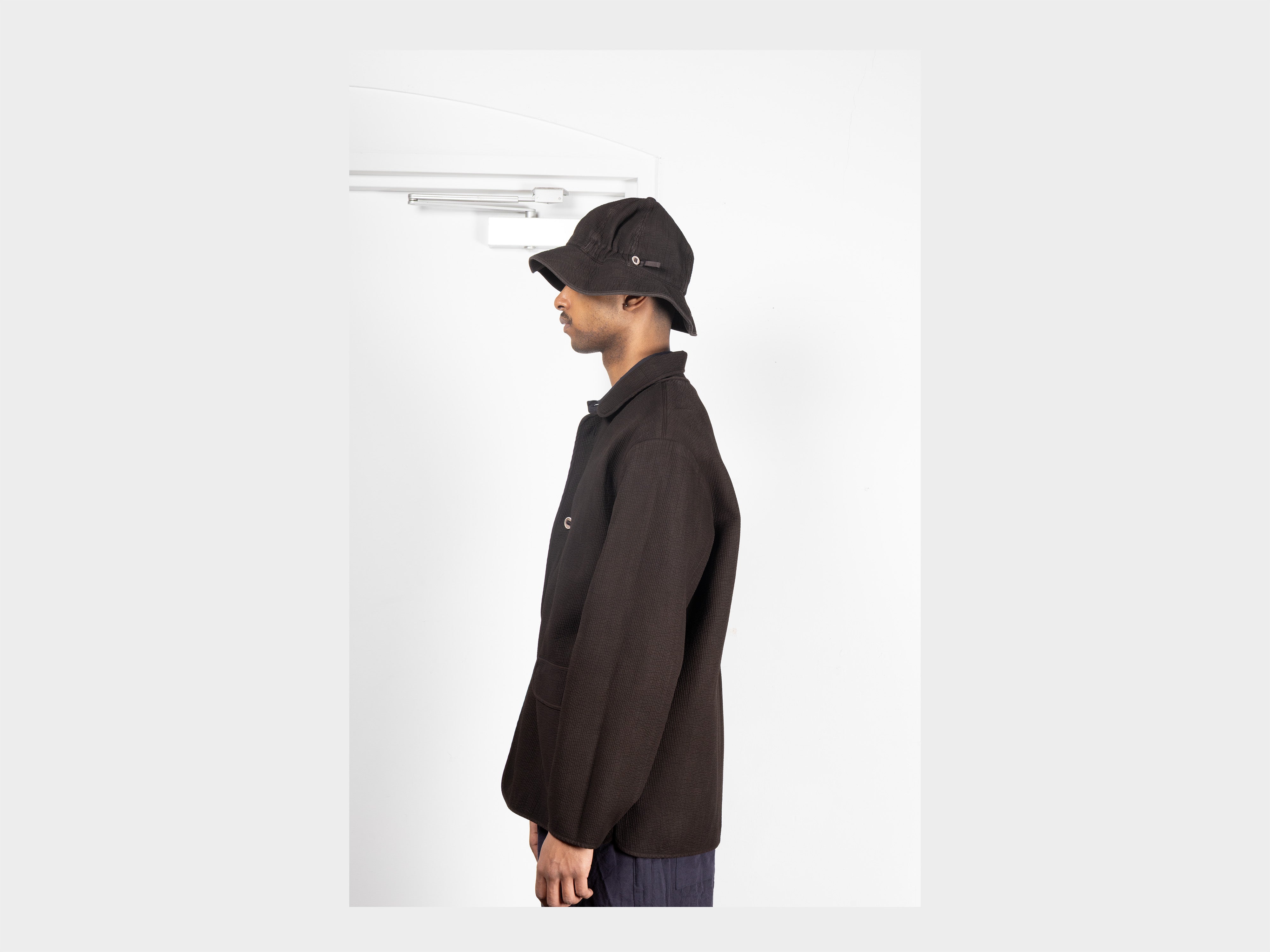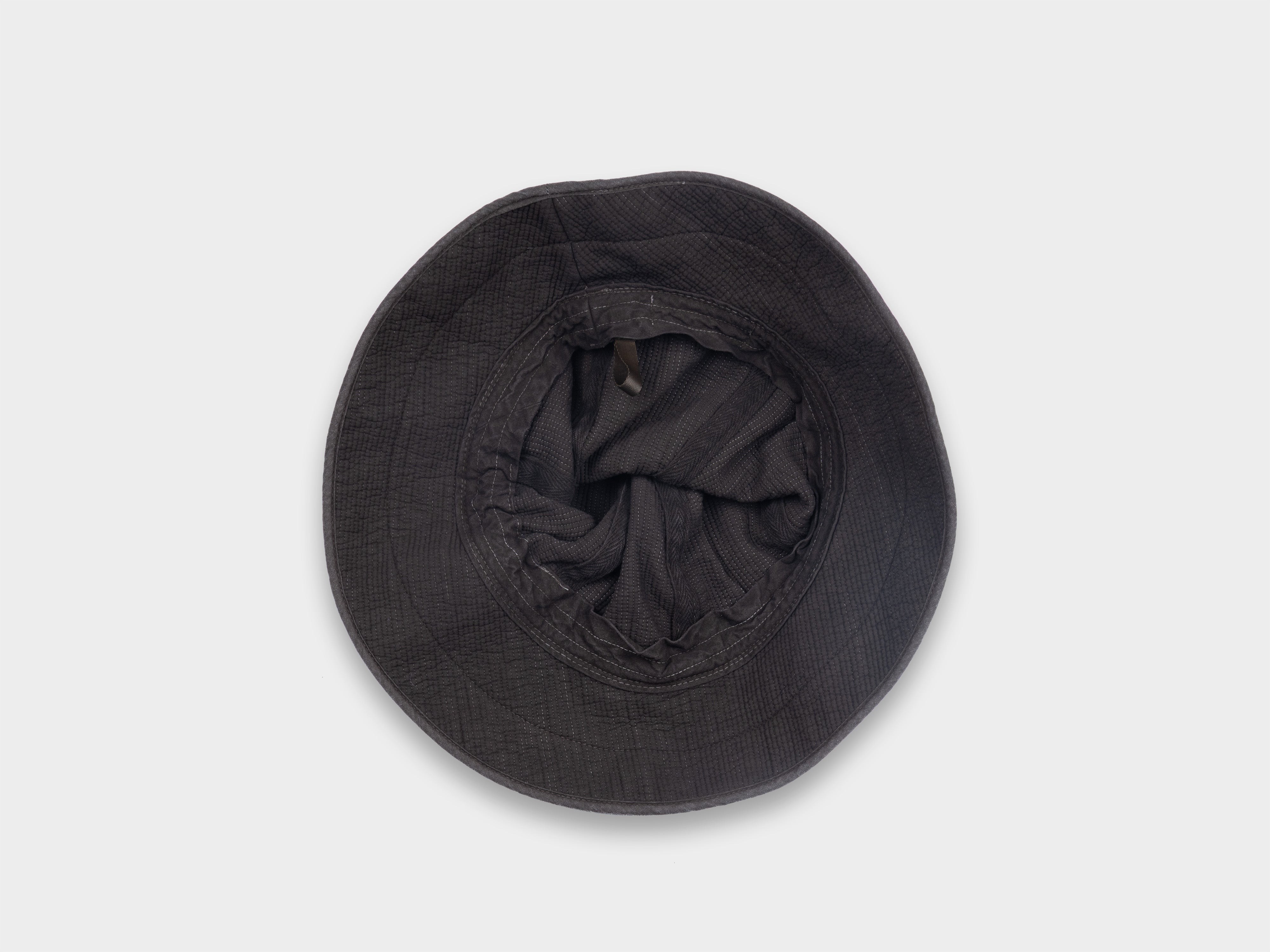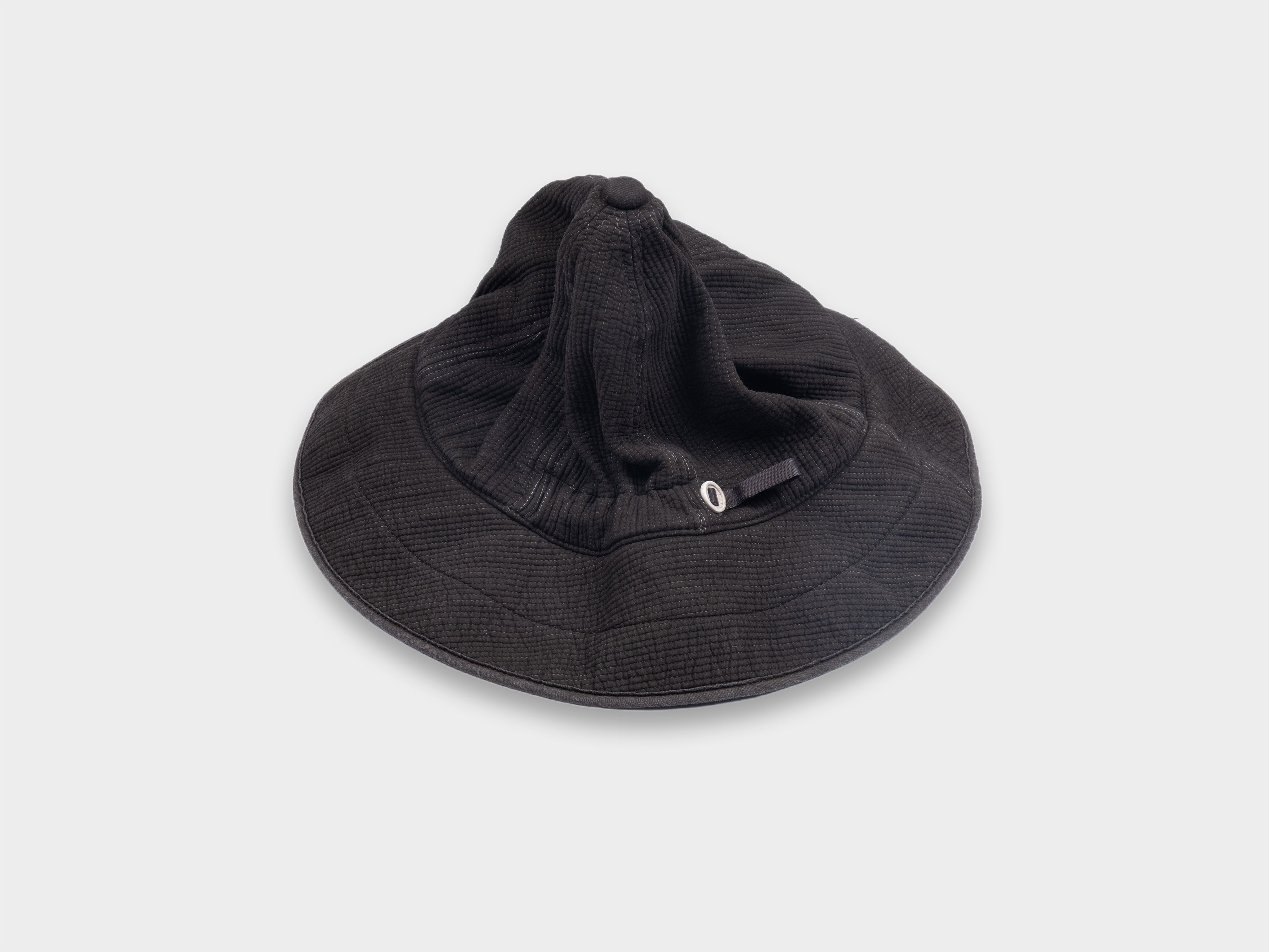 100% cotton layers / 100% polyester fill, 3mm stitched wales. Soft-type Nubi cloth, over-dyed by hand using ancient Dorozome (mud-dyeing) techniques of Amami-Ōshima. Hat is dyed in a tannin-rich dye bath made from the bark of locally found Sharinbai trees, then repeatedly immersed in the island's iron-rich mud, dorotetsu. Depth of colour is achieved through chemical reaction and layered immersion, and will evolve with washing and wear. Woven for MAN-TLE in Daegu, South Korea, and hand-dyed in Amami-Ōshima, Japan.