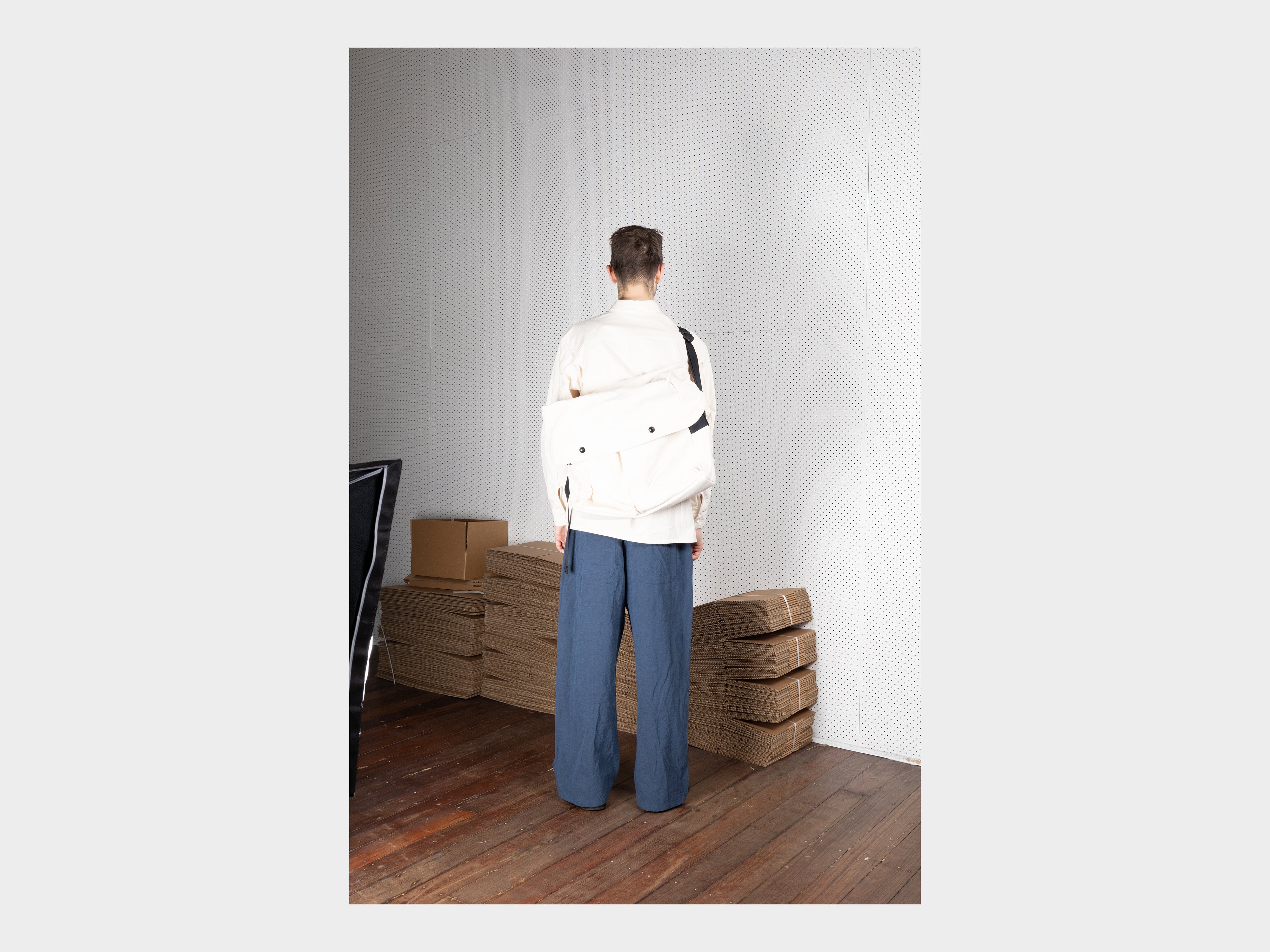 +Crossbody messenger bag from our collaboration with Shinji Sekizuka of Iwakura AA. Unbleached cotton canvas MAN–TLE products, stocked at Iwakura AA, were offered custom dyeing at the iconic mudworks Kanai Kougei. This is an original, undyed G2 made for the collaboration. Designed in collaboration with Rikiya Matsumura, based on a Royal Mail delivery bag. Spacious main compartment with an internal padded laptop sleeve, front bellow pockets, and a high-density strap with a shoulder pad. Features MAN-TLE signature hardware – coated brass snap closure made for MAN-TLE in Germany, and a Jotun powder-coated aluminum strap slider, laser-cut for MAN-TLE in Australia. Bag made in Japan.
