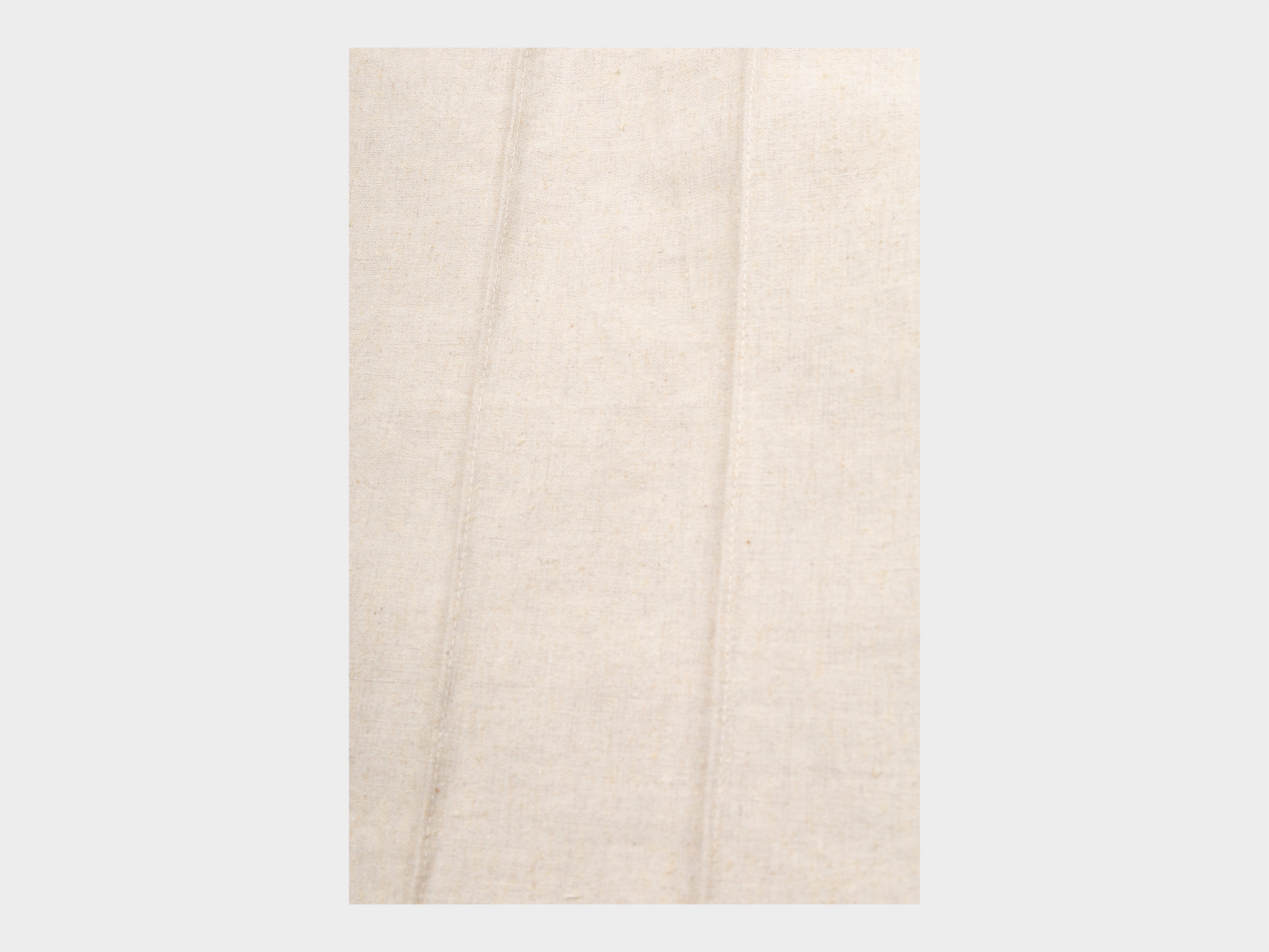 +53% linen / 33% cotton / 14% bamboo. Midweight buff cloth with dry, textural hand feel. Woven on a wooden shuttle loom in Shizuoka, Japan.