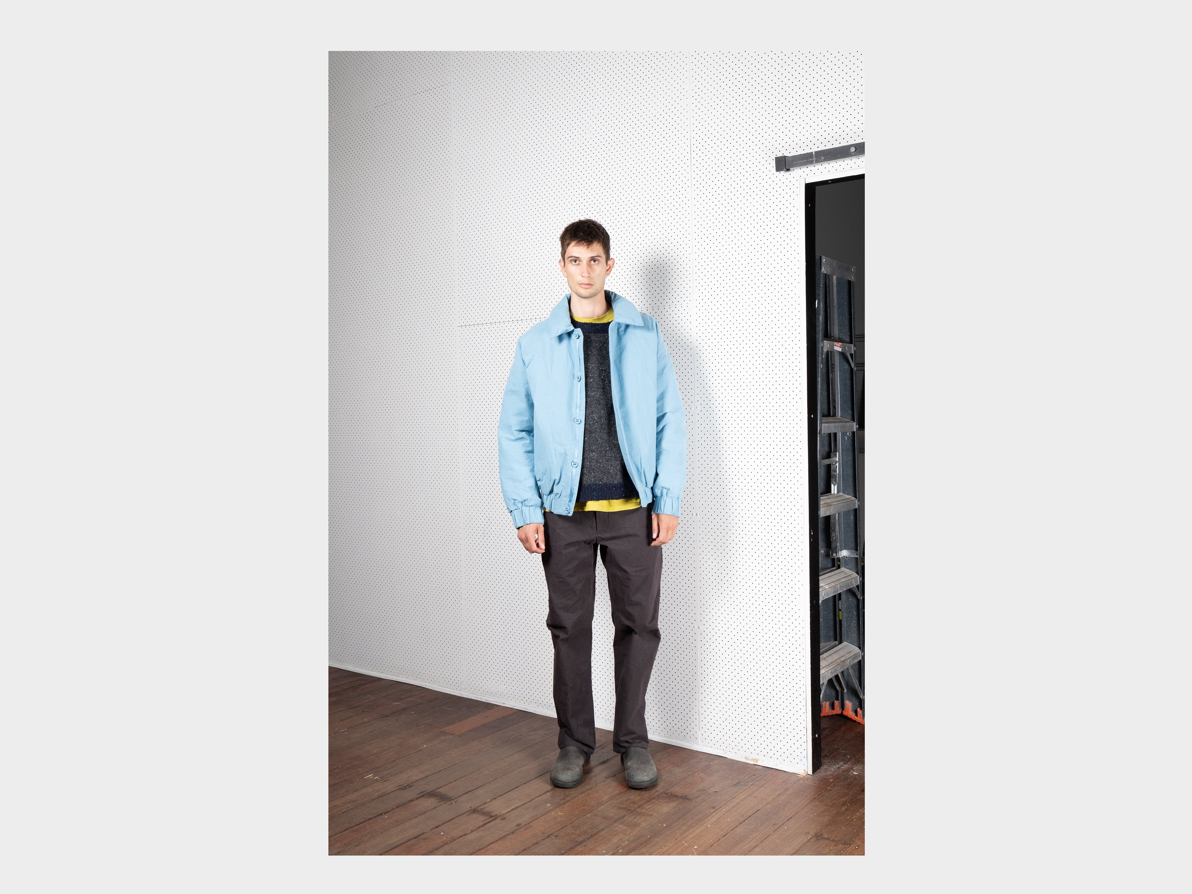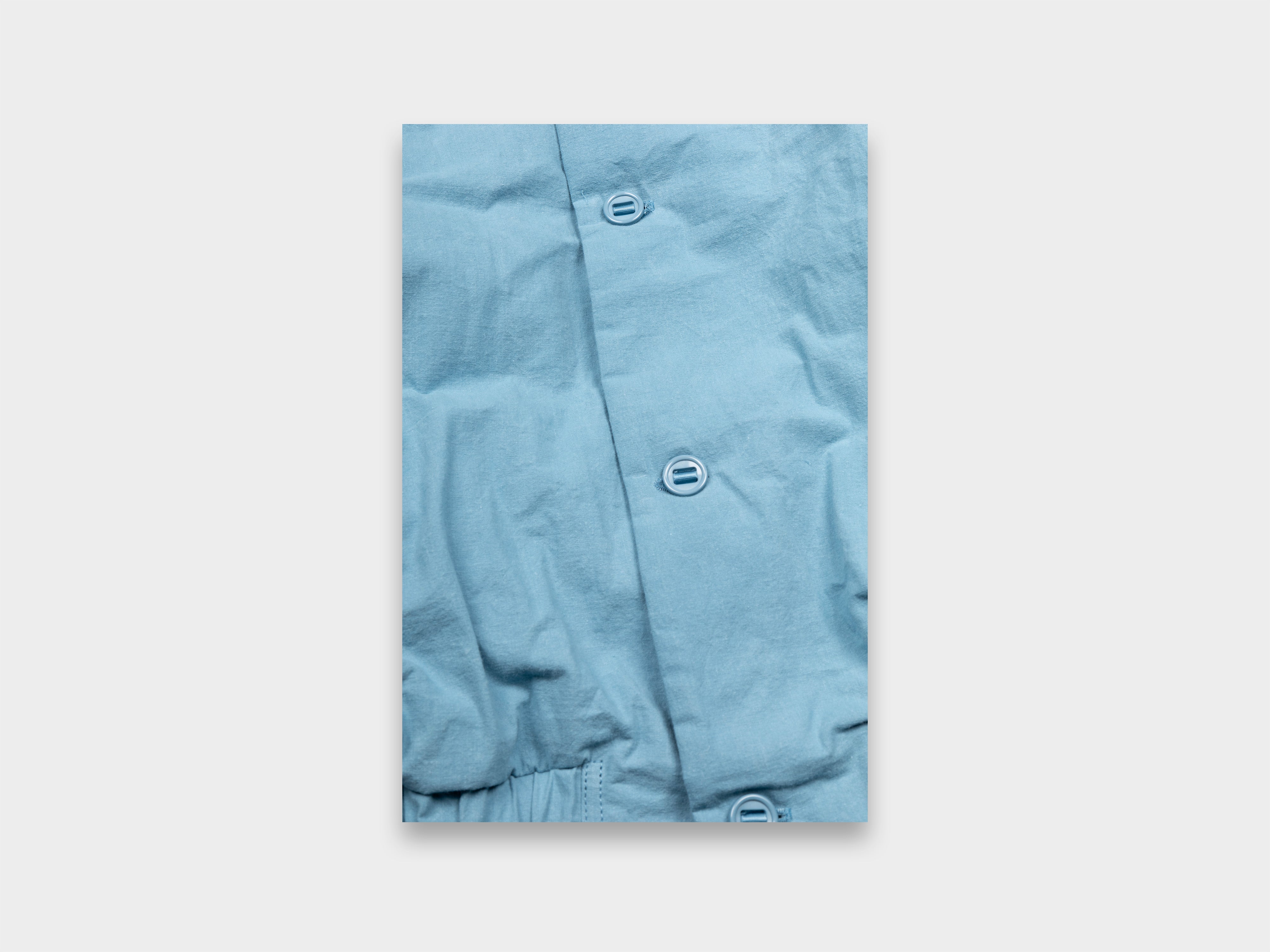 Oversized down-filled blouson. Features ethically farmed European silver goose down, cleaned and processed in Japan by Kawada Feather. This down retains its original mottled colour, as no bleach is used. To showcase its unique tone, the garment is lined with a transparent 100% nylon micro-ripstop developed by Toray. Comprising 90% down and 10% feather to reduce clumping, this product has a fill-power rating of 850. Slot buttons threaded onto seat belt tape, dropped shoulders, elastic cuffs and hem, generous sleeve and body. Read our Kawada Feather story here. Made in Japan.