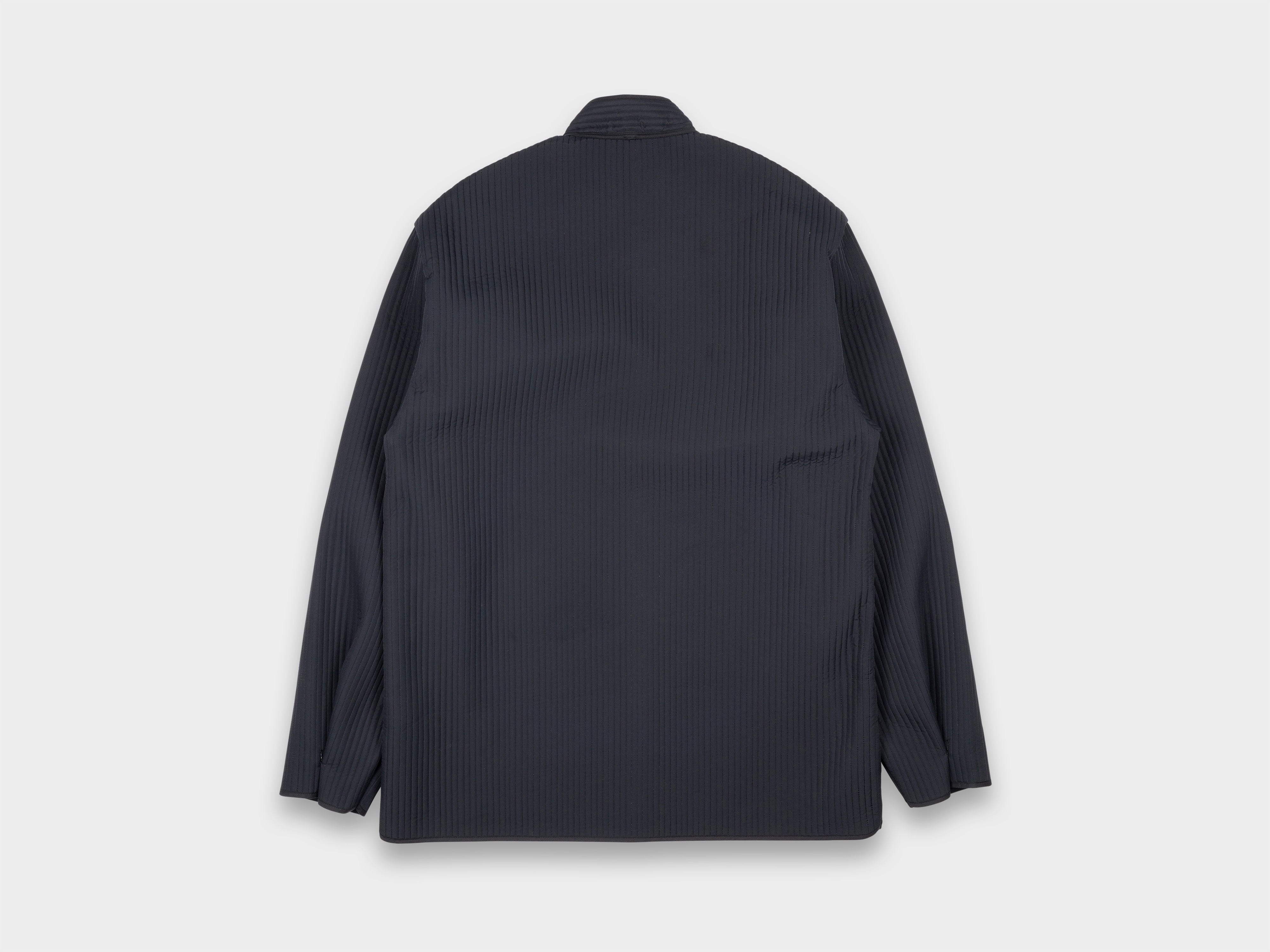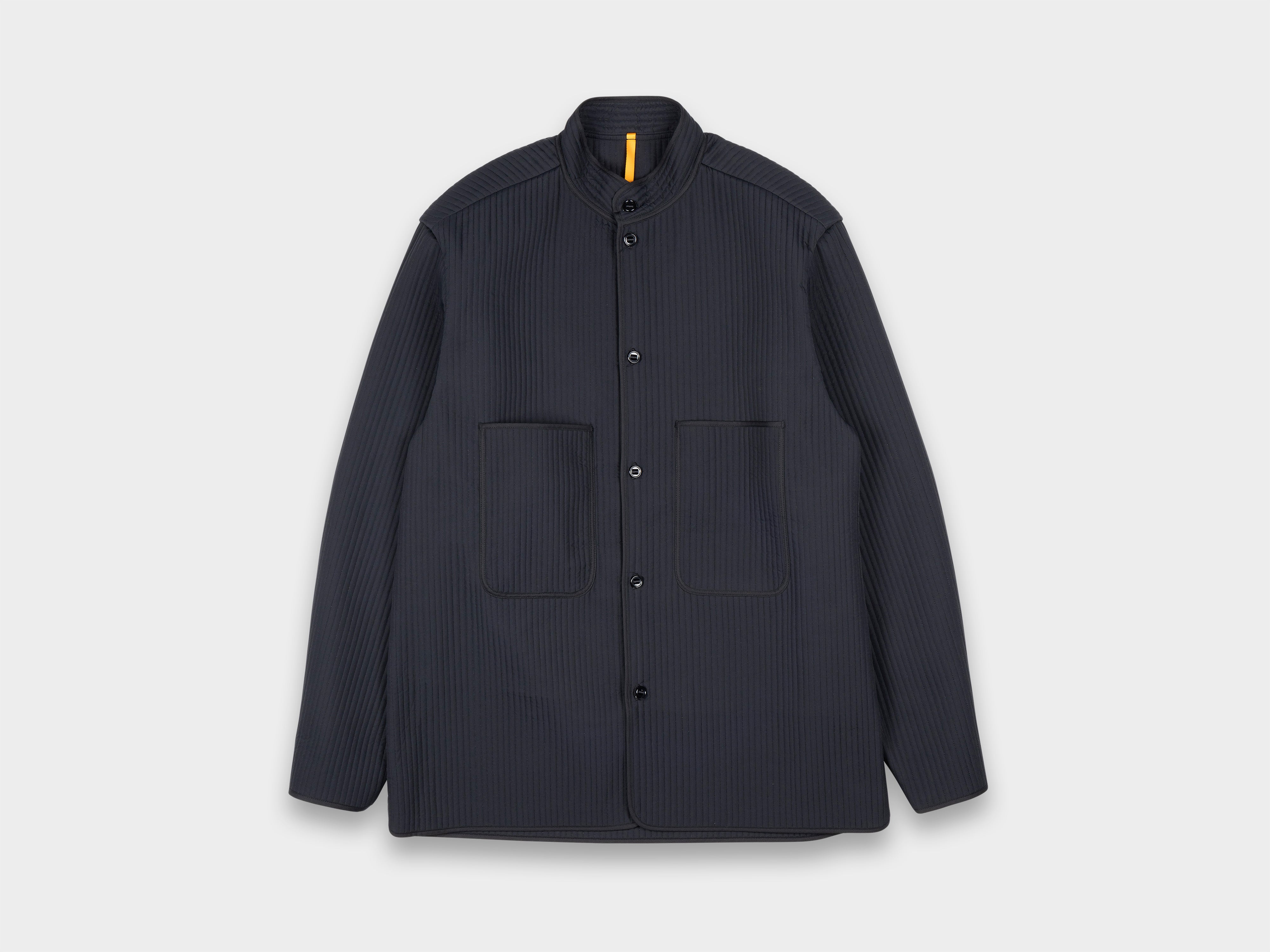 +Relaxed, longline shirt with a stand collar. Two long, large chest pockets, slot buttons threaded onto seatbelt tape, cinched cuffs. Each panel individually bound before seams are sewn. Made in Japan using traditional Korean techniques.