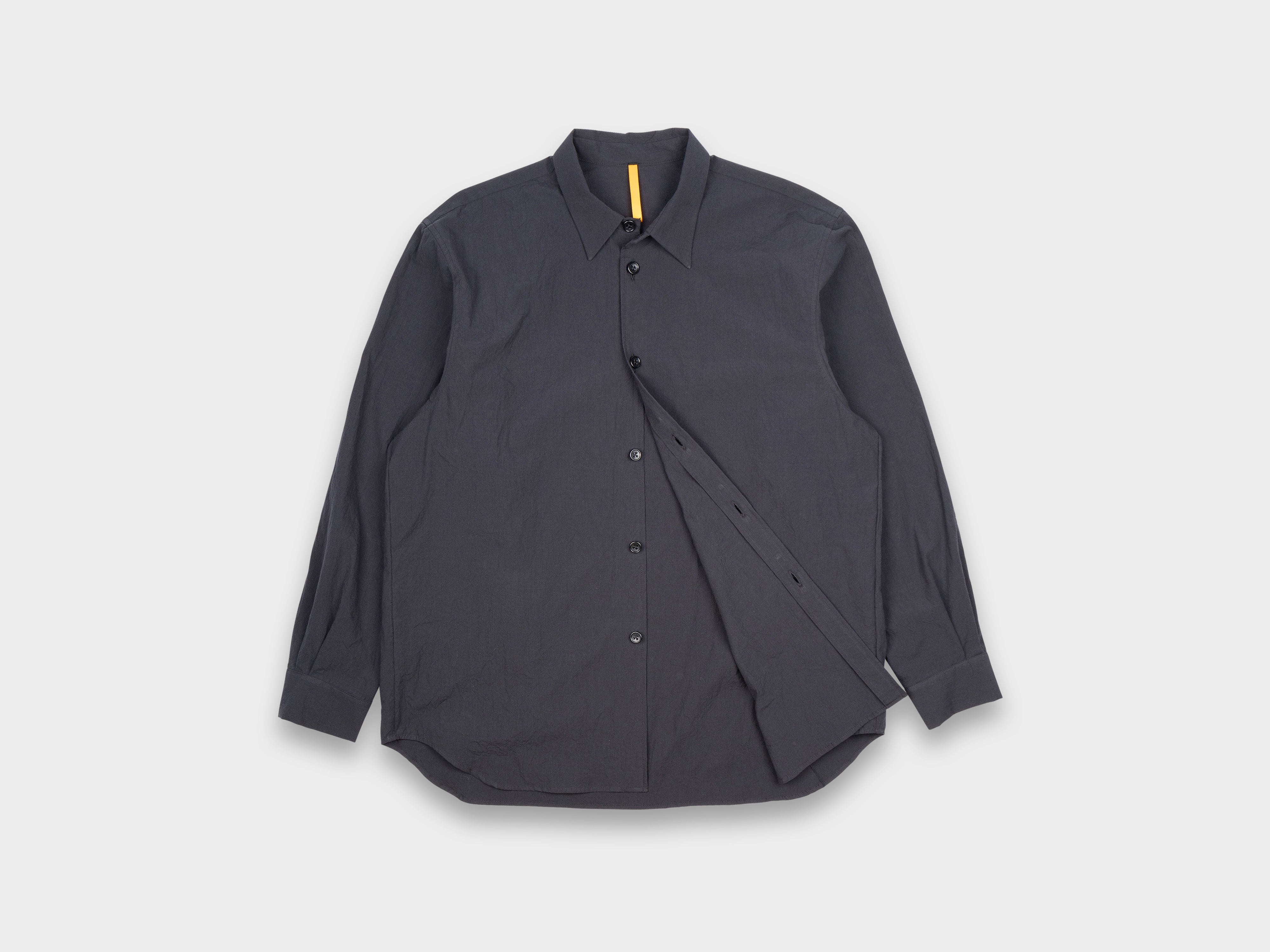 +Loose-fitting shirt. Slightly dropped shoulders, relaxed sleeves, pleated cuffs with single-button closure, pointed collar, button front, curved hem. Made in Japan.