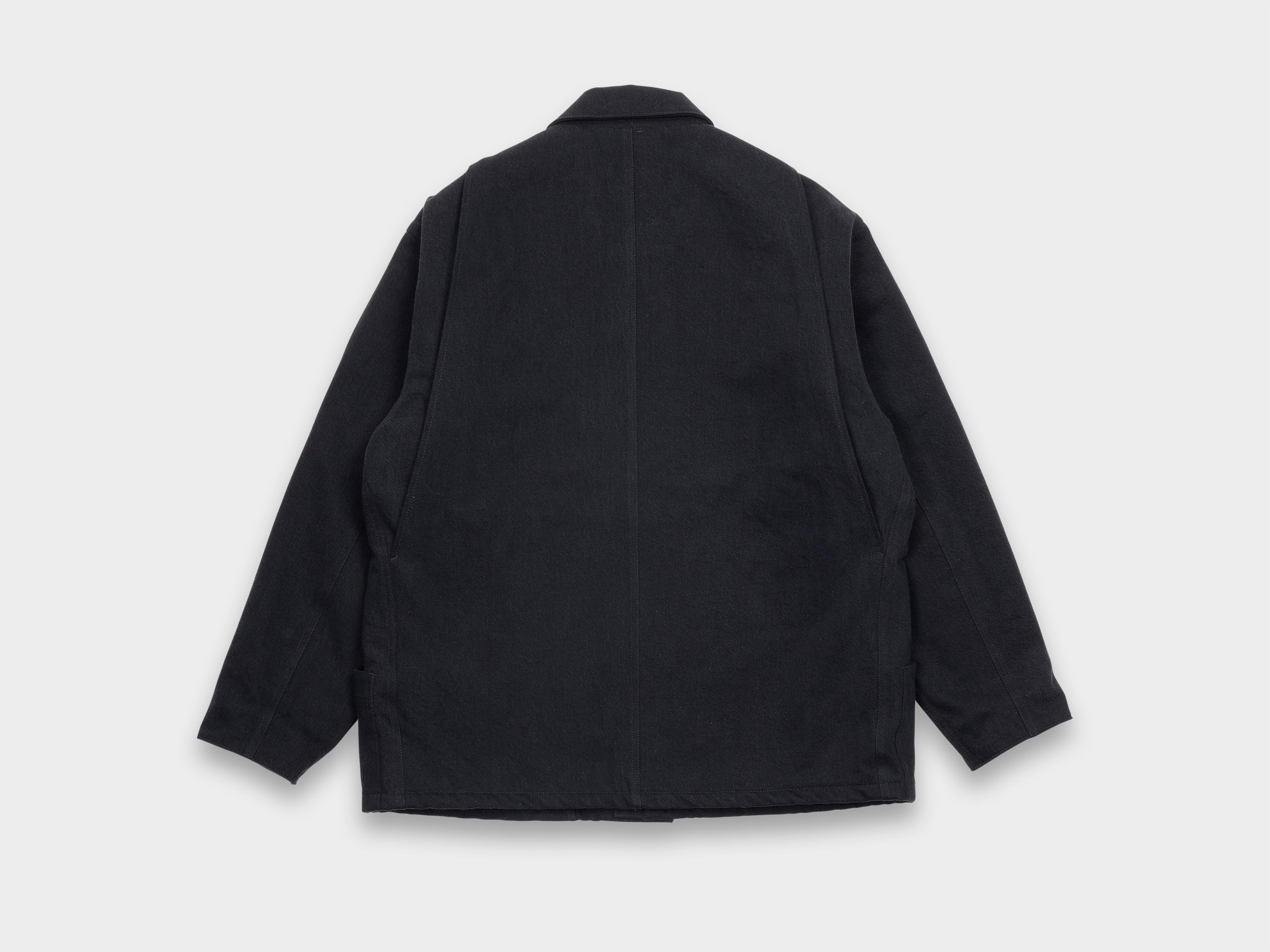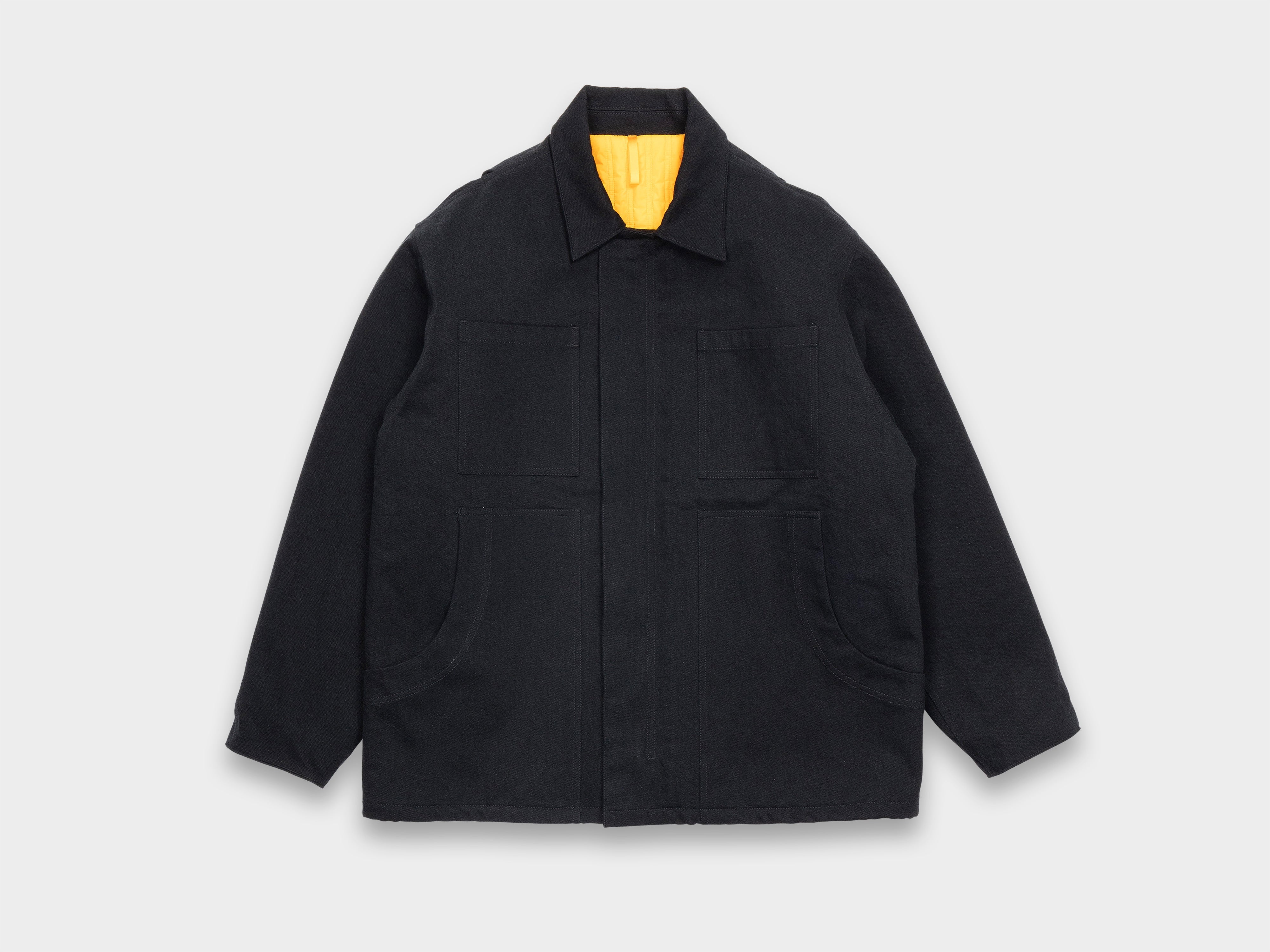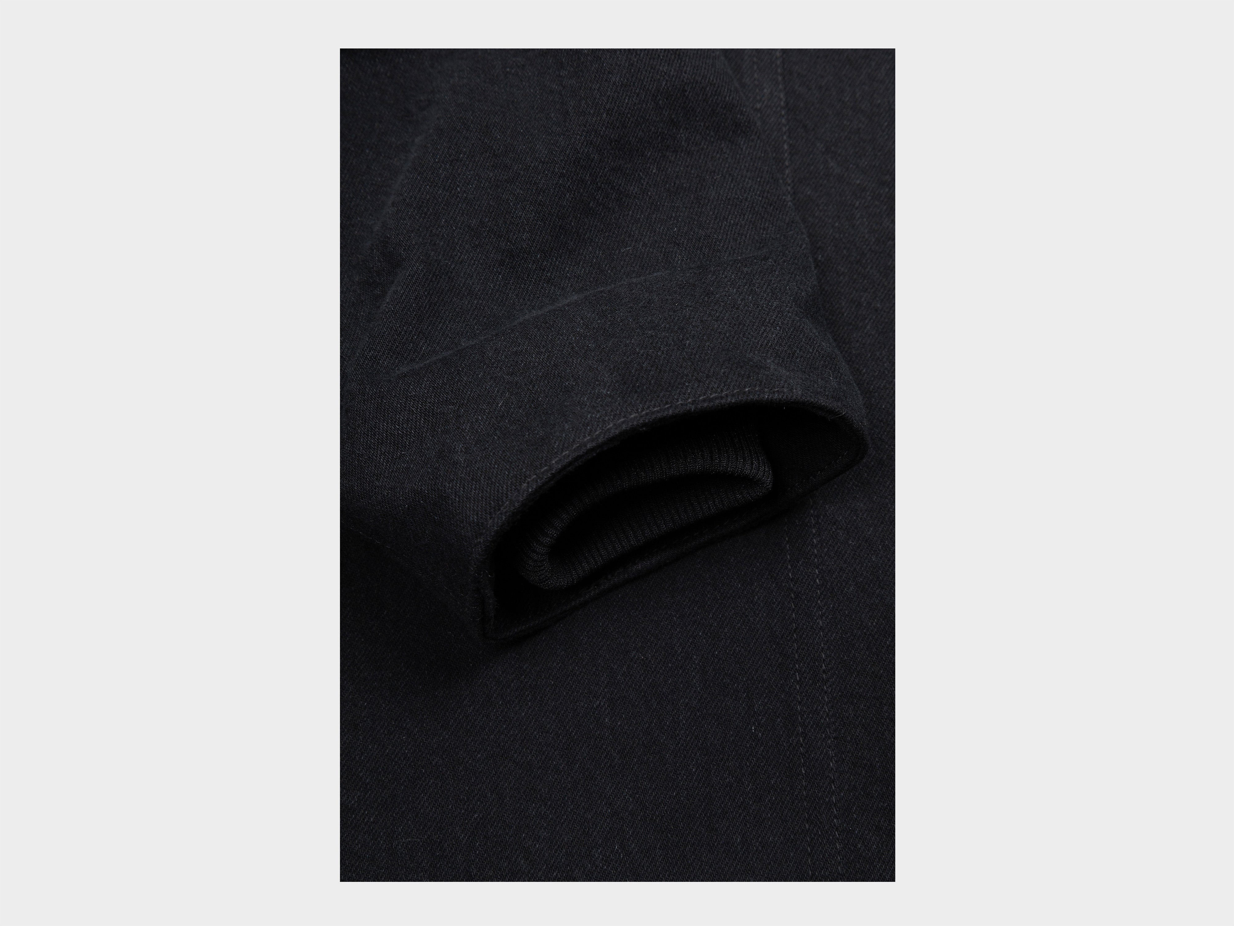 +11.9oz 100% cotton denim woven with uneven natural slub yarn. Yarn dyed with black sulphur dye and washed for softeness. Produced in Okayama, Japan. Lined with fluorine free water repellent 100% recycled nylon. Filled with 70% recycled PET / 30% composite polyester.