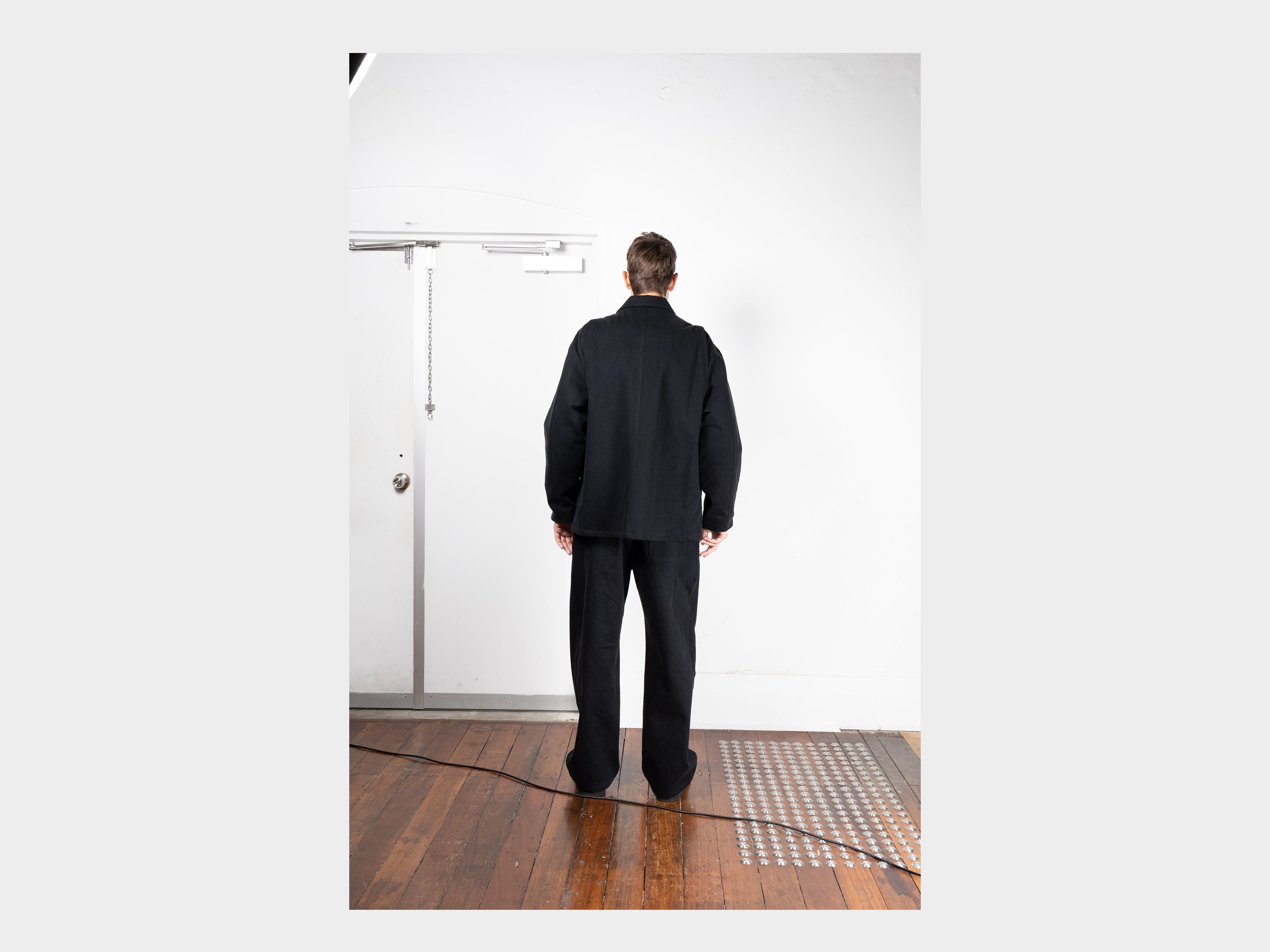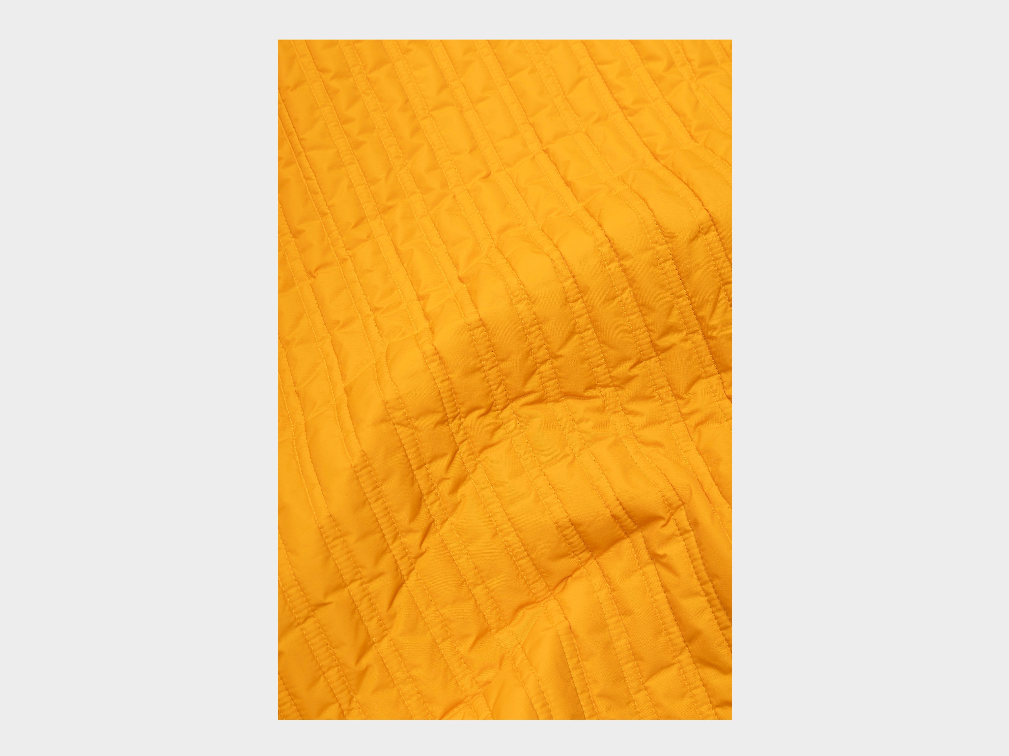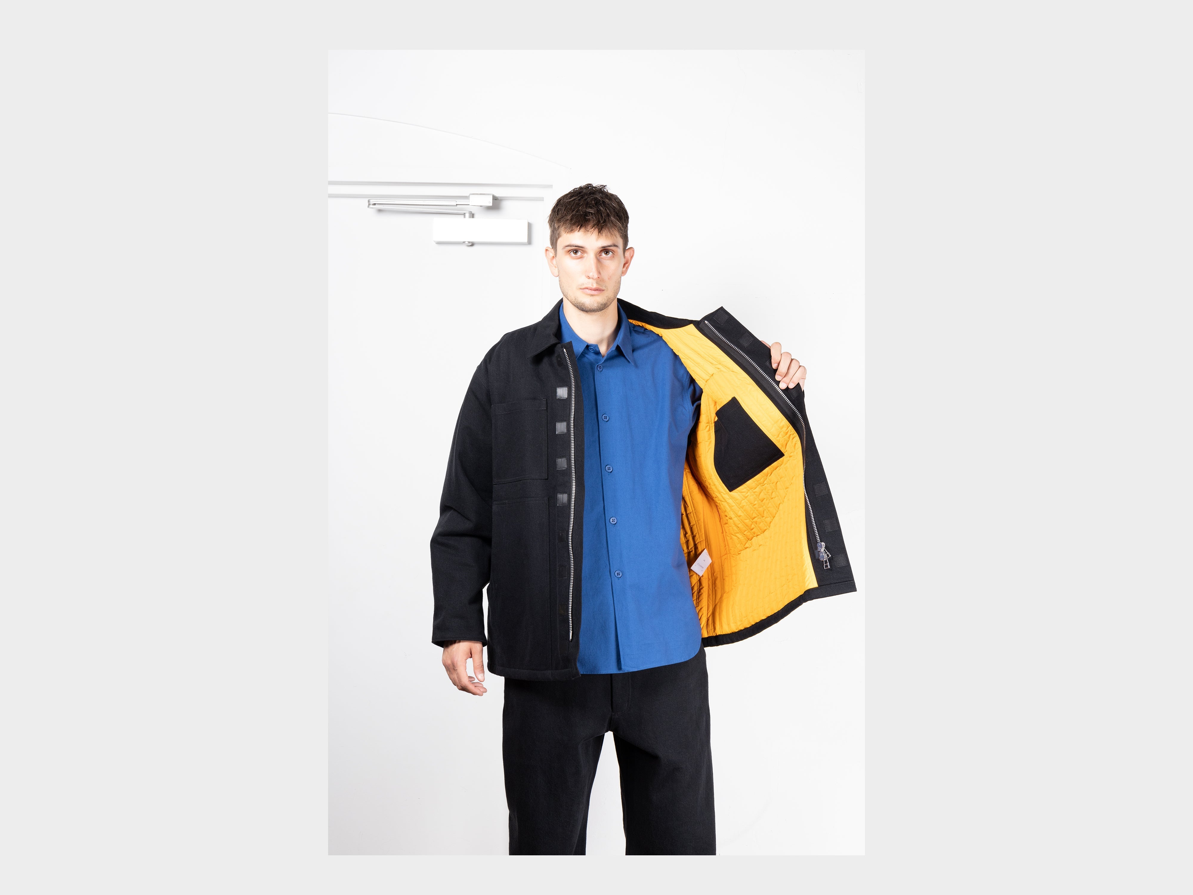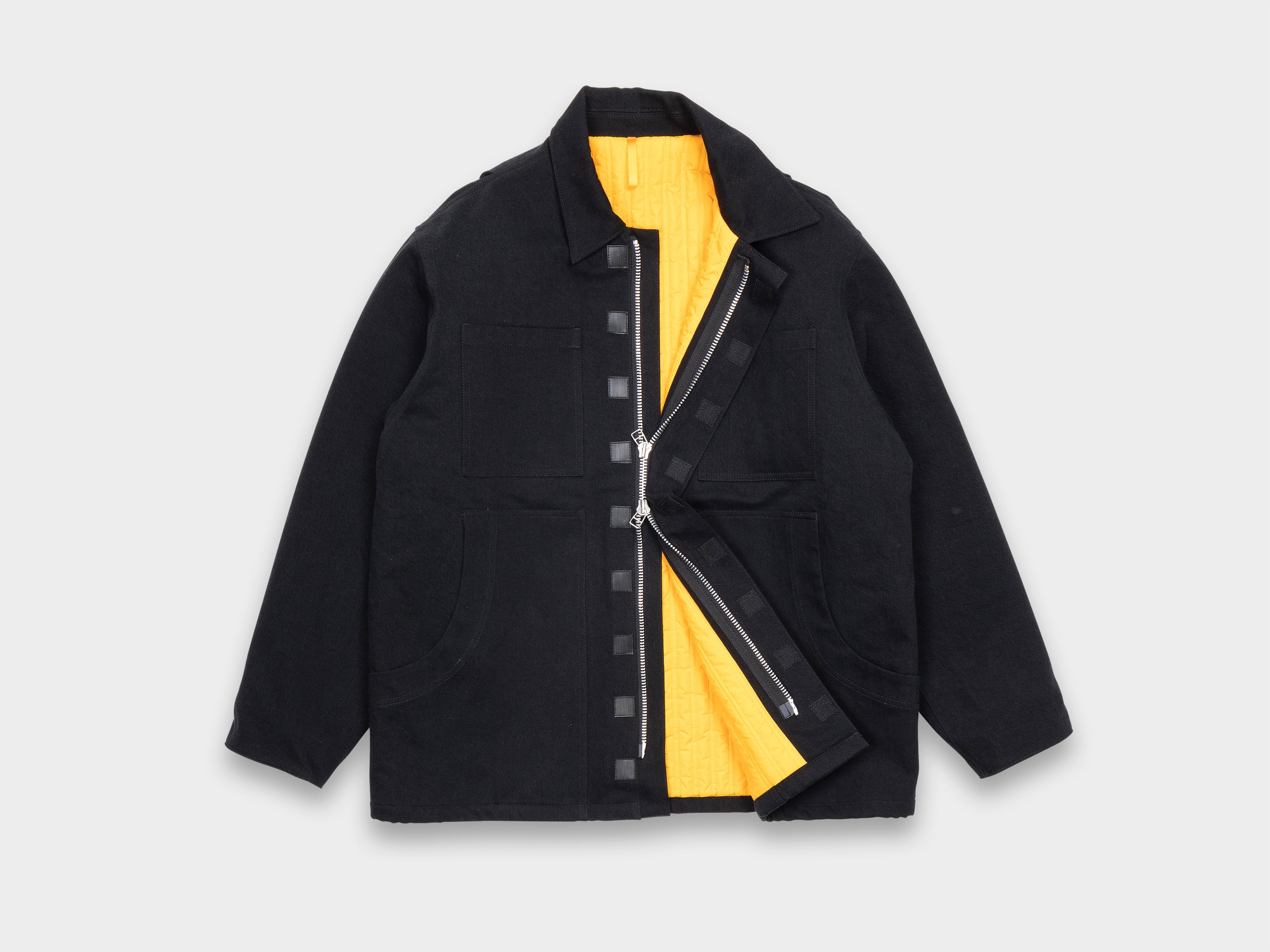 +11.9oz 100% cotton denim woven with uneven natural slub yarn. Yarn dyed with black sulphur dye and washed for softeness. Produced in Okayama, Japan. Lined with fluorine free water repellent 100% recycled nylon. Filled with 70% recycled PET / 30% composite polyester.