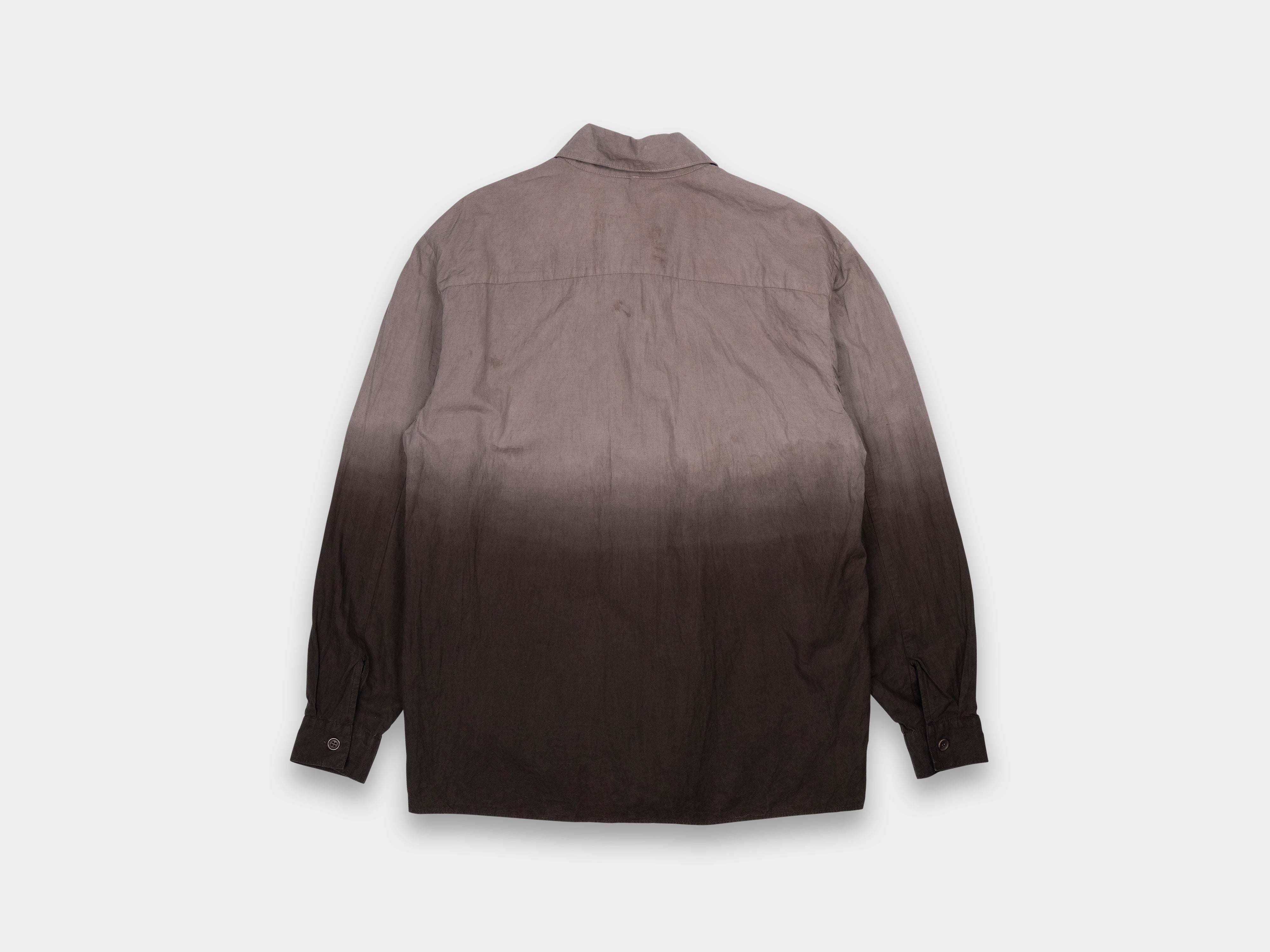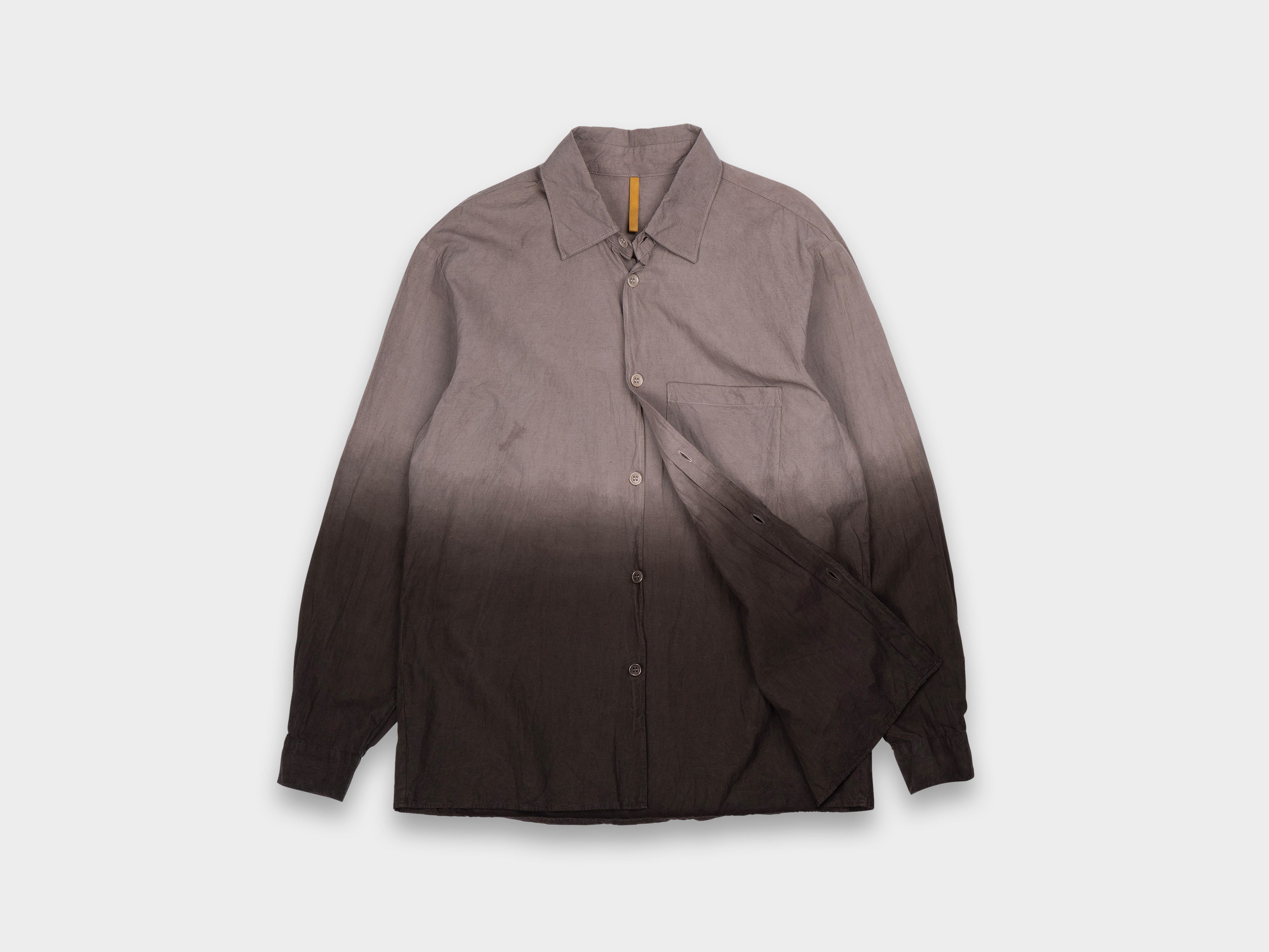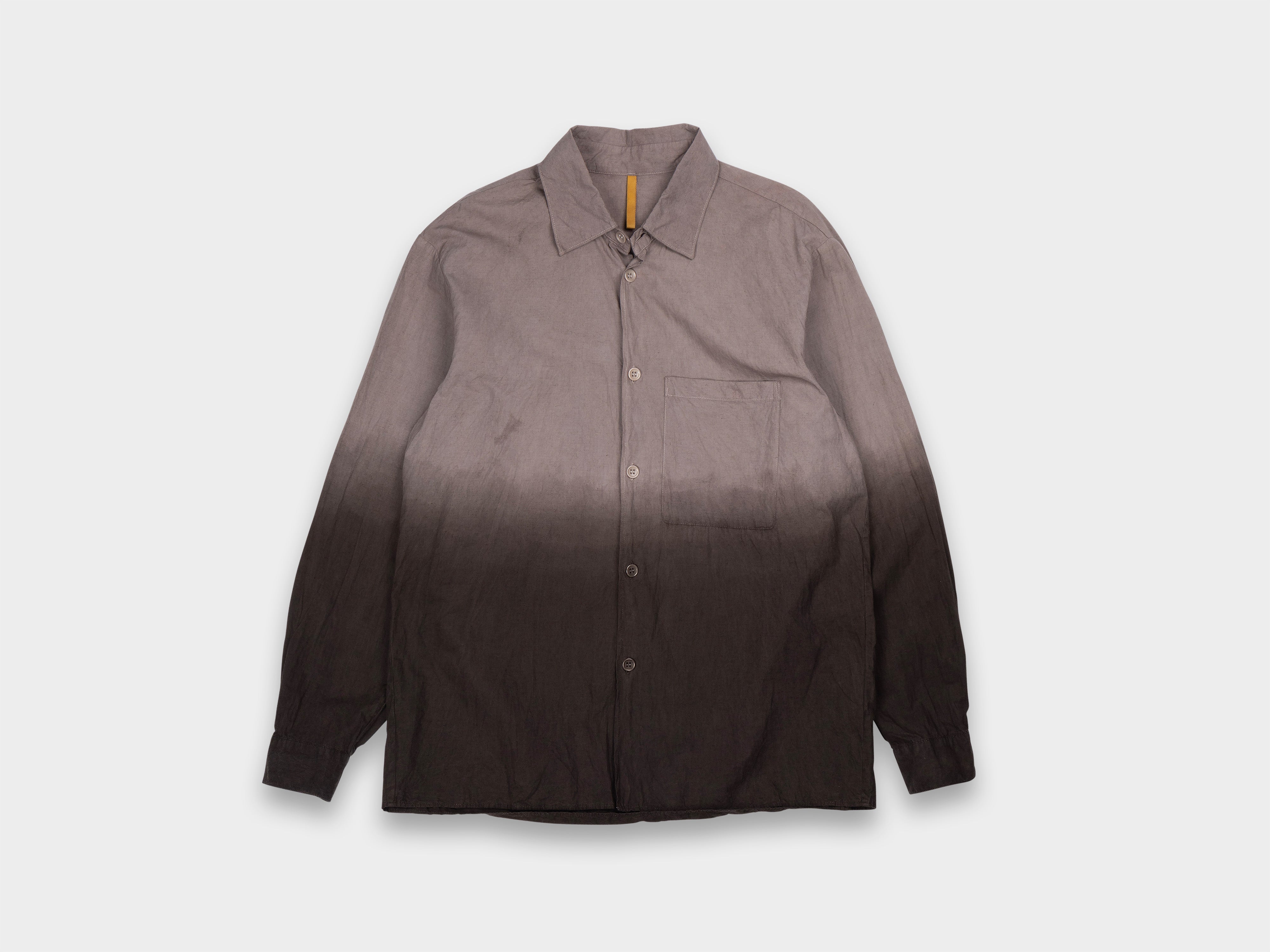 +Relaxed, straight-cut shirt. Generous room through armholes, relaxed sleeves with single button closure, high stand collar, button front, large left-chest pocket. This shirt is designed to be naturally overdyed. Dyeing commissioned to iconic mud works Kanai Kougei, based in Amami-Ōshima. Master craftsman Yukihito Kanai preserves the ancient Dorozome techniques of the island, while expressing his fascination with gradation and exploring new combinations of colour using materials within reach. Made in Japan.