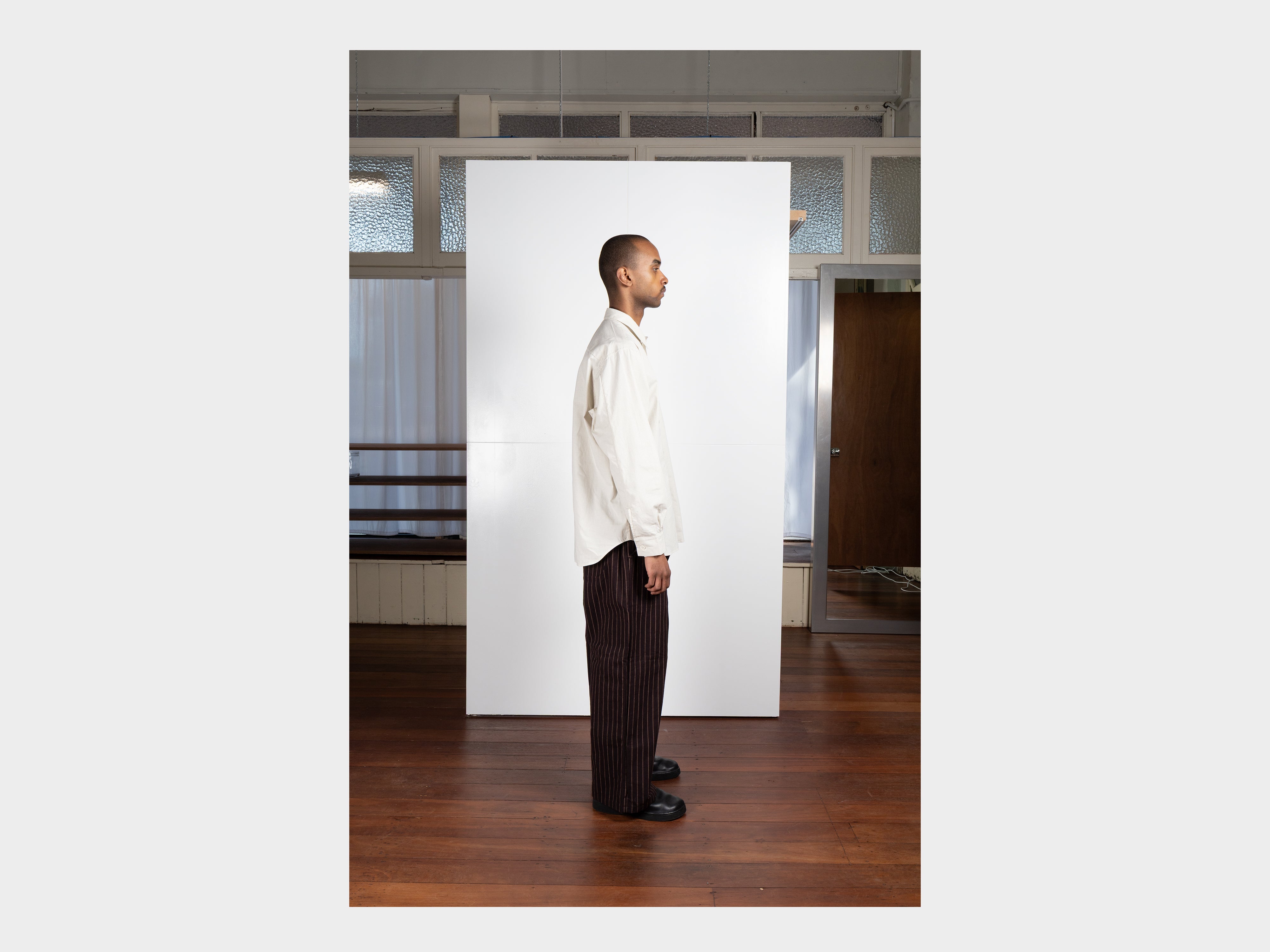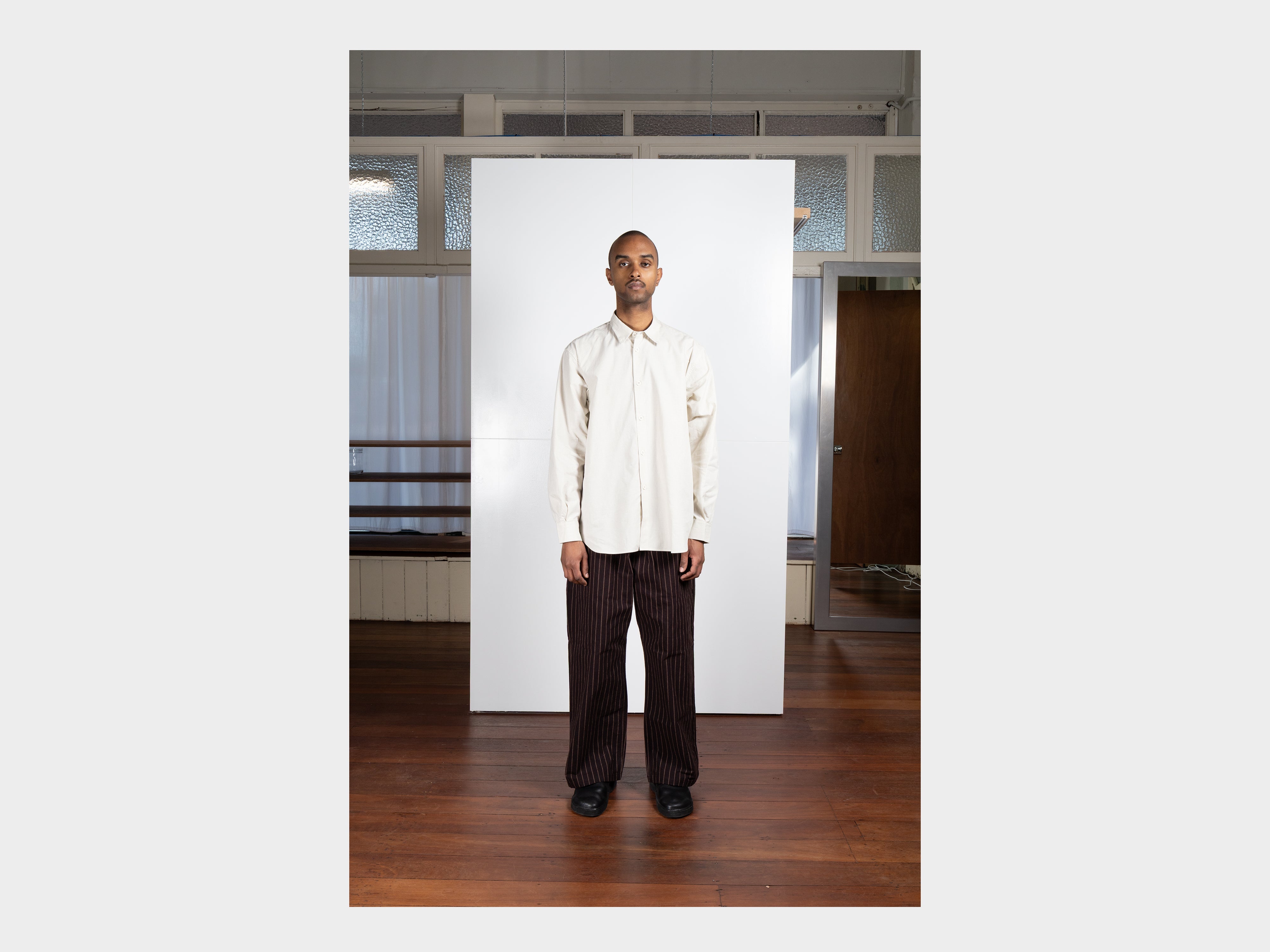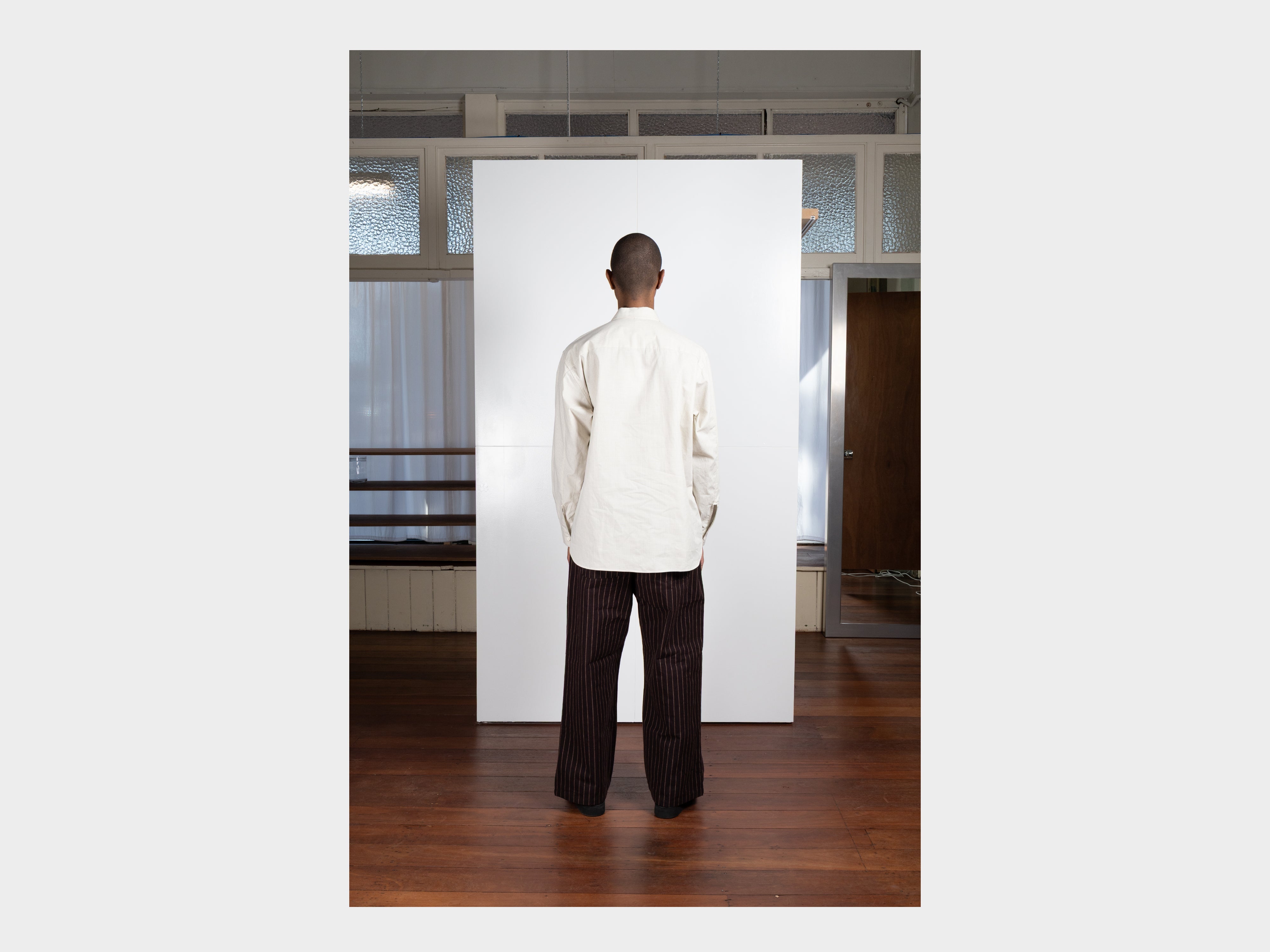 +Loose-fitting shirt. Slightly dropped shoulders, relaxed sleeves, pleated cuffs with single-button closure, pointed collar, button front, curved hem. Made in Japan.