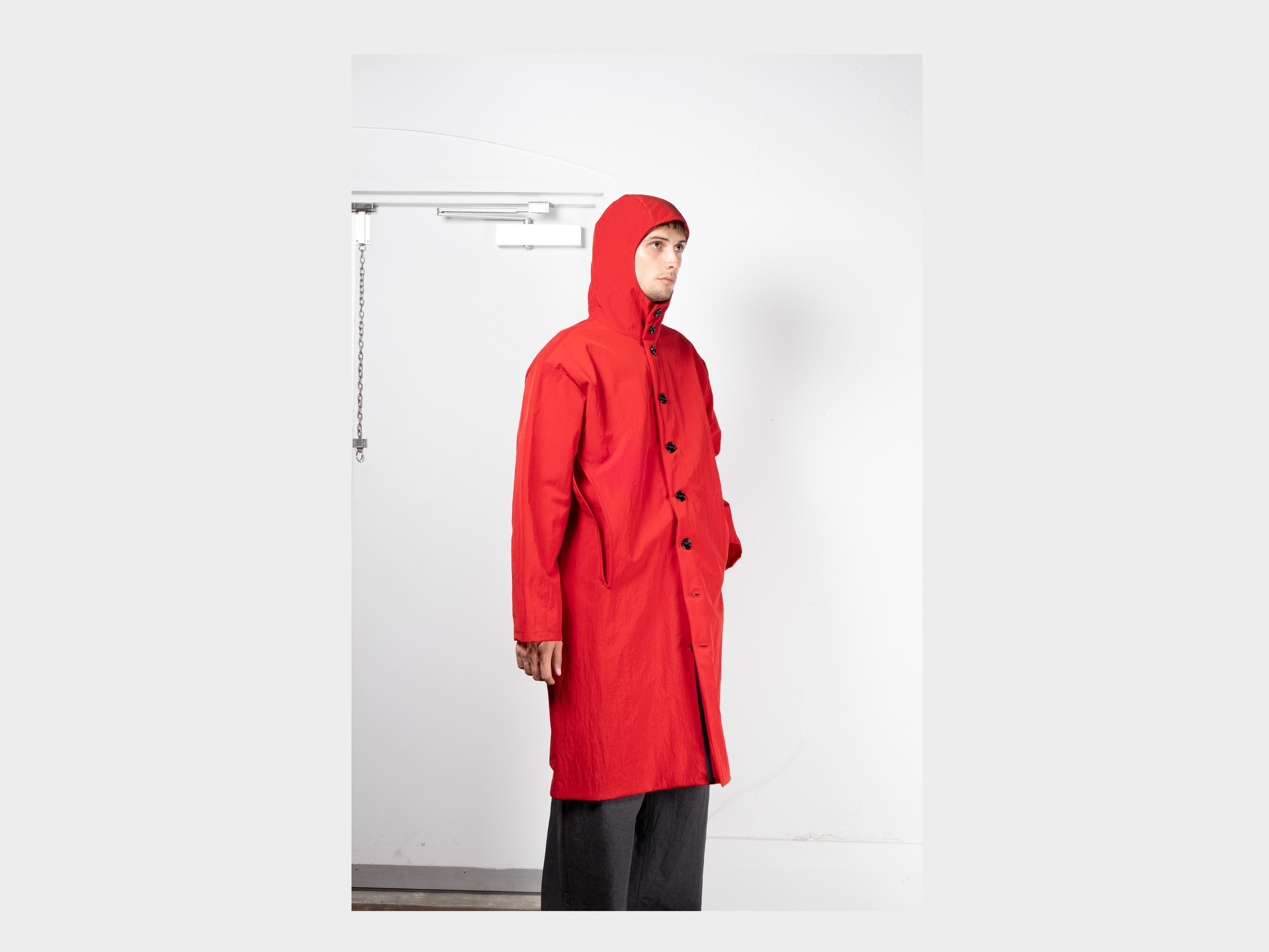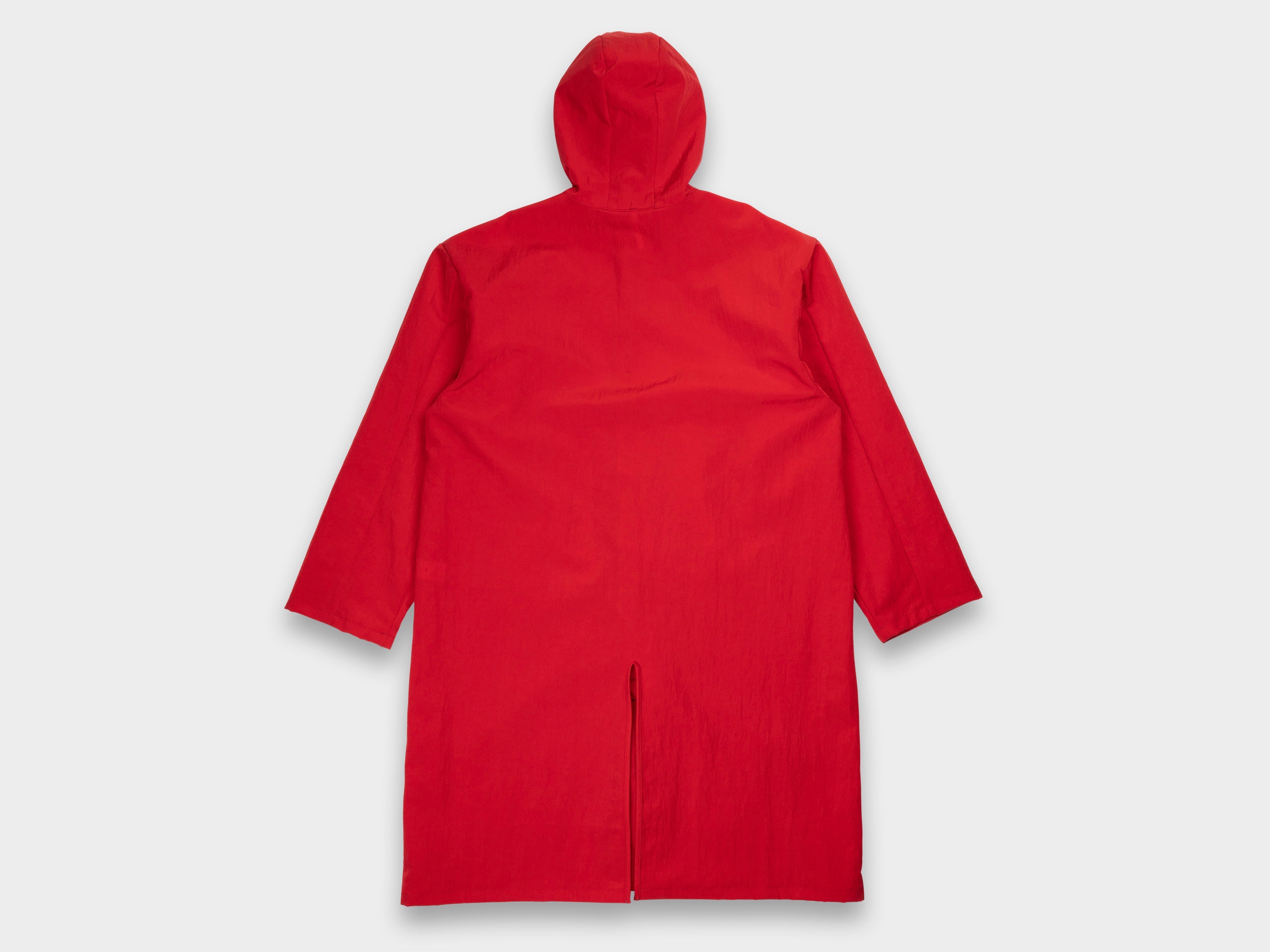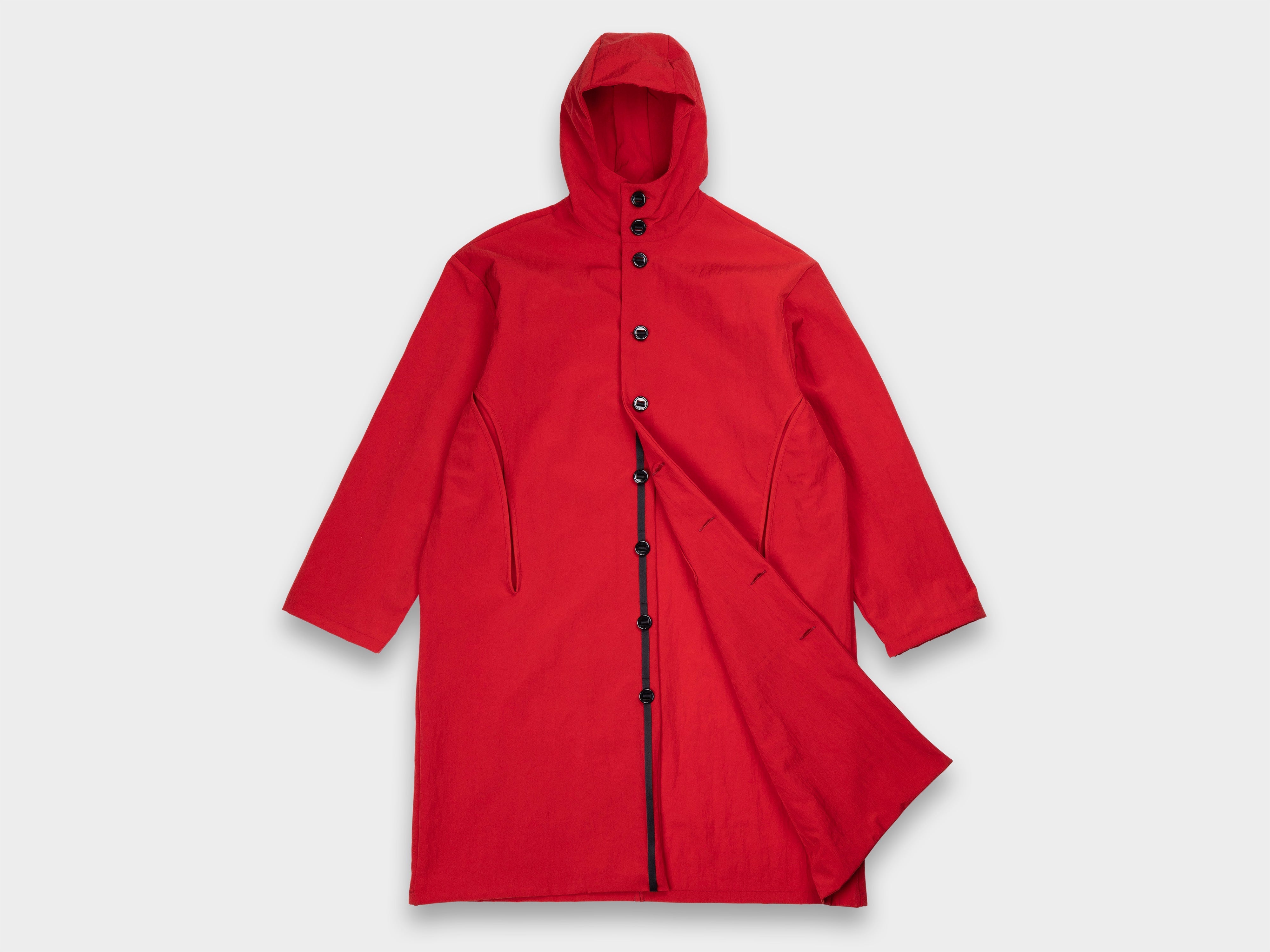 Hooded coat with a loose, long fit. Self-lined front and hood, internal chest pocket, enlarged slot buttons threaded onto seatbelt tape, slashed pockets that extend from the armholes. Made in Japan.