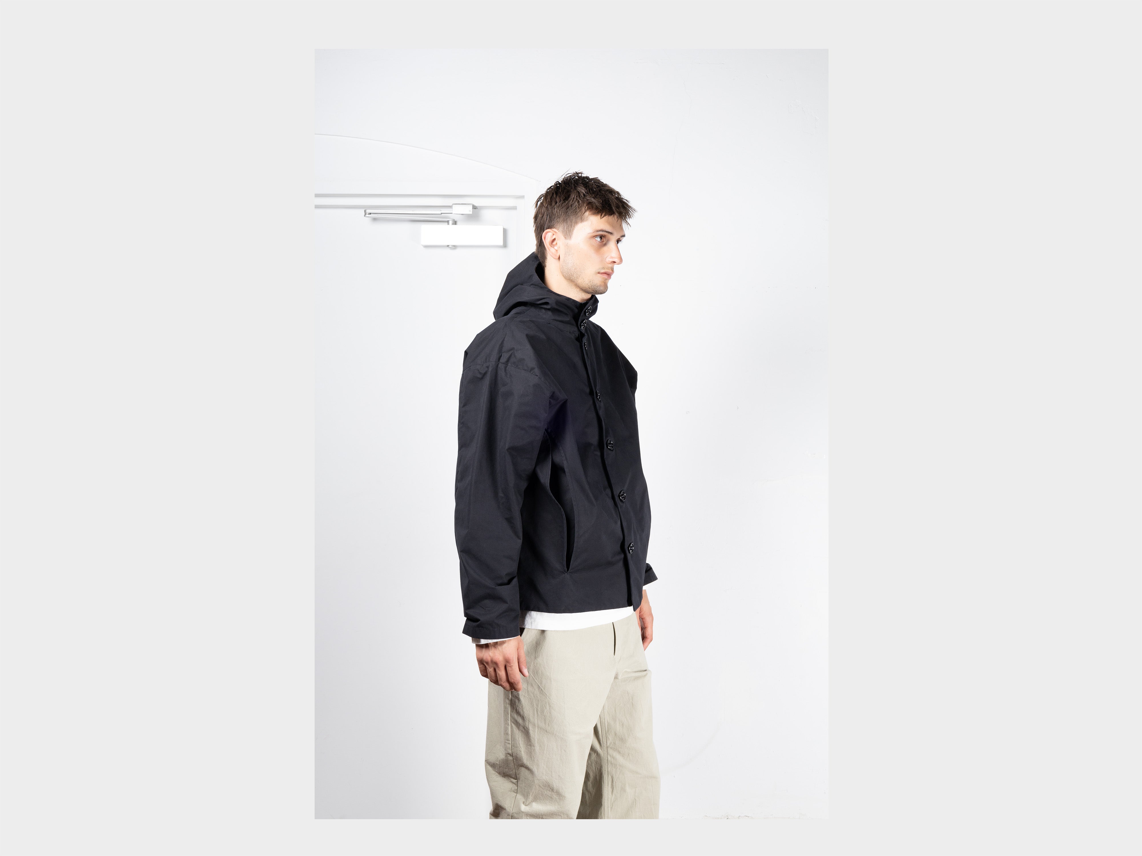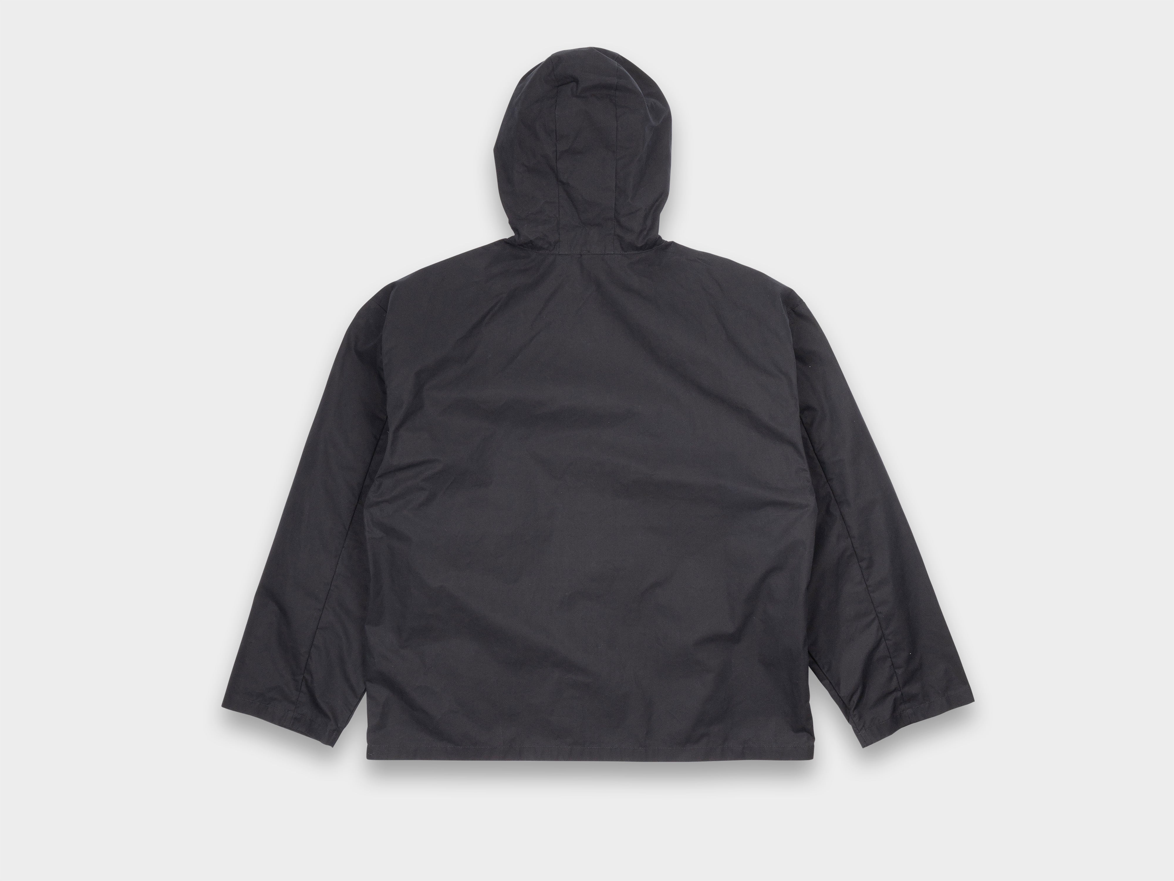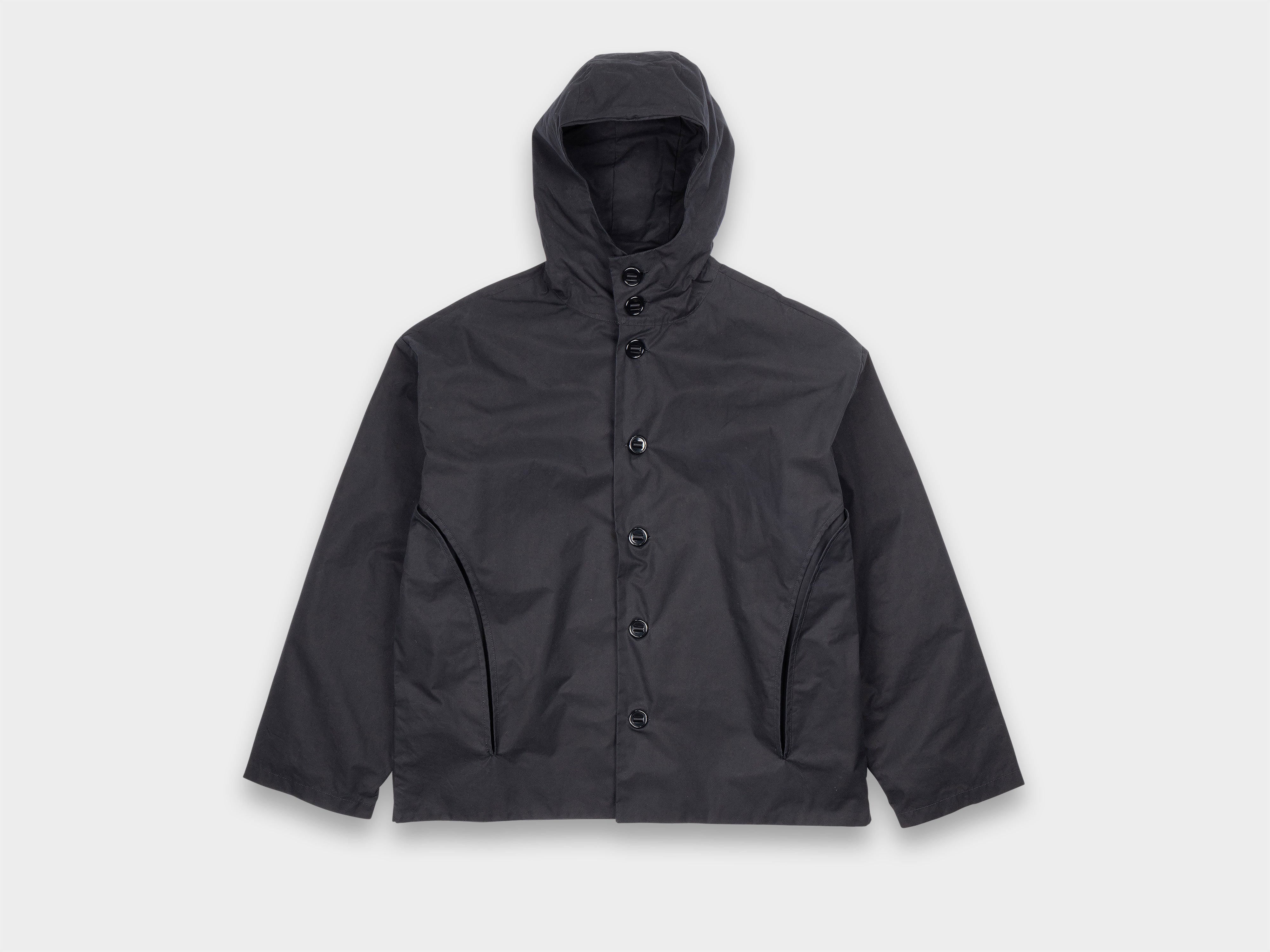 +Hooded jacket with a loose, slightly cropped fit. Self-lined front and hood, enlarged slot buttons threaded onto seatbelt tape, slashed pockets that extend from the armholes. Made in Japan.