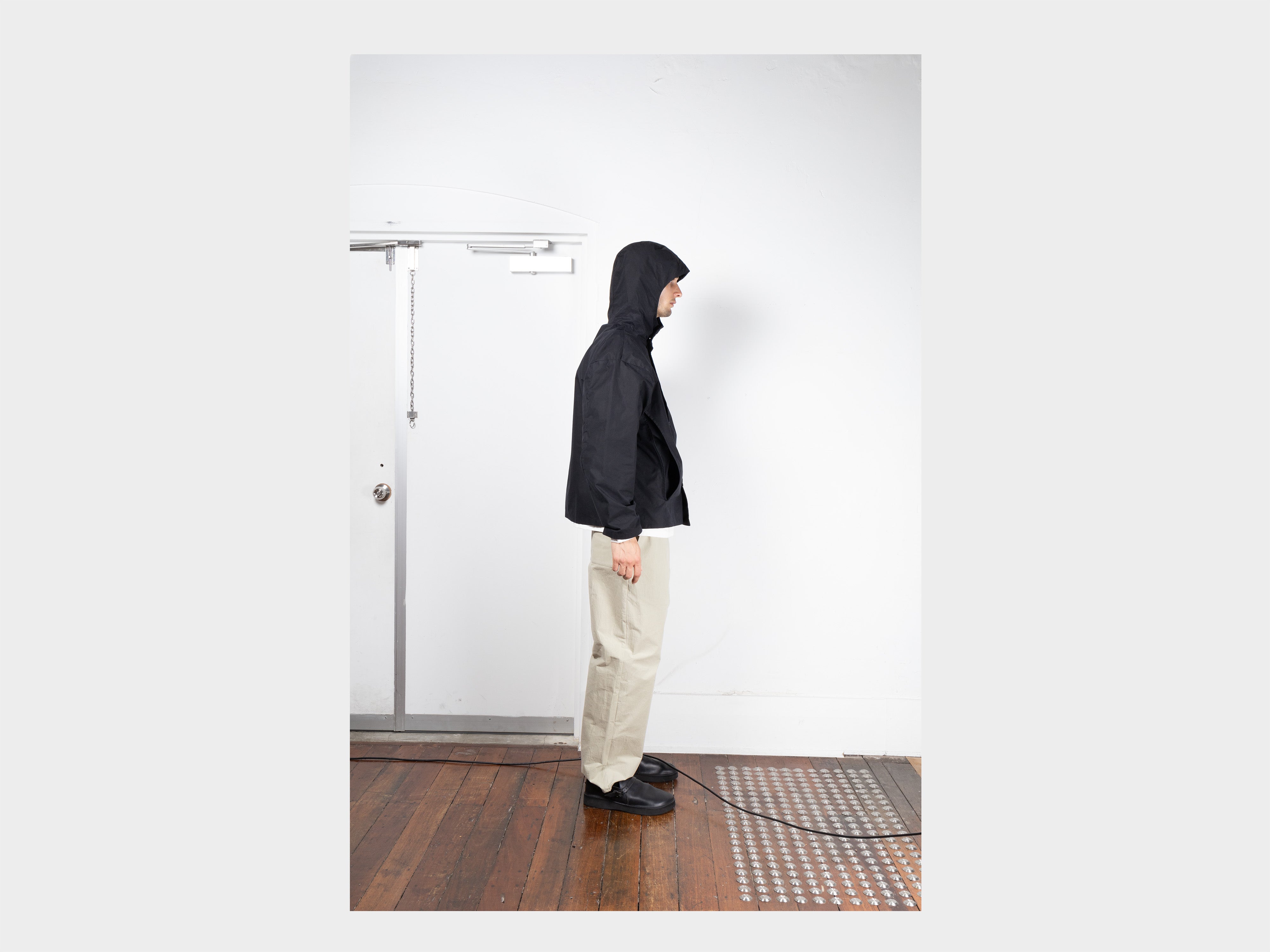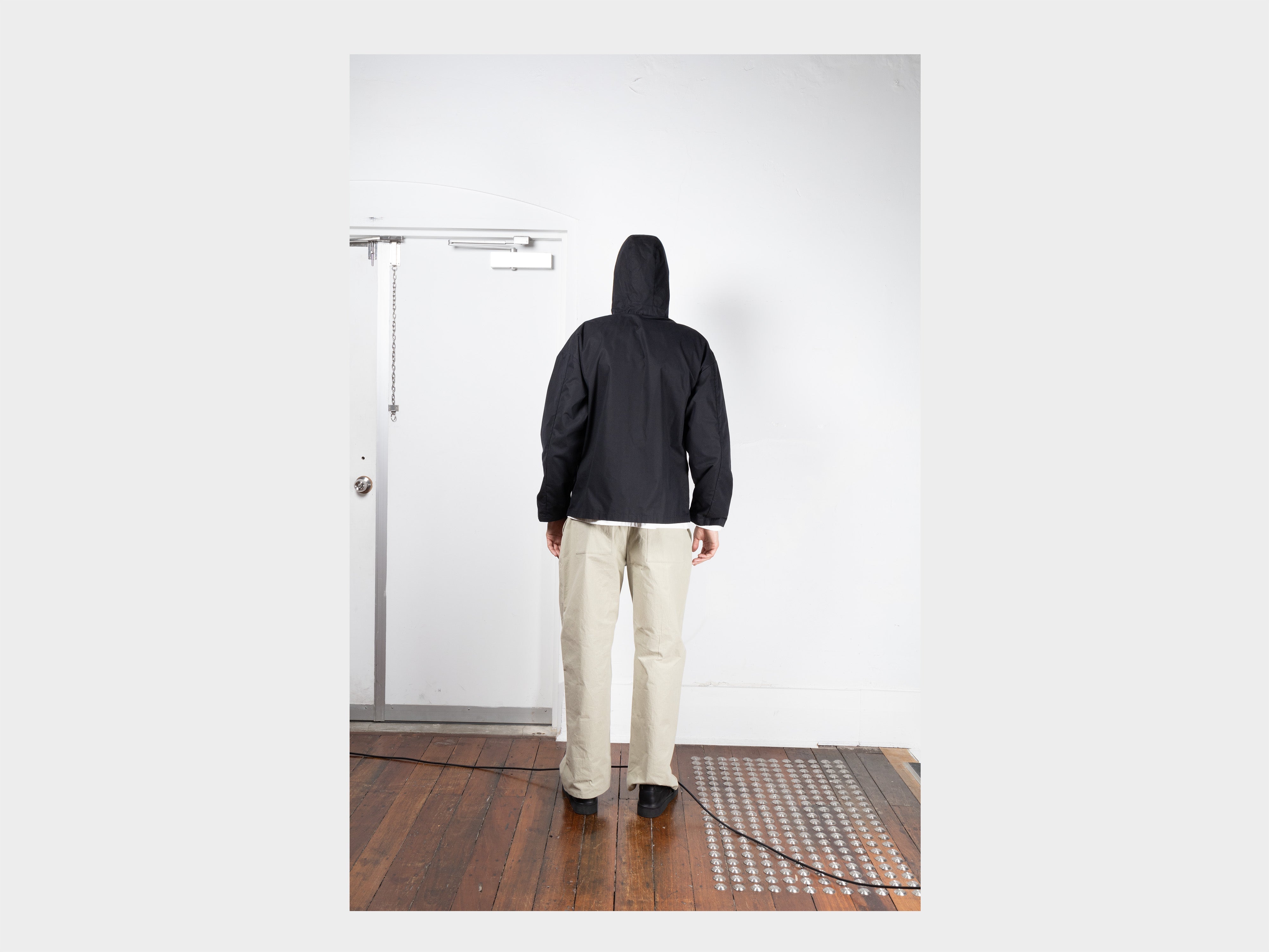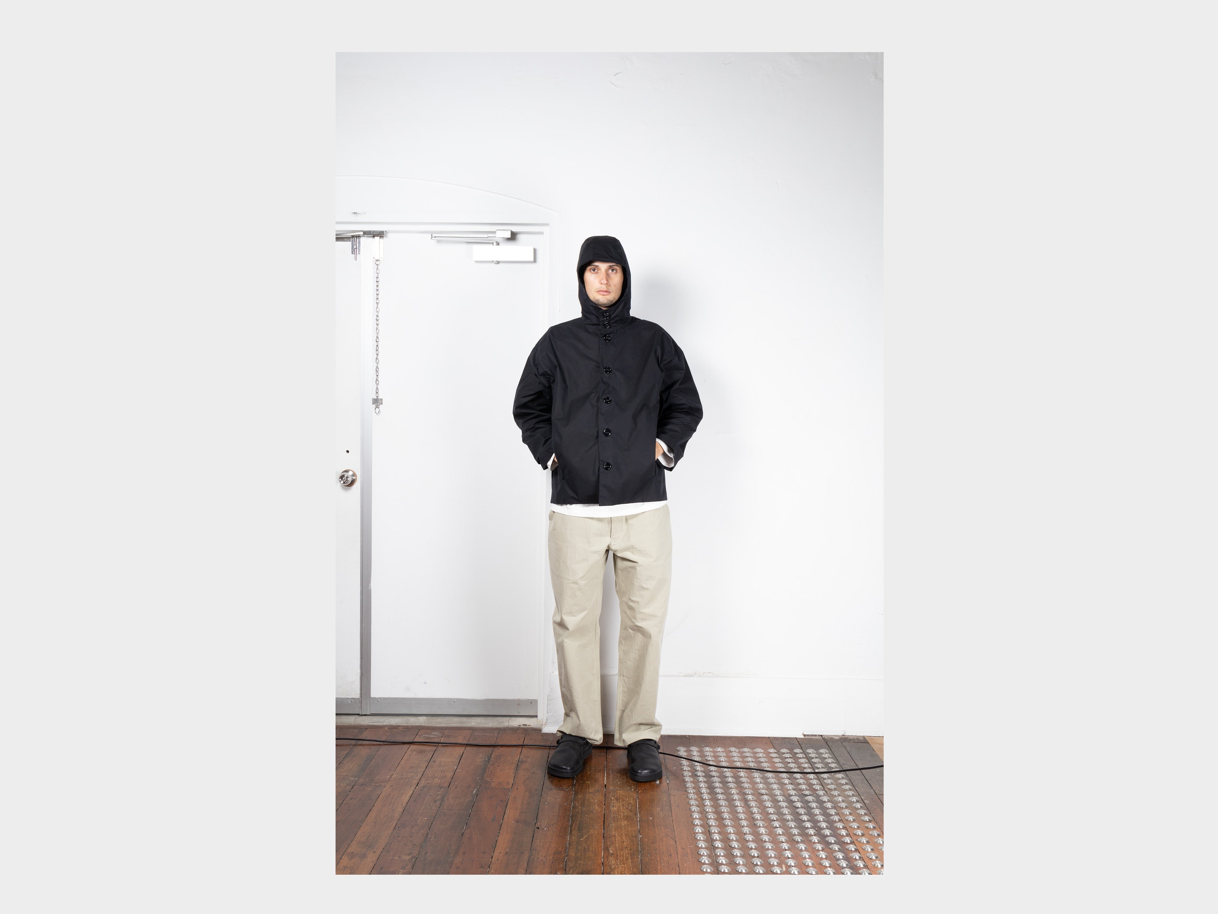 +Hooded jacket with a loose, slightly cropped fit. Self-lined front and hood, enlarged slot buttons threaded onto seatbelt tape, slashed pockets that extend from the armholes. Made in Japan.