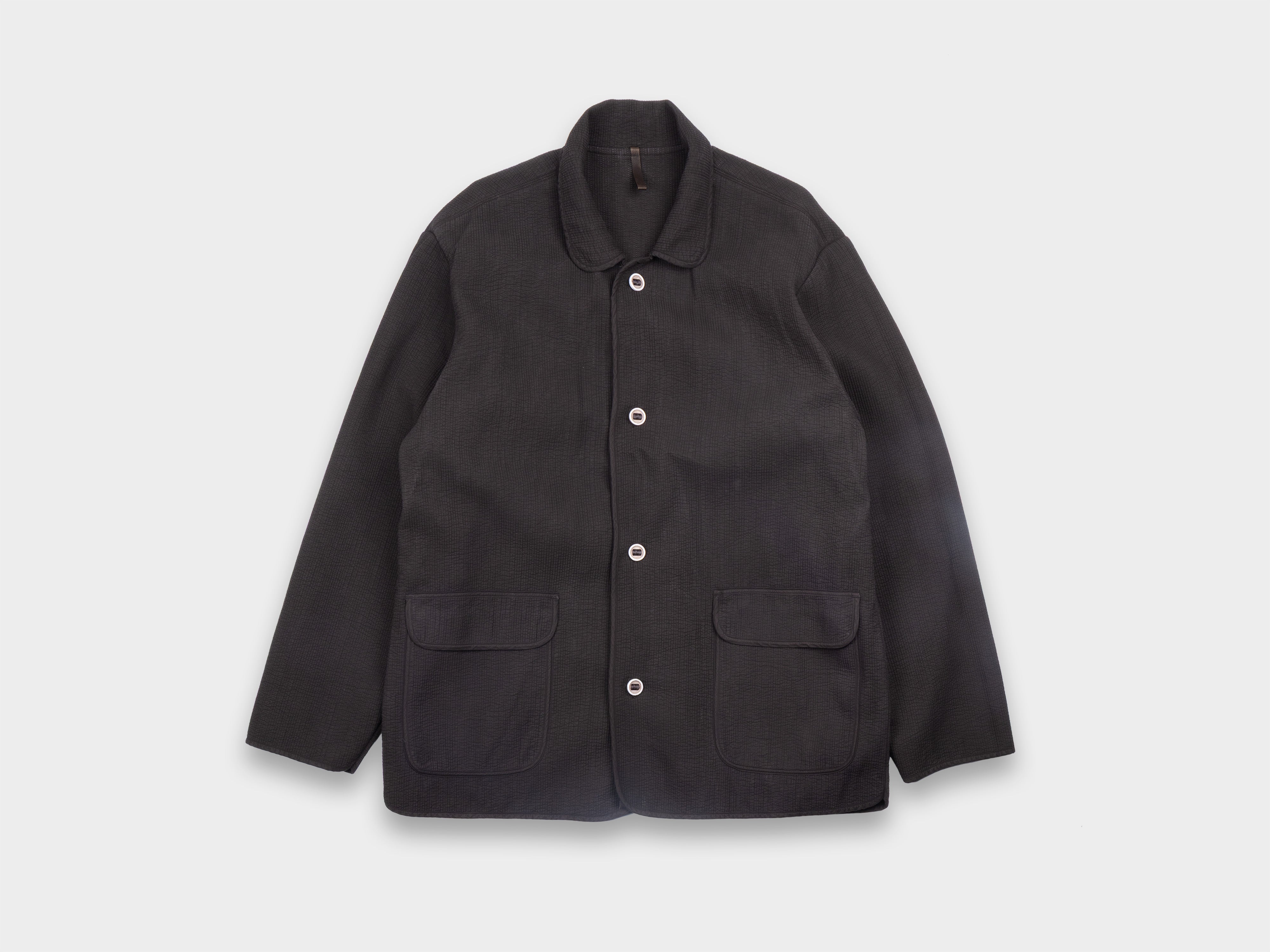 Loose fitting chore coat. Enlarged patch pockets with flap closures, curved collar, straight hem, slot buttons threaded onto seatbelt tape. Each panel individually bound before seams are sewn using traditional Korean techniques. Dyeing commissioned to iconic mud works Kanai Kougei, based in Amami-Ōshima. Master craftsman Yukihito Kanai works to preserve ancient Dorozome techniques of the island using materials within reach. Made in Japan.