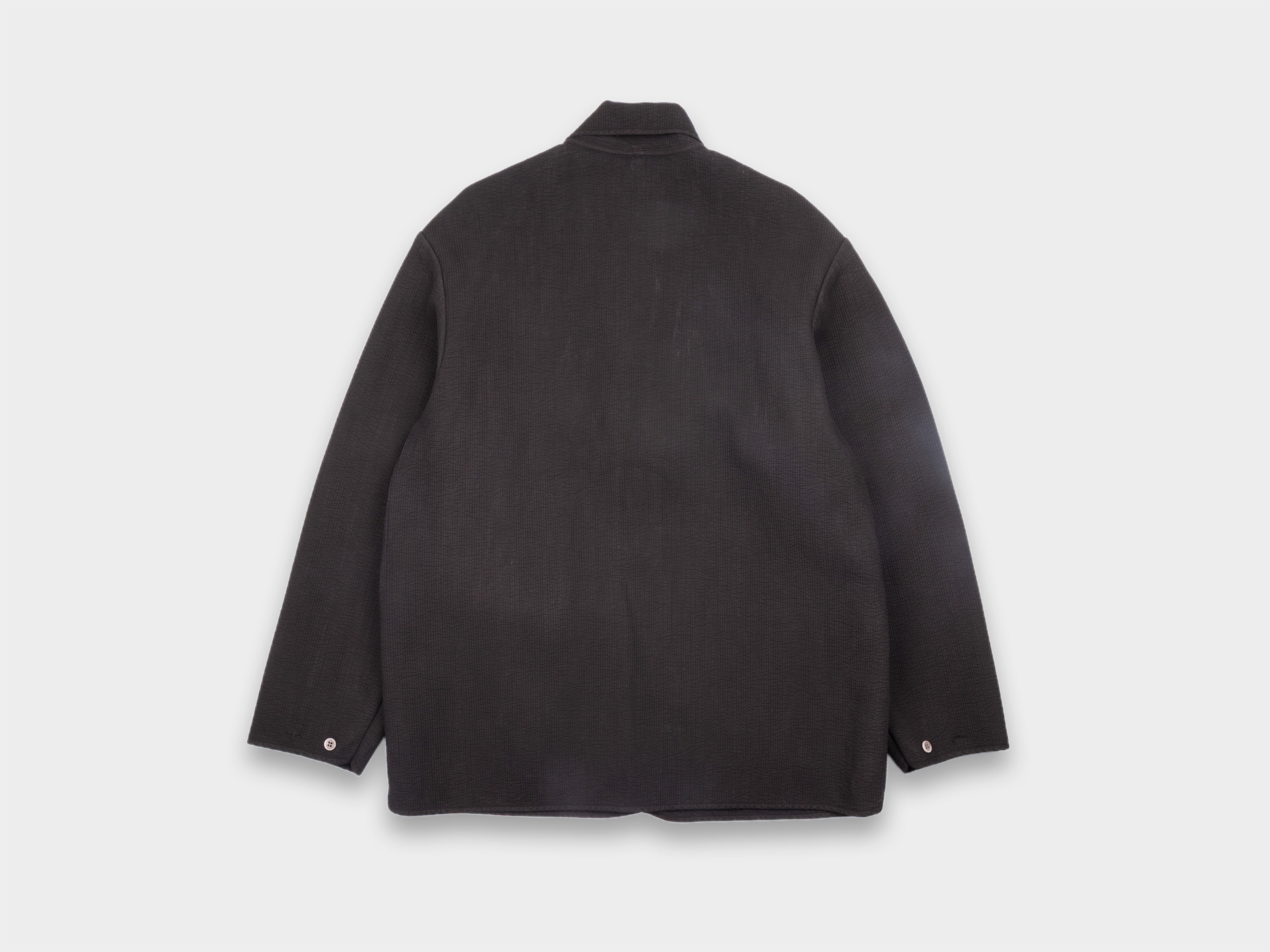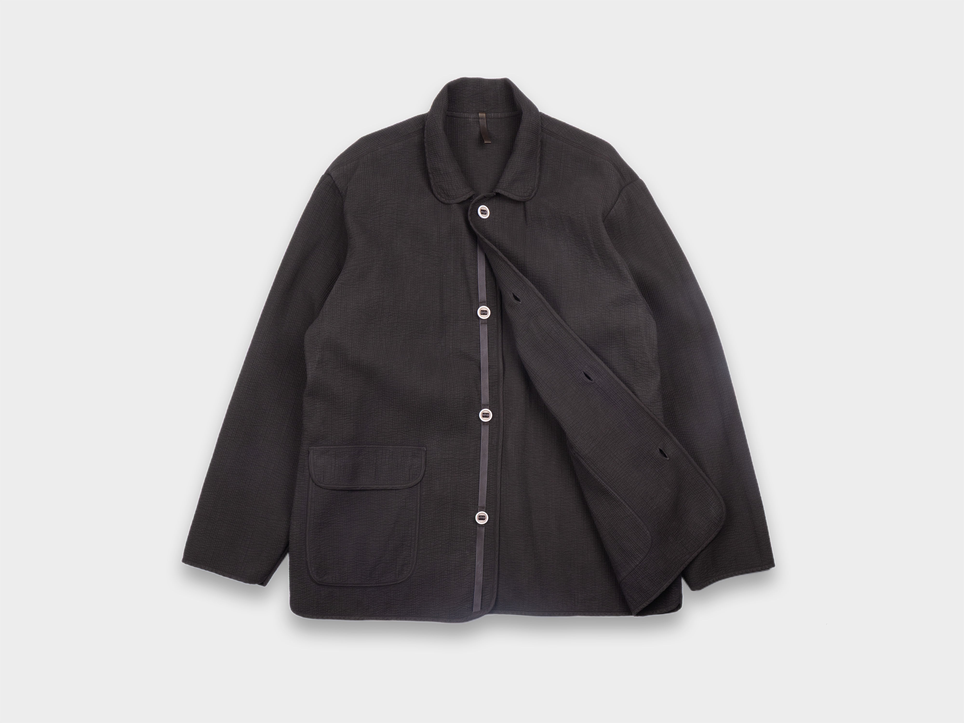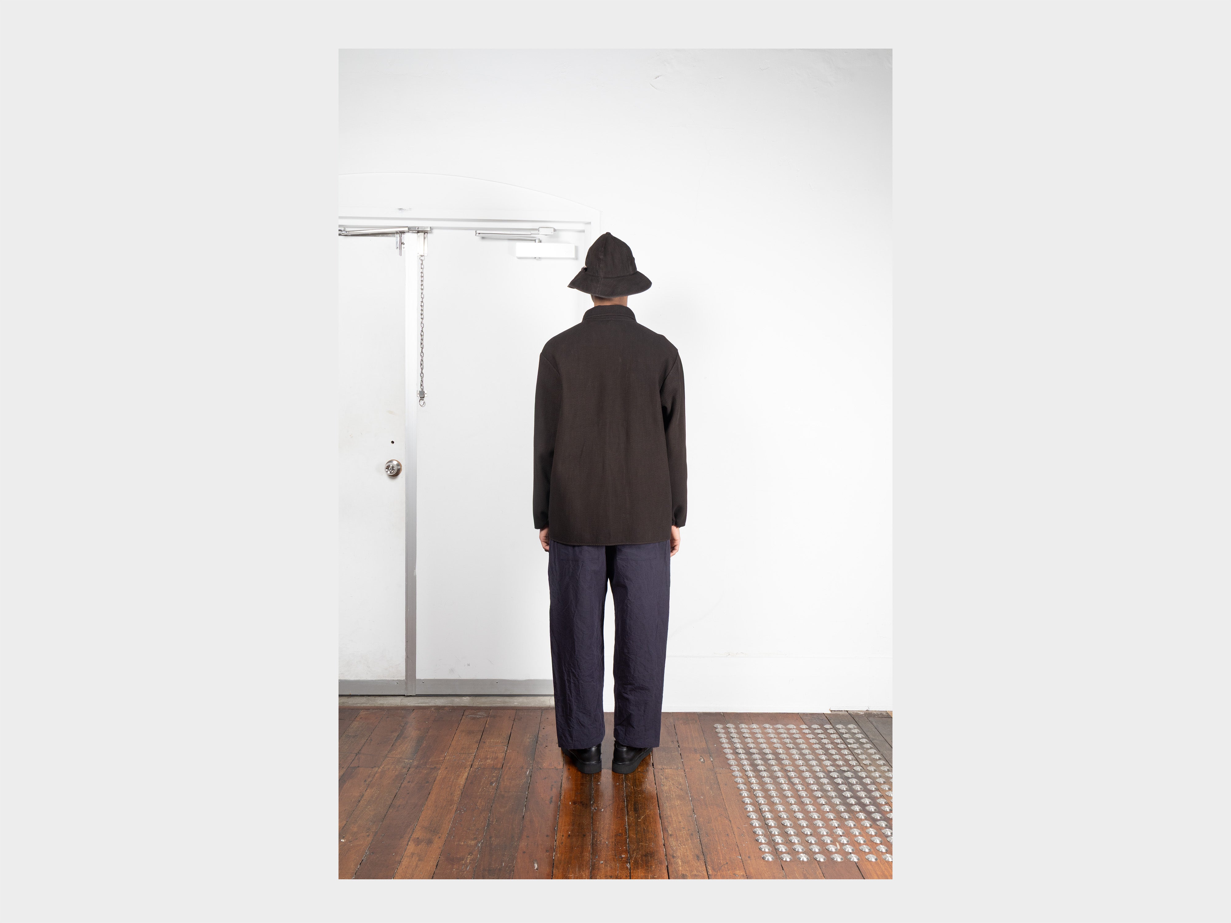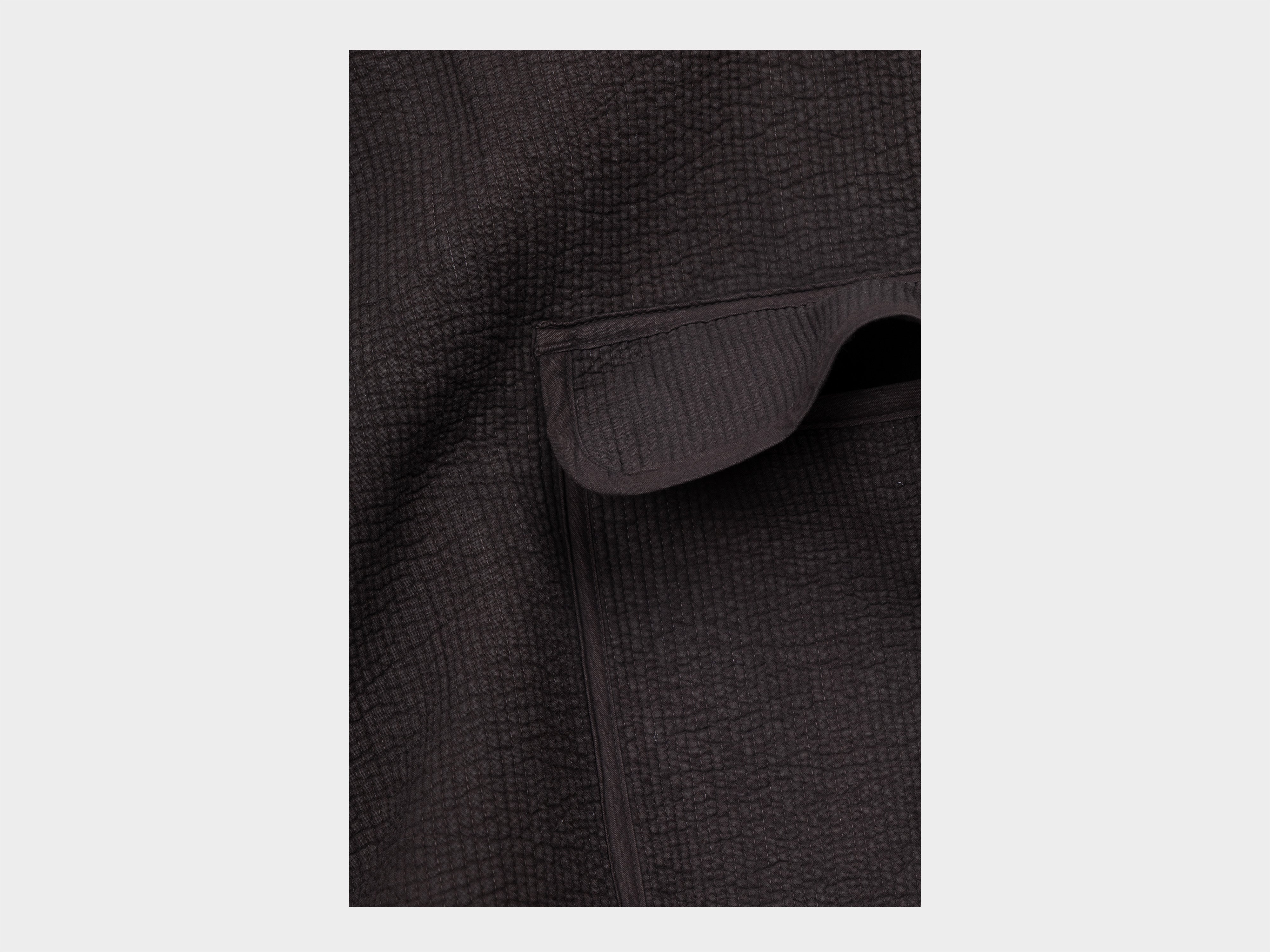 100% cotton layers / 100% polyester fill, 3mm stitched wales. Soft-type Nubi cloth, over-dyed by hand using ancient Dorozome (mud-dyeing) techniques of Amami-Ōshima. Garment is dyed in a tannin-rich dye bath made from the bark of locally found Sharinbai trees, then repeatedly immersed in the island's iron-rich mud, dorotetsu. Depth of colour is achieved through chemical reaction and layered immersion, and will evolve with washing and wear. Woven for MAN-TLE in Daegu, South Korea, and hand-dyed in Amami-Ōshima, Japan.