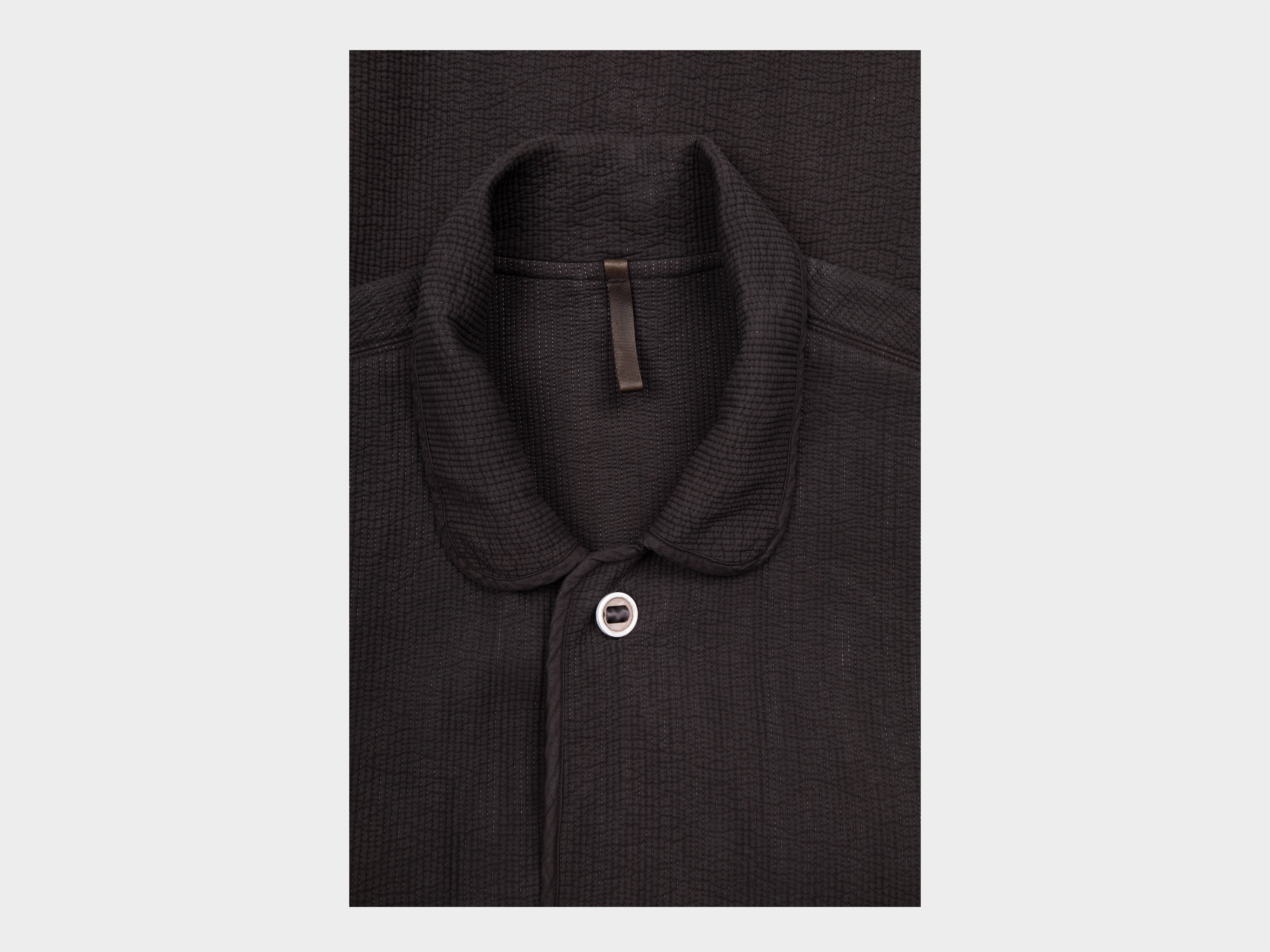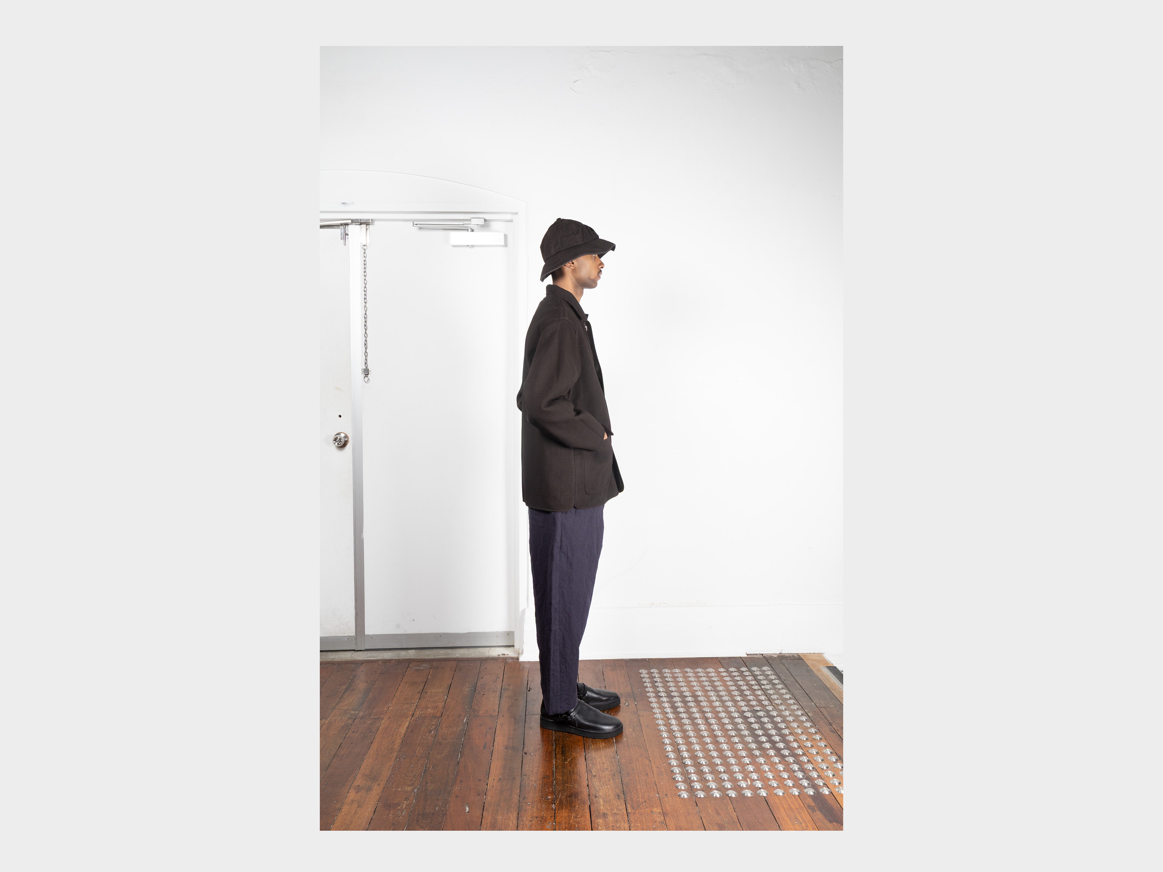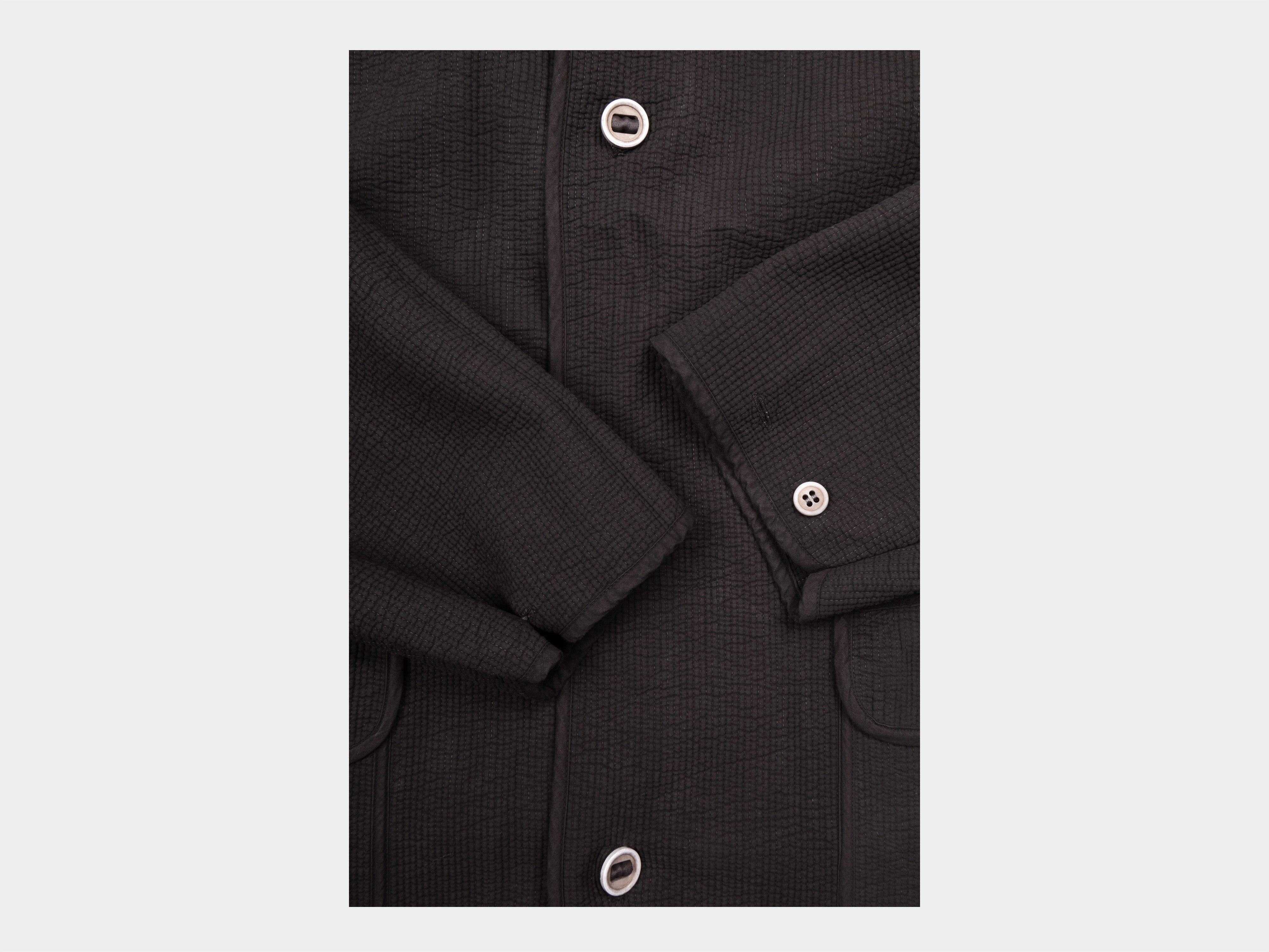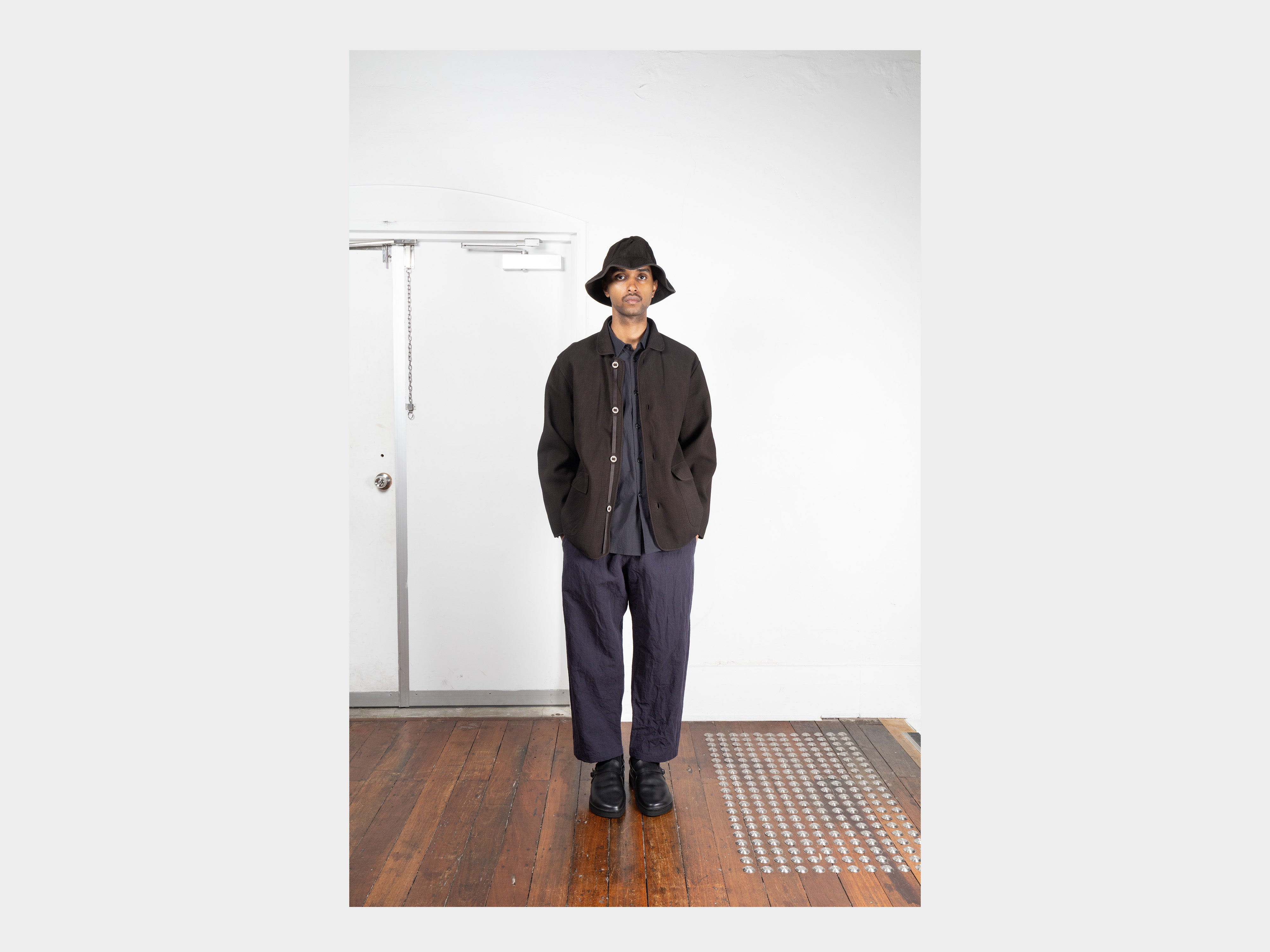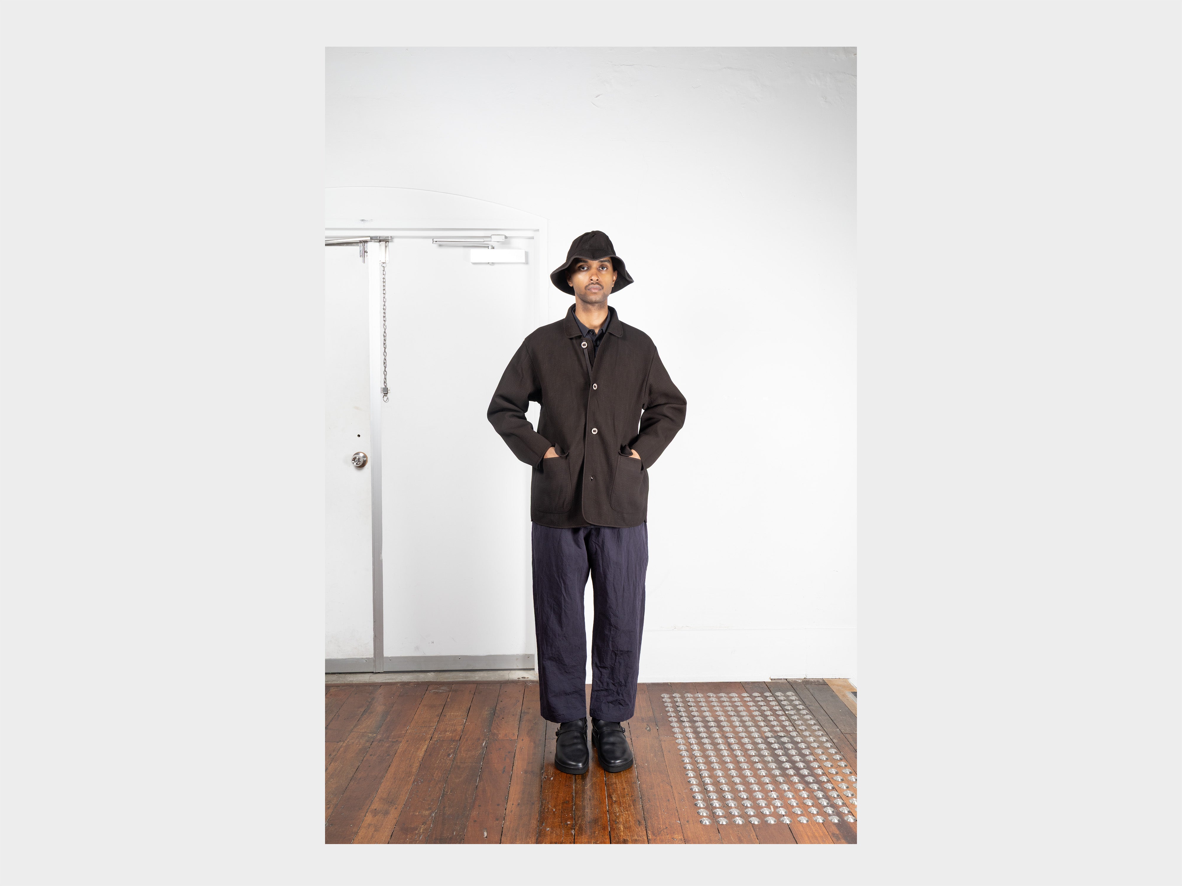 100% cotton layers / 100% polyester fill, 3mm stitched wales. Soft-type Nubi cloth, over-dyed by hand using ancient Dorozome (mud-dyeing) techniques of Amami-Ōshima. Garment is dyed in a tannin-rich dye bath made from the bark of locally found Sharinbai trees, then repeatedly immersed in the island's iron-rich mud, dorotetsu. Depth of colour is achieved through chemical reaction and layered immersion, and will evolve with washing and wear. Woven for MAN-TLE in Daegu, South Korea, and hand-dyed in Amami-Ōshima, Japan.