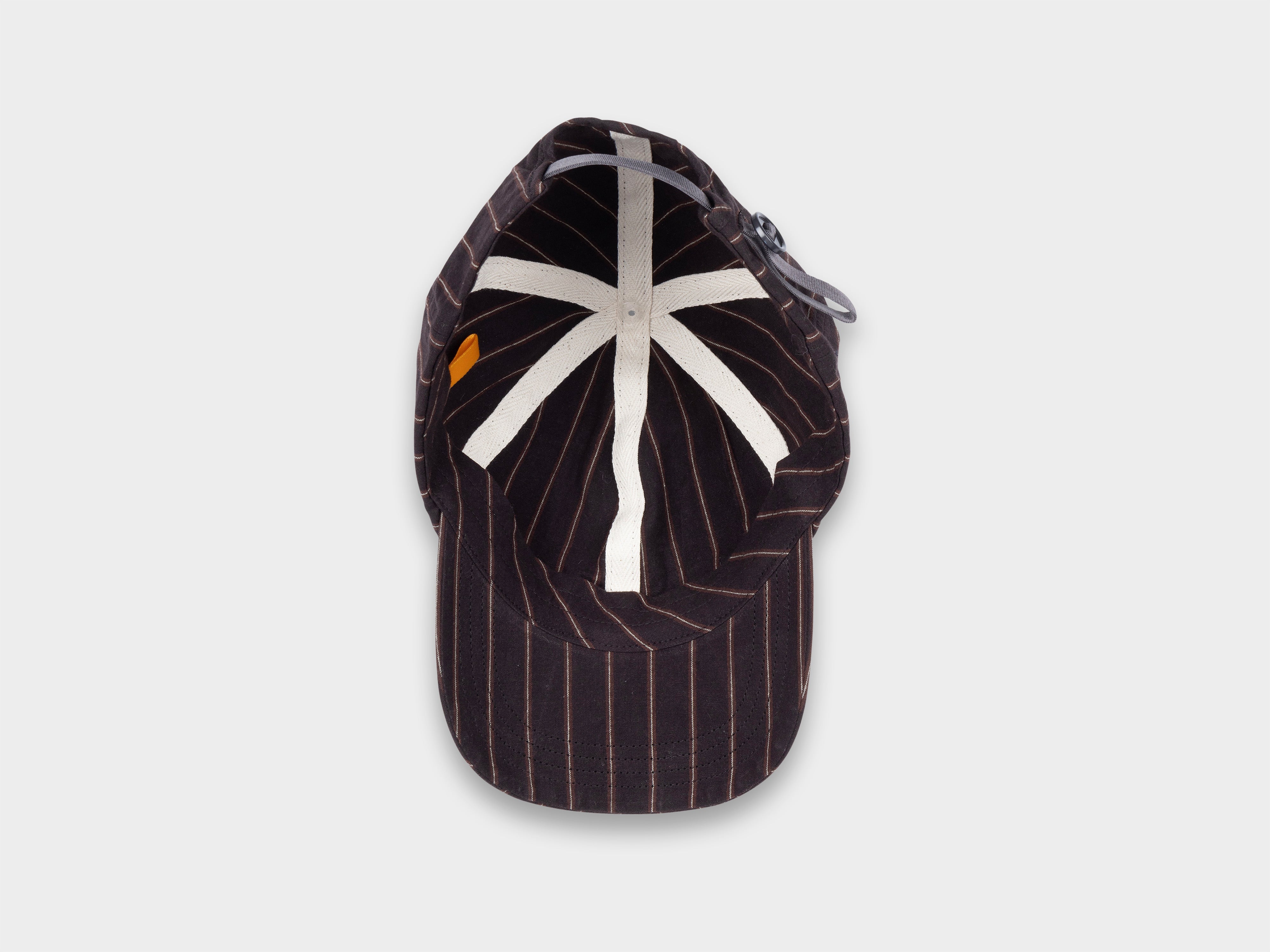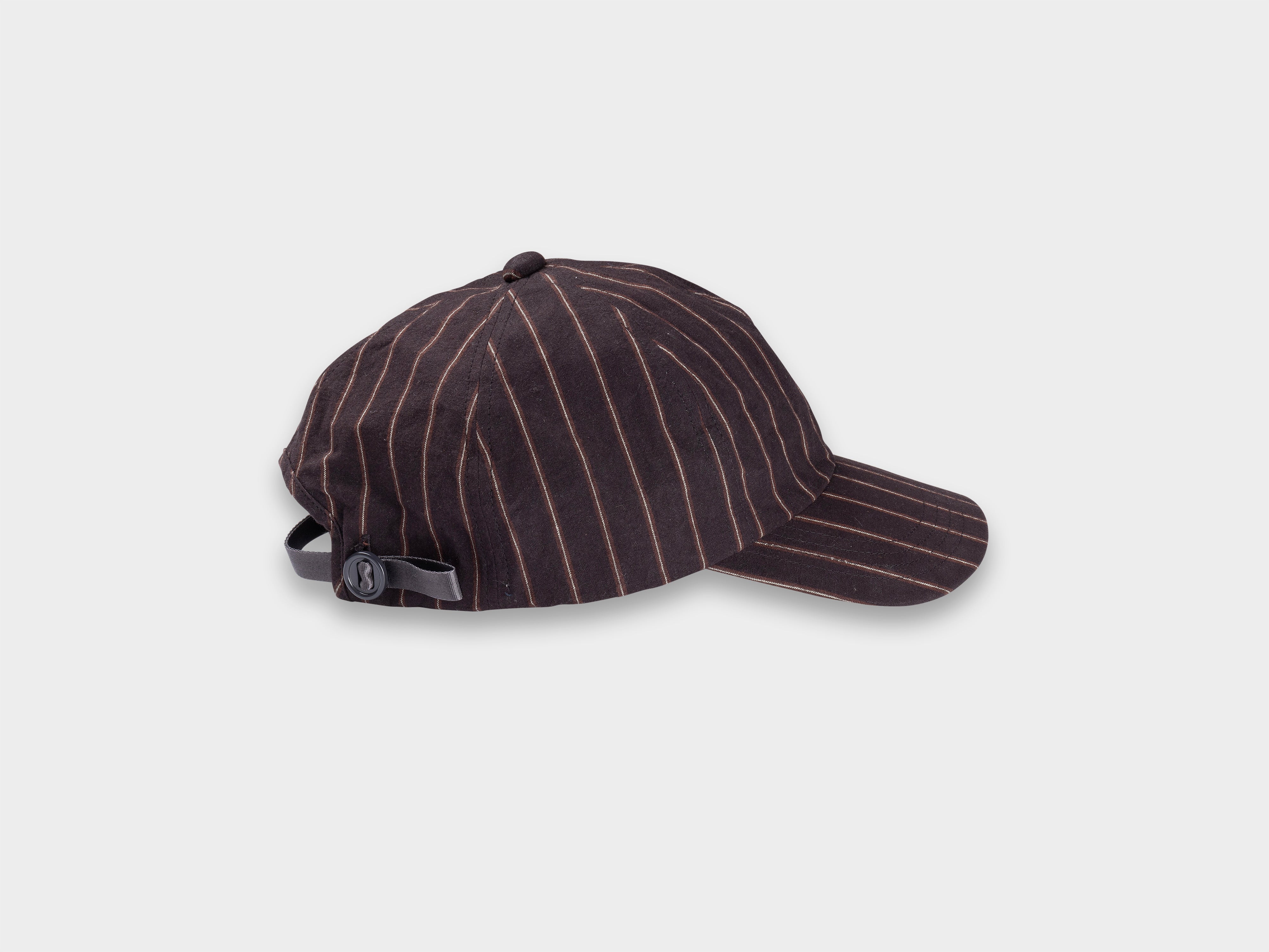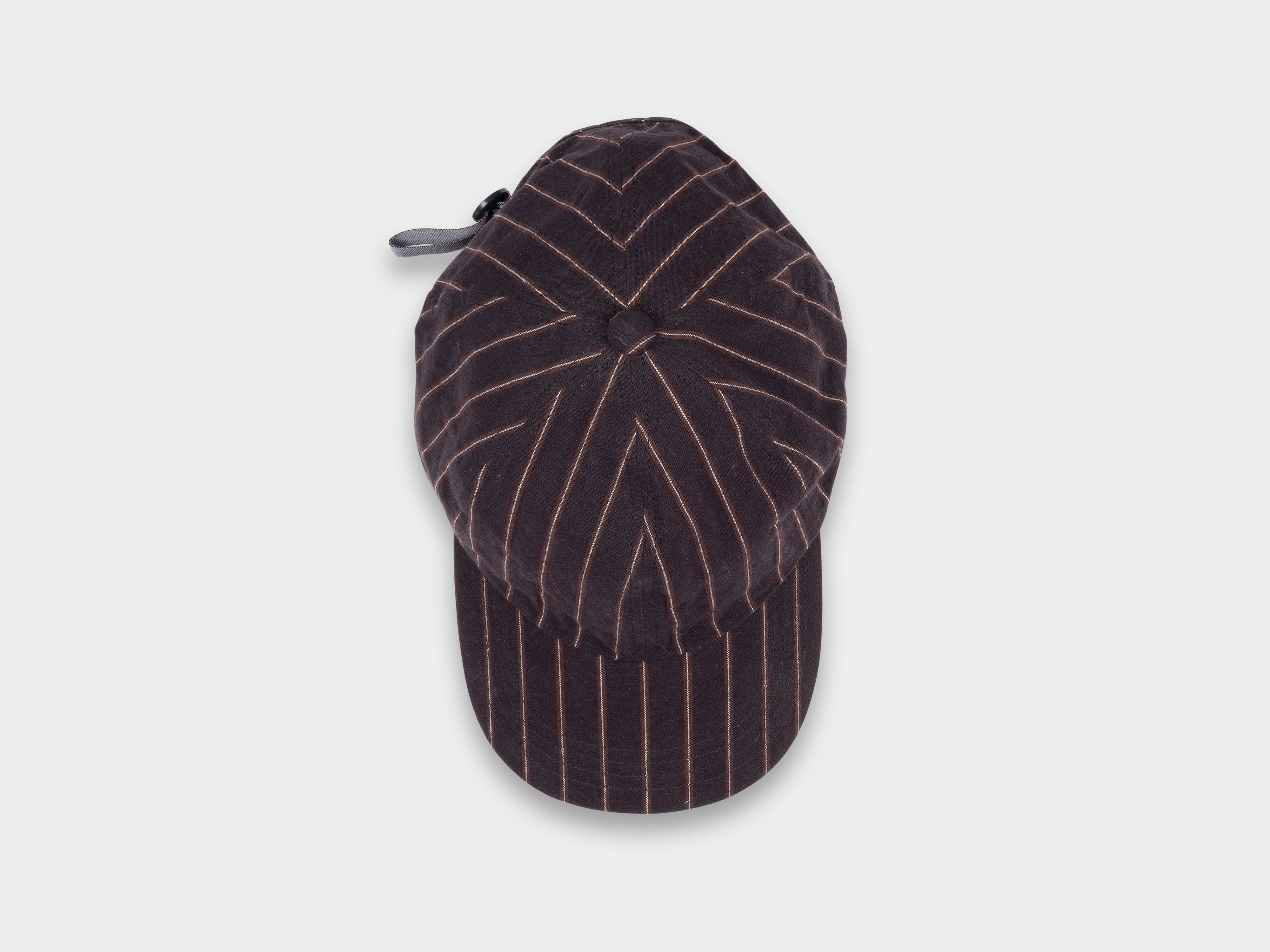 +Deep-cut six panel cap. Slot button threaded onto seatbelt tape, used to adjust size. Made in Japan.