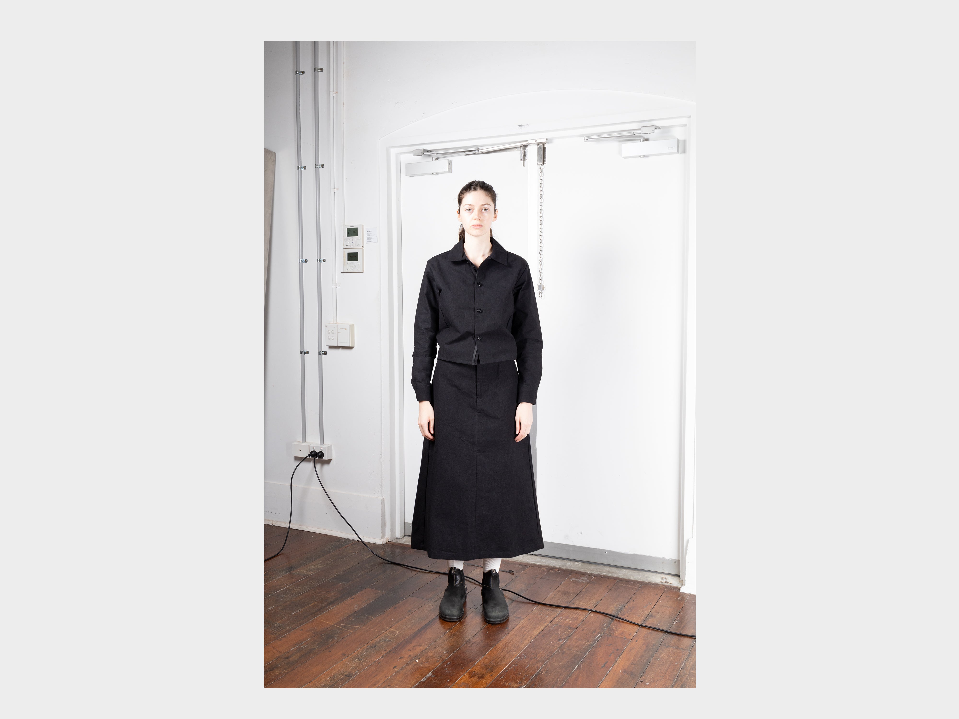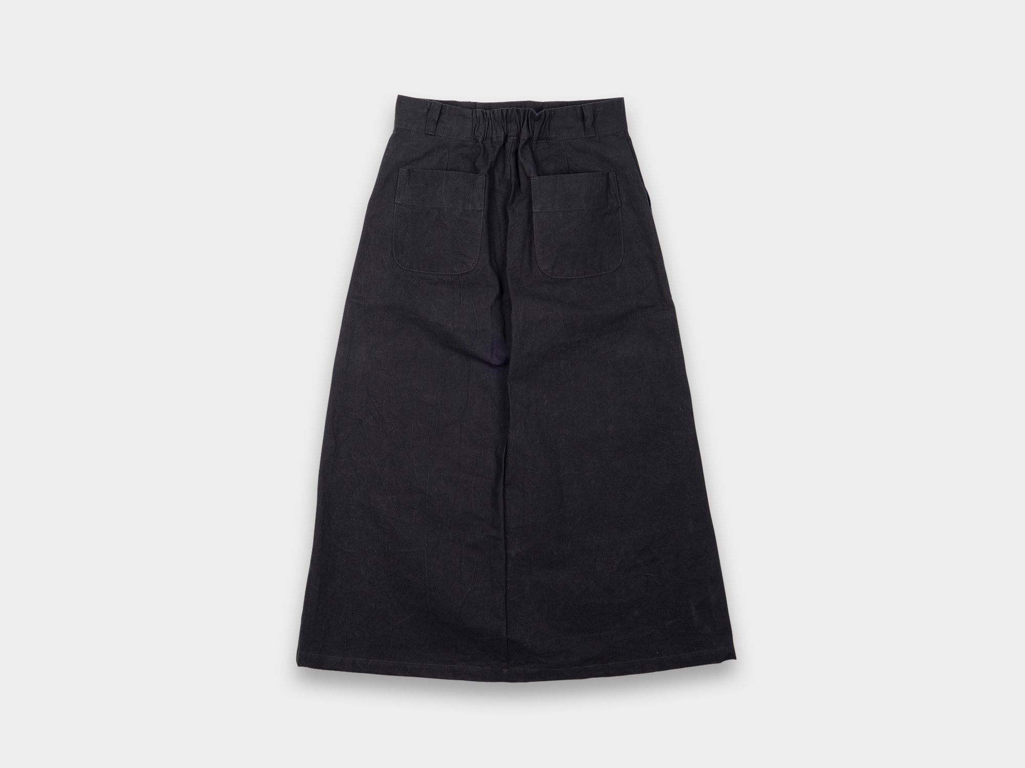 +A-line cropped length skirt. Seat belt tape with adjustable button at the front, belt loops, elastic gusset at back, side-seam pockets, back patch pockets. Made in Japan.