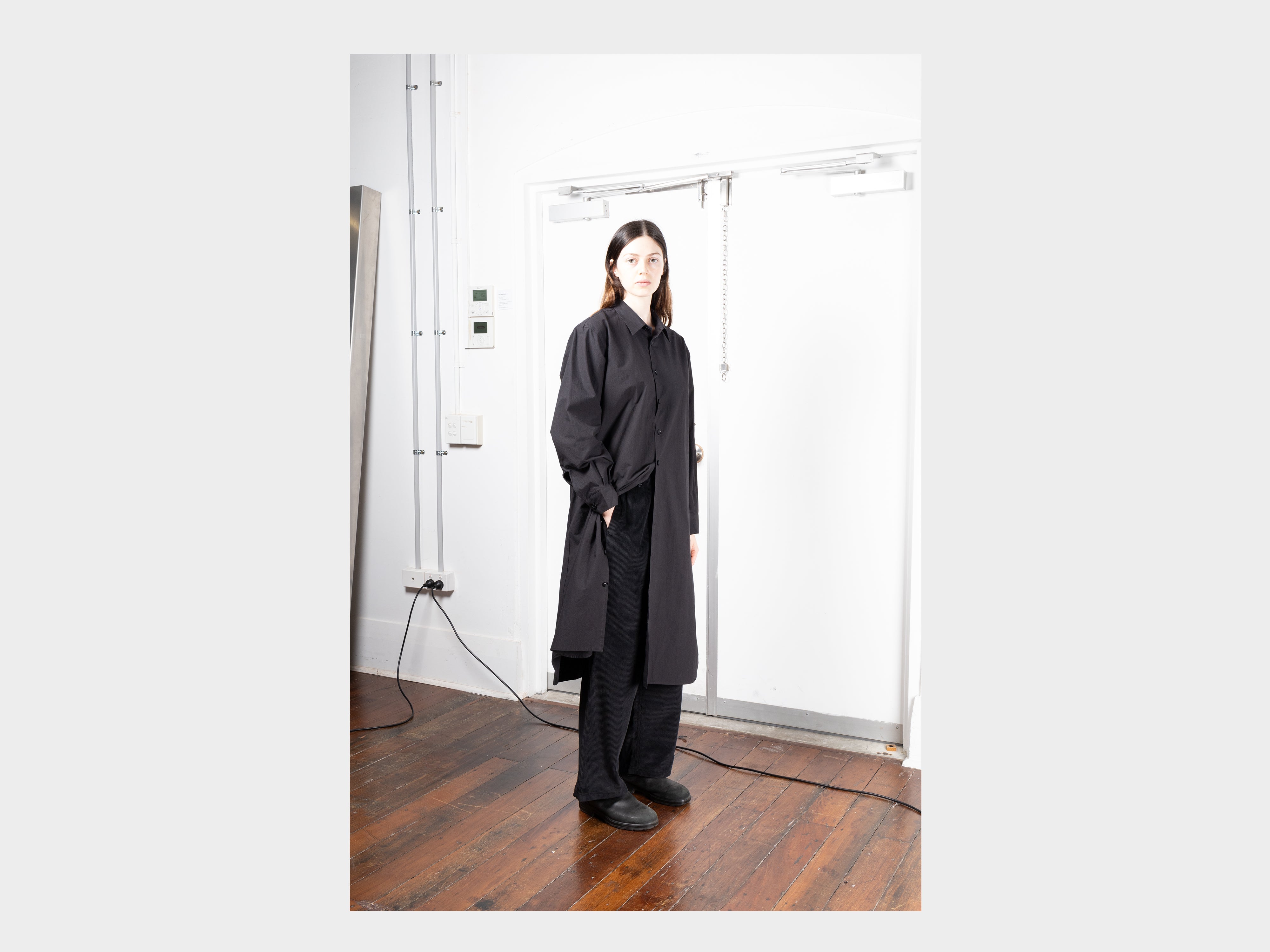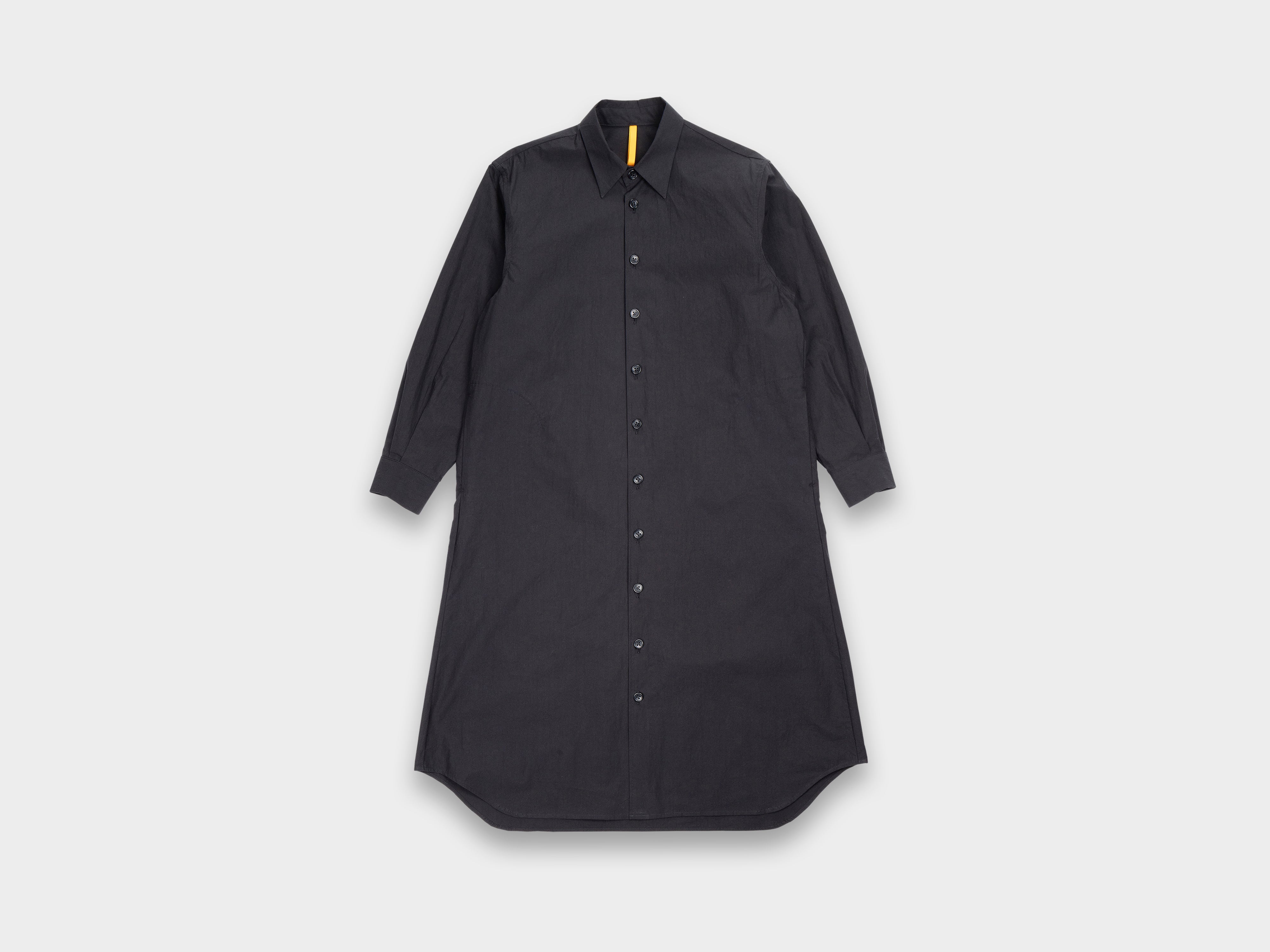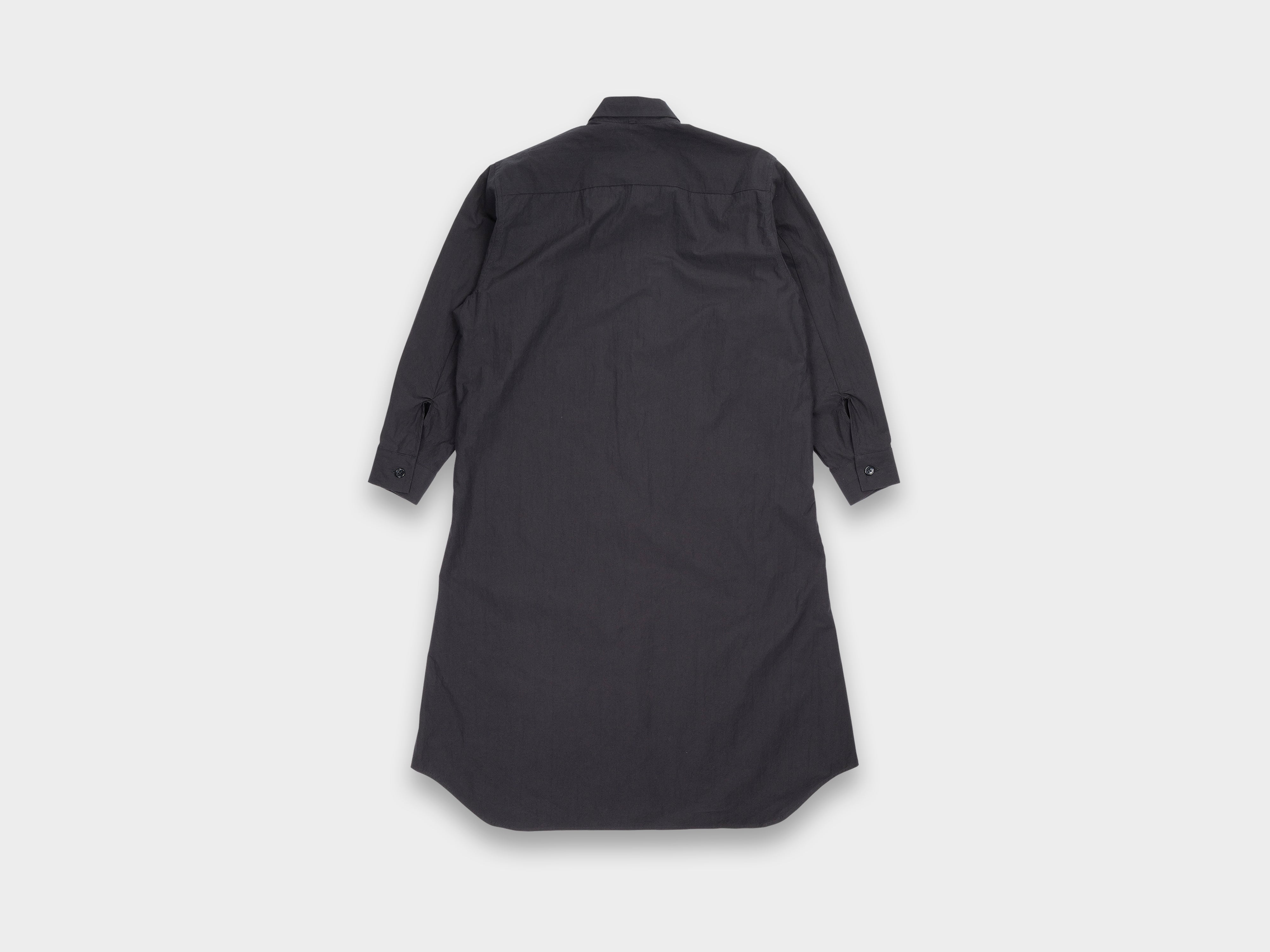 Relaxed a-line dress. Button front, pointed collar, side-seam pockets, full sleeves and pleated cuffs with single-button closure. Made in Japan.