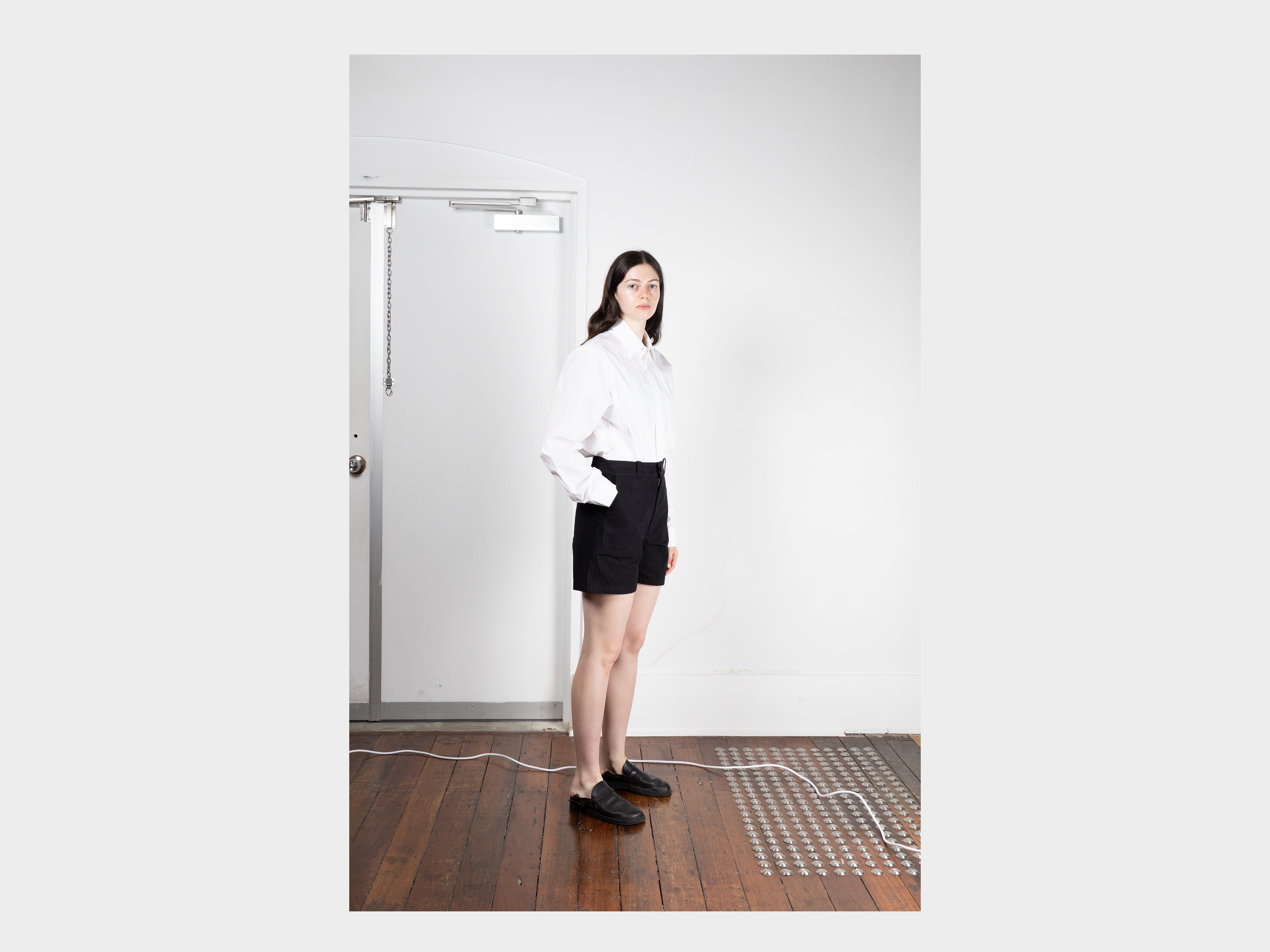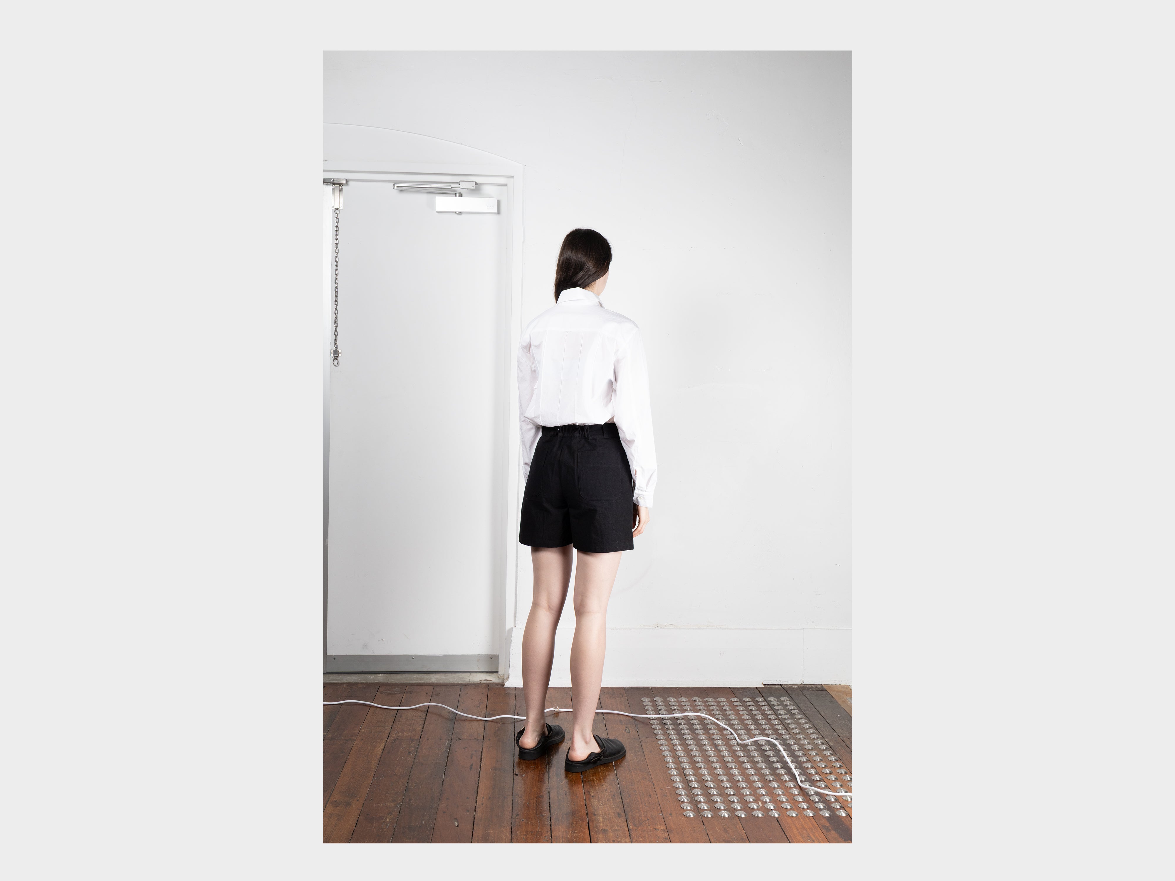 Shorts variation of the W-R0P4 "High-Wide Pants". Seat belt tape with adjustable button at the front, belt loops, elastic gusset at back, deep side pockets, back patch-pockets. Made in Japan.