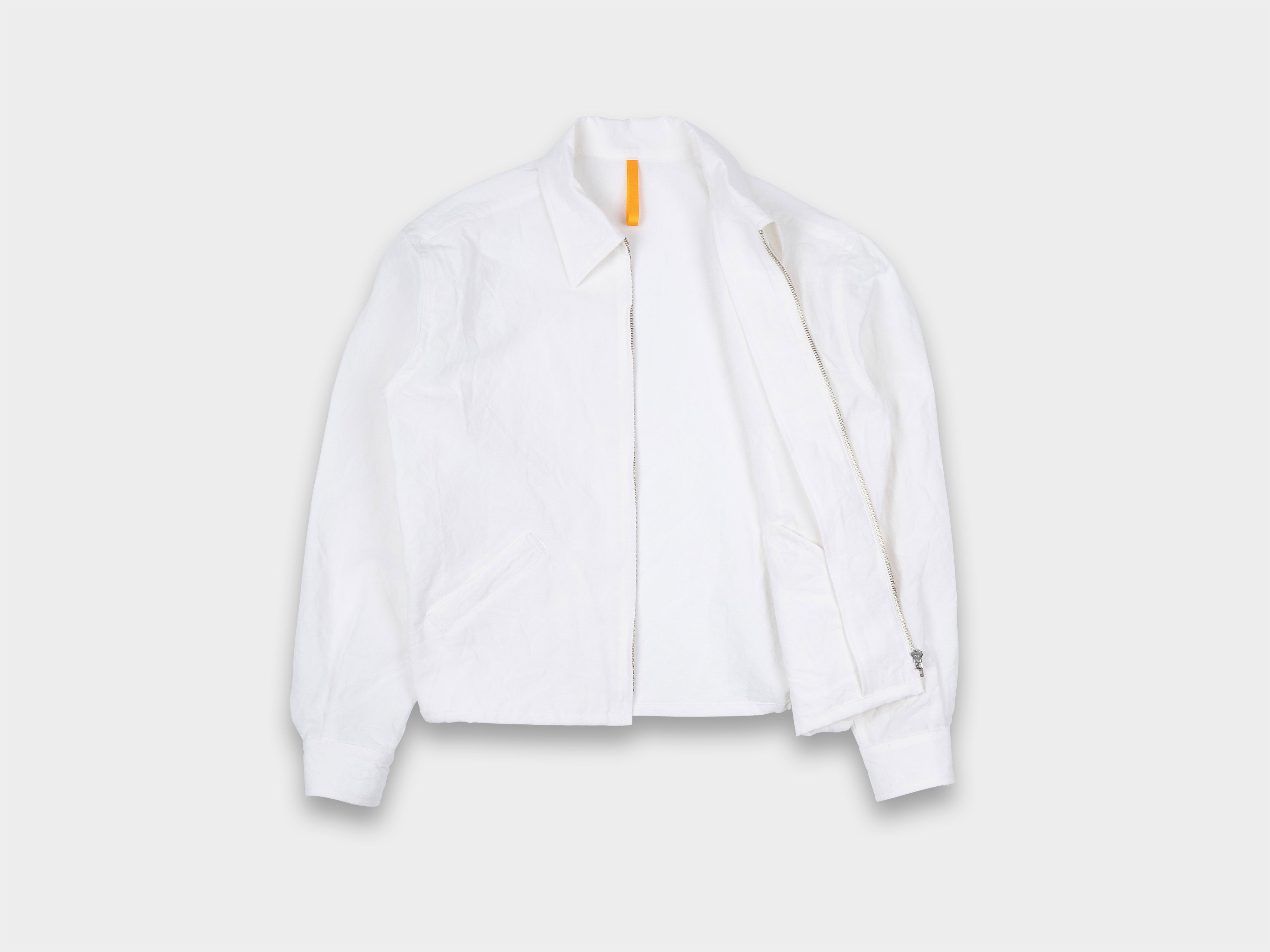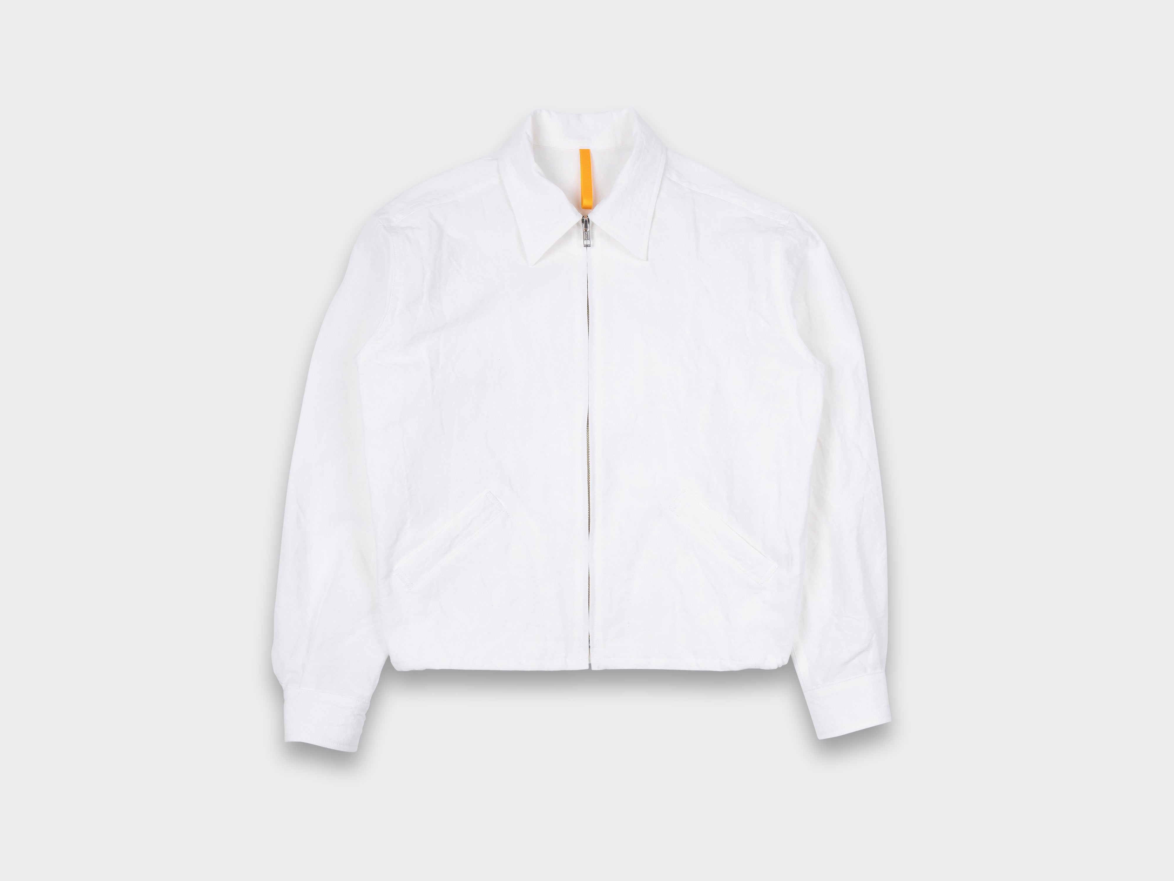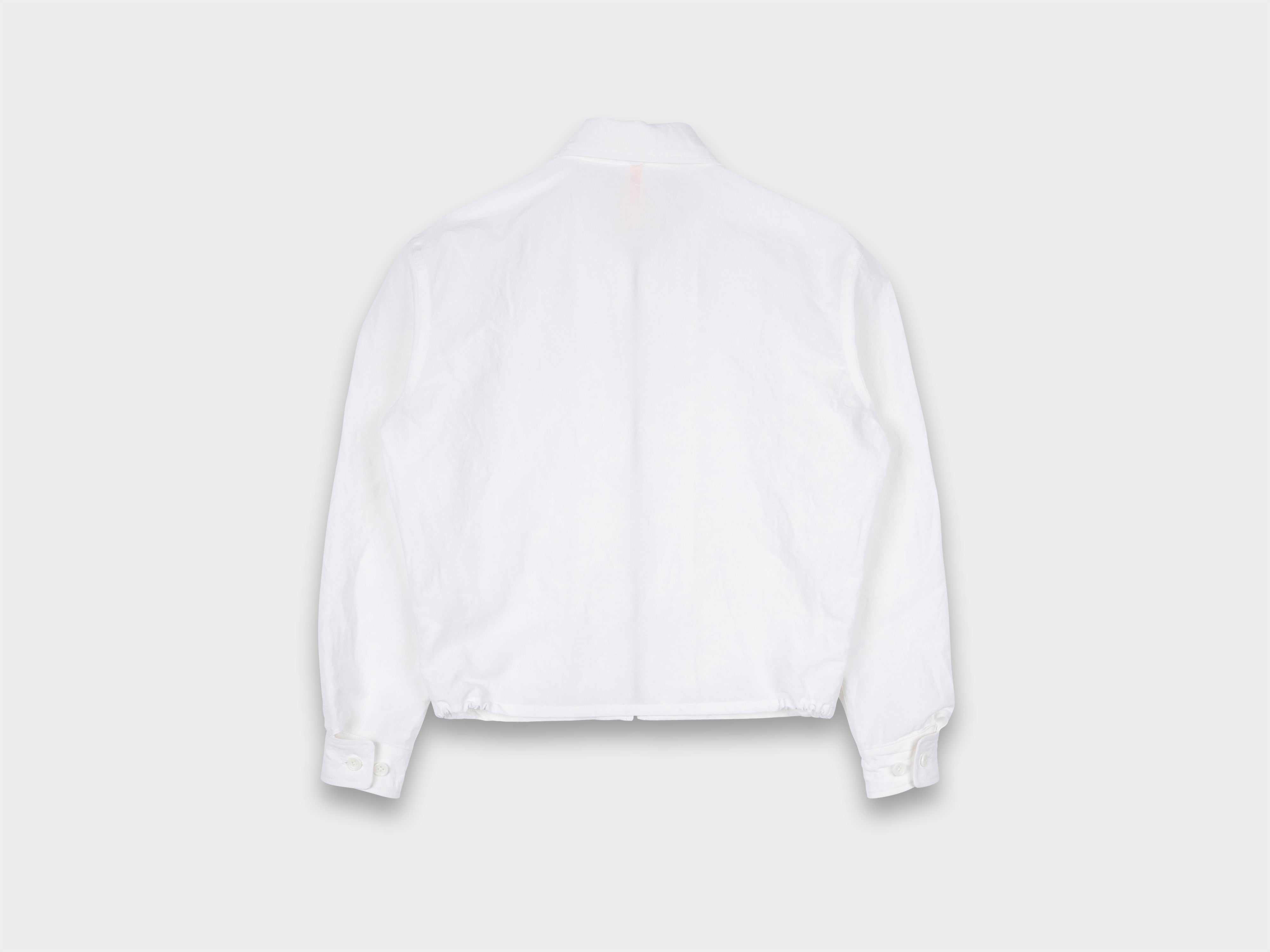 +Lightweight, unlined zip-up jacket with details from a 1950s swing top blouson. Front welt pockets, gathered elastic side hems, pleated cuffs with two-button closure, pointed collar. Made in Japan.