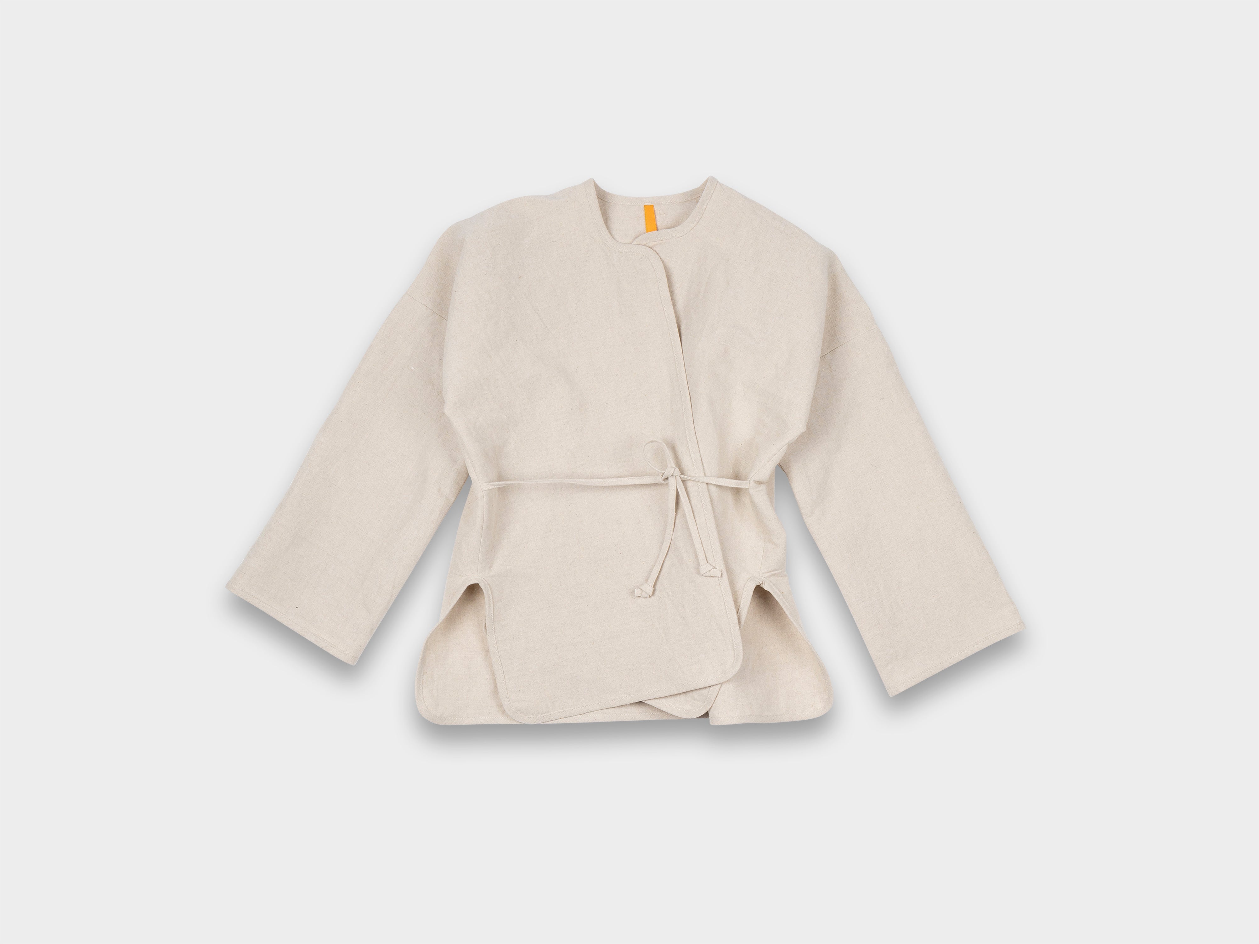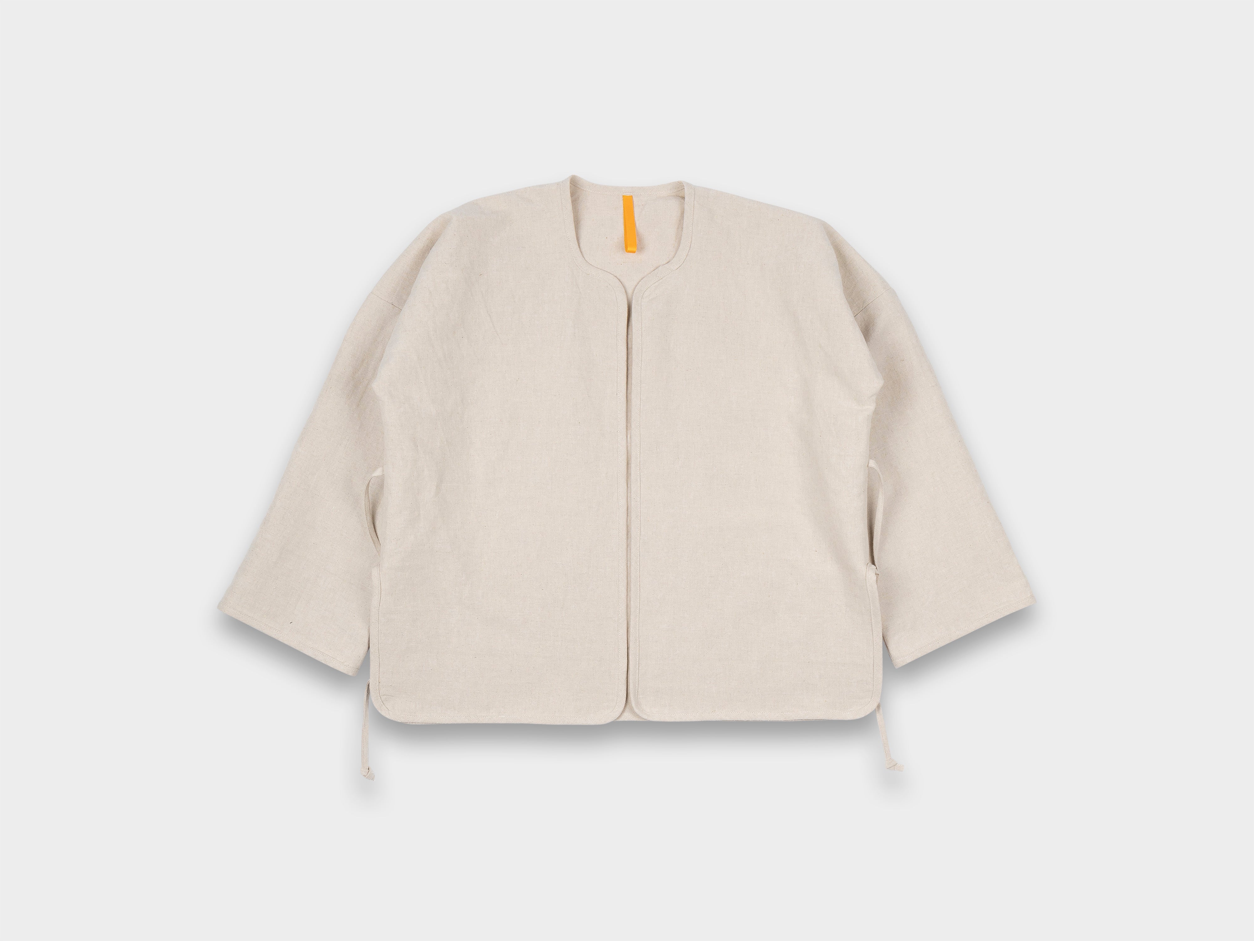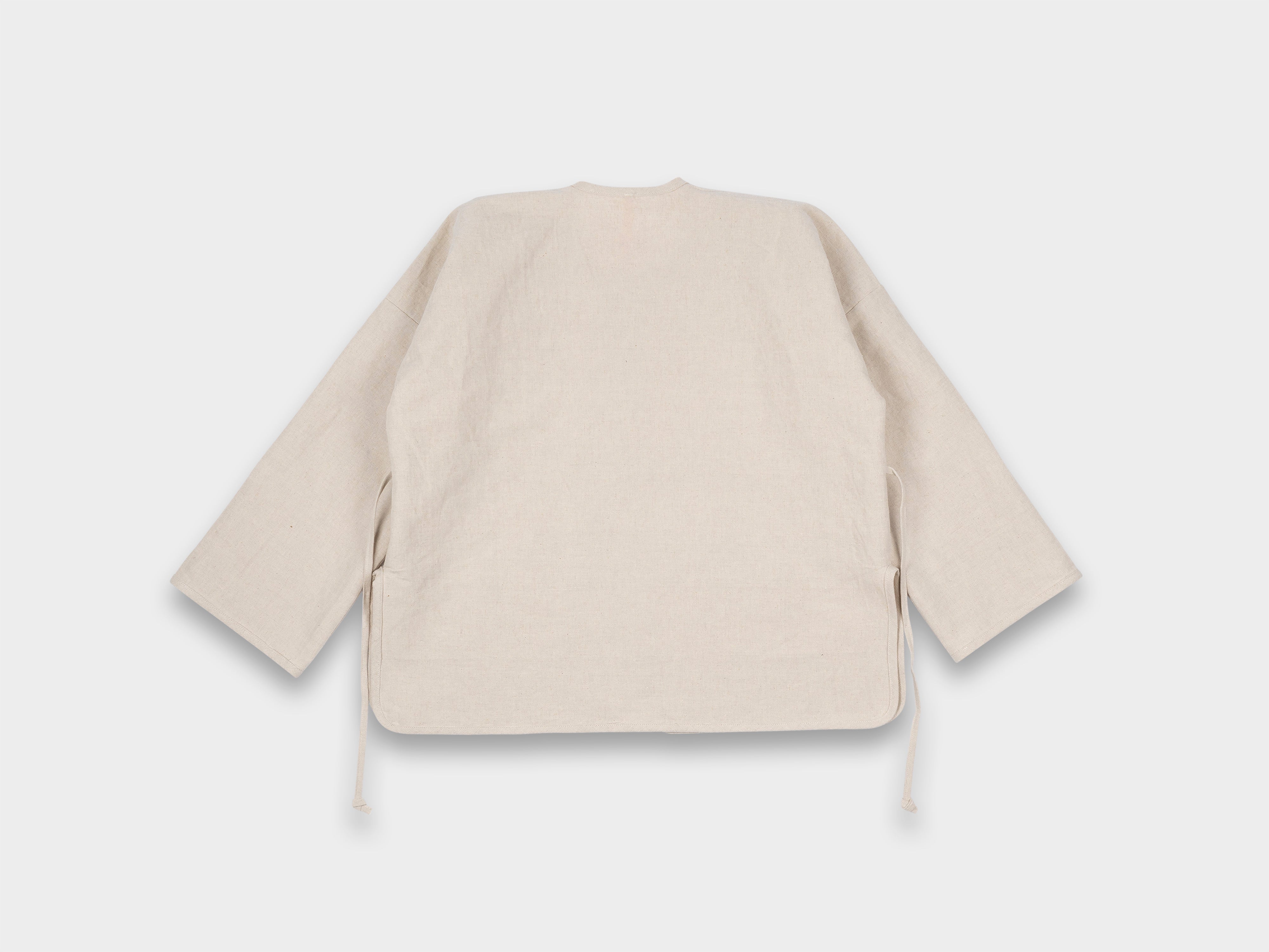 +53% linen / 33% cotton / 14% bamboo. Midweight buff cloth with dry, textural hand feel. Woven on a wooden shuttle loom in Shizuoka, Japan.
