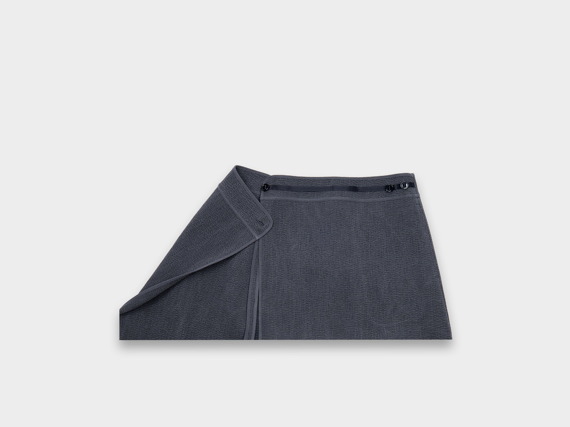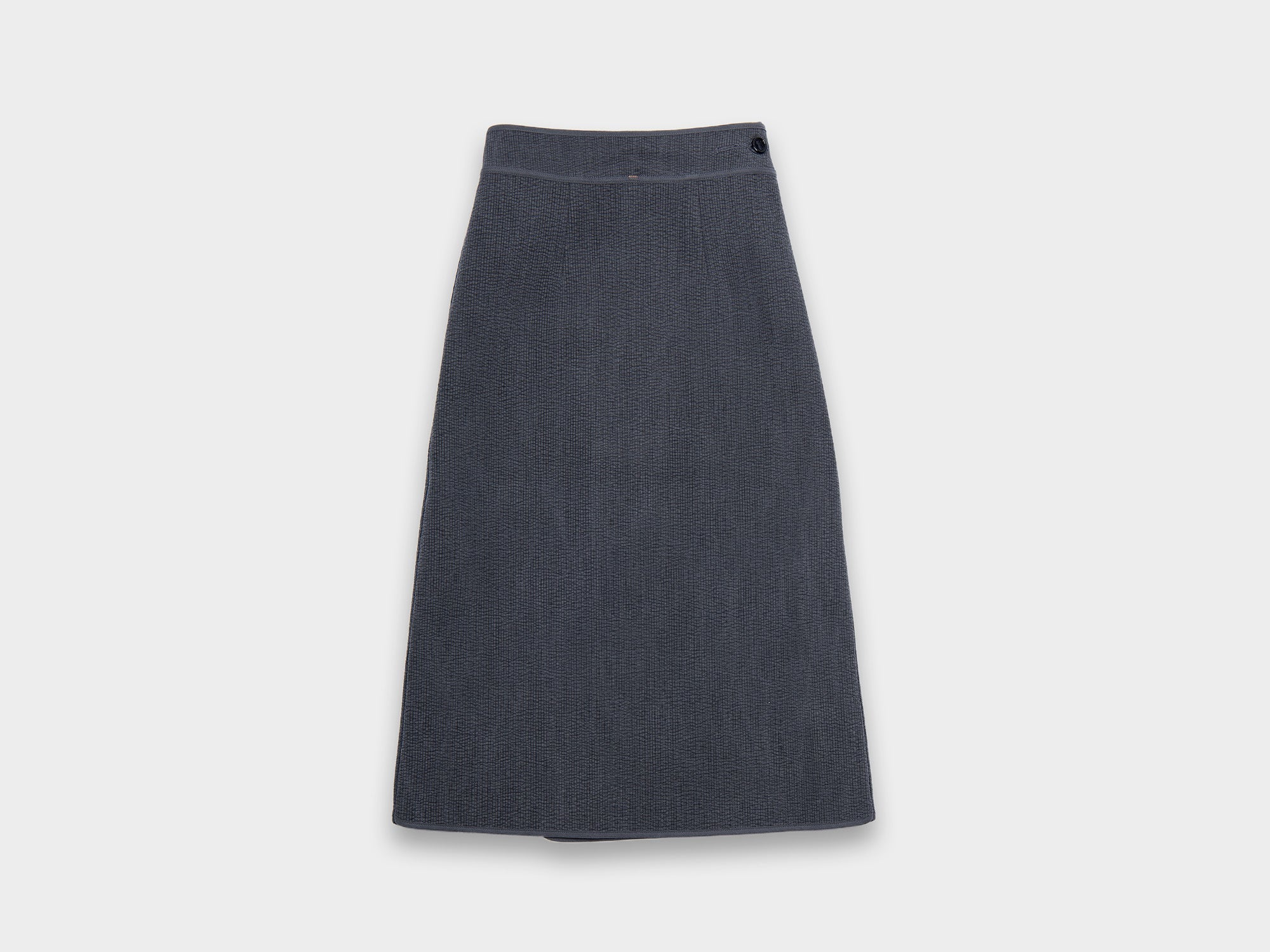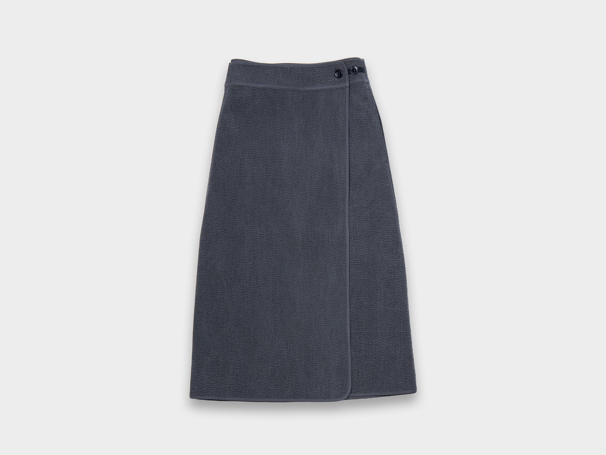 Adjustable wrap skirt. Left side pocket, slot buttons threaded onto seat belt tape. Each panel individually bound before seams are sewn. Made in Japan using traditional Korean techniques.