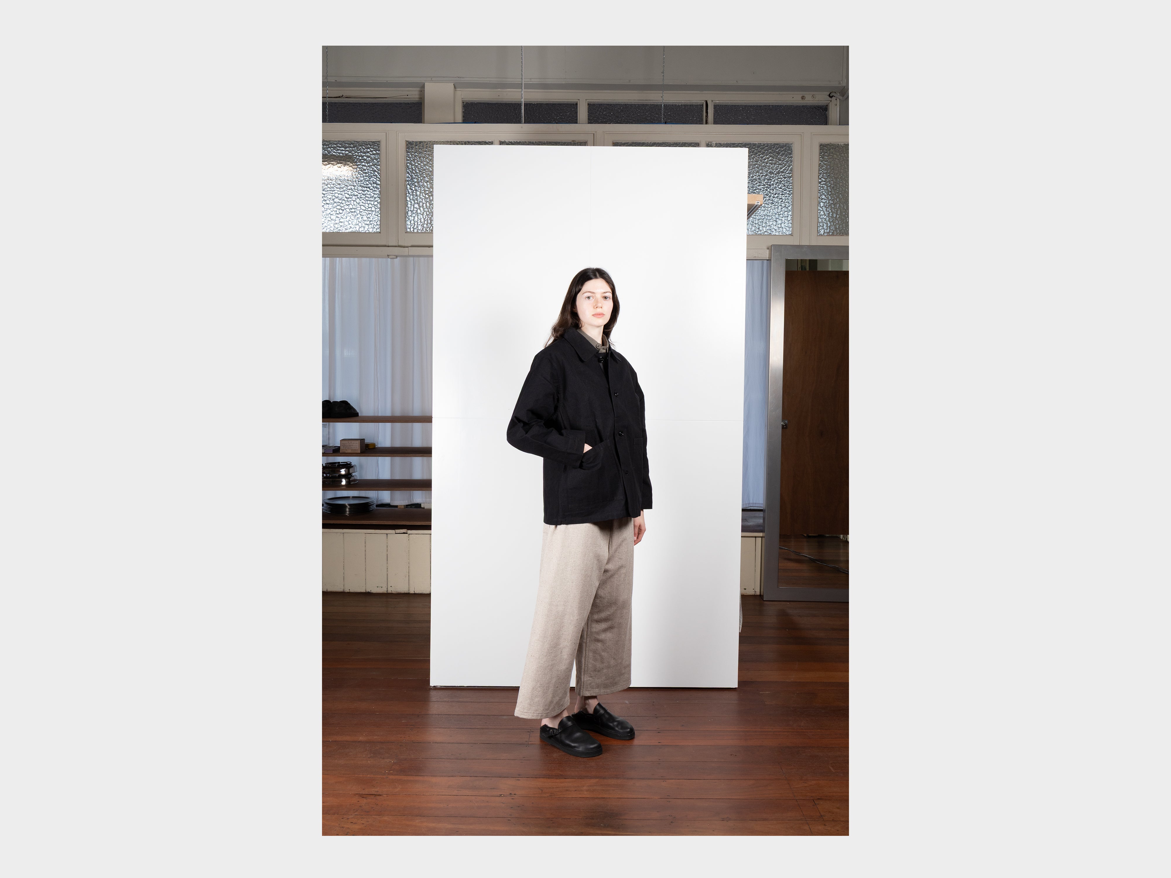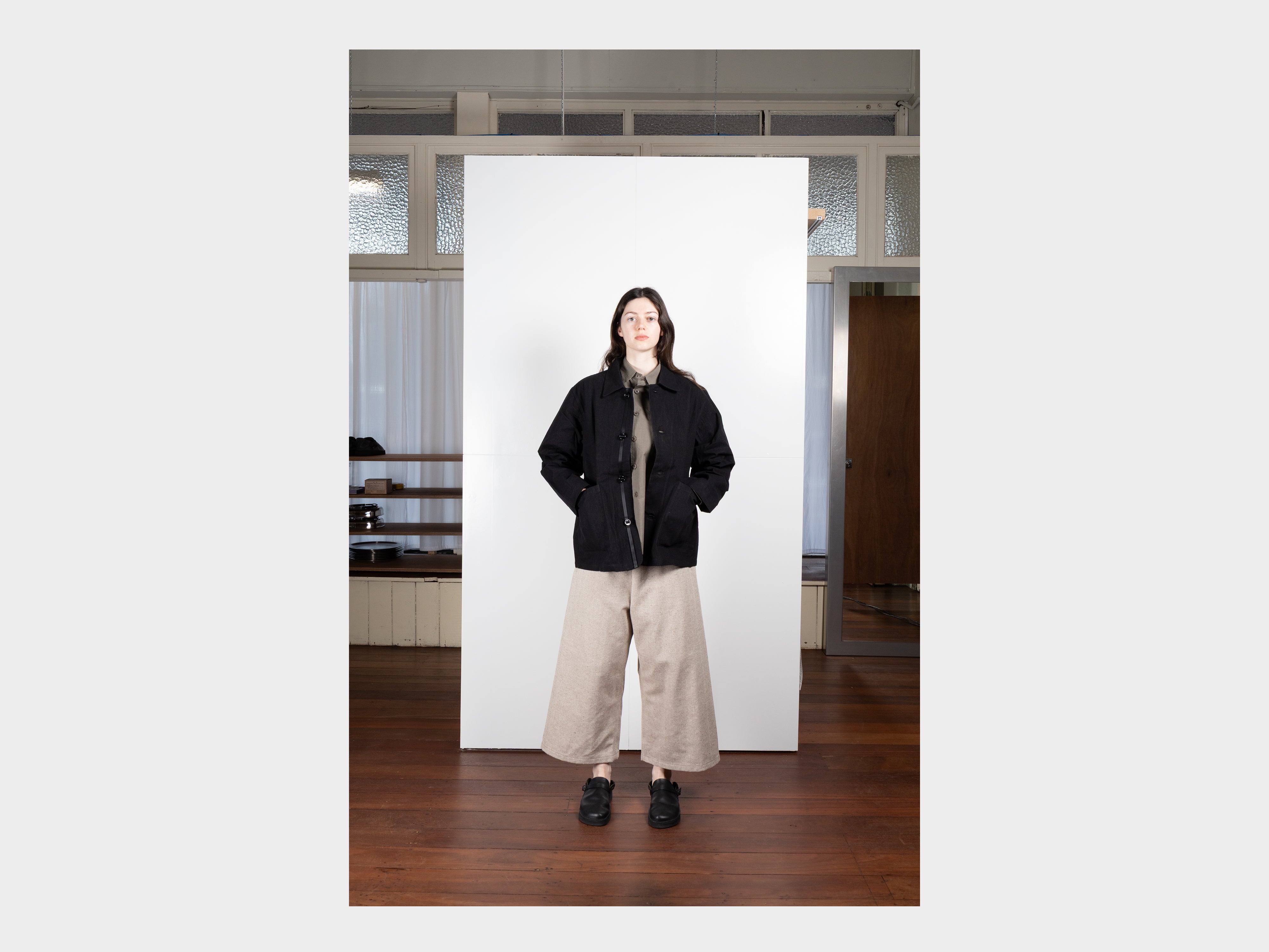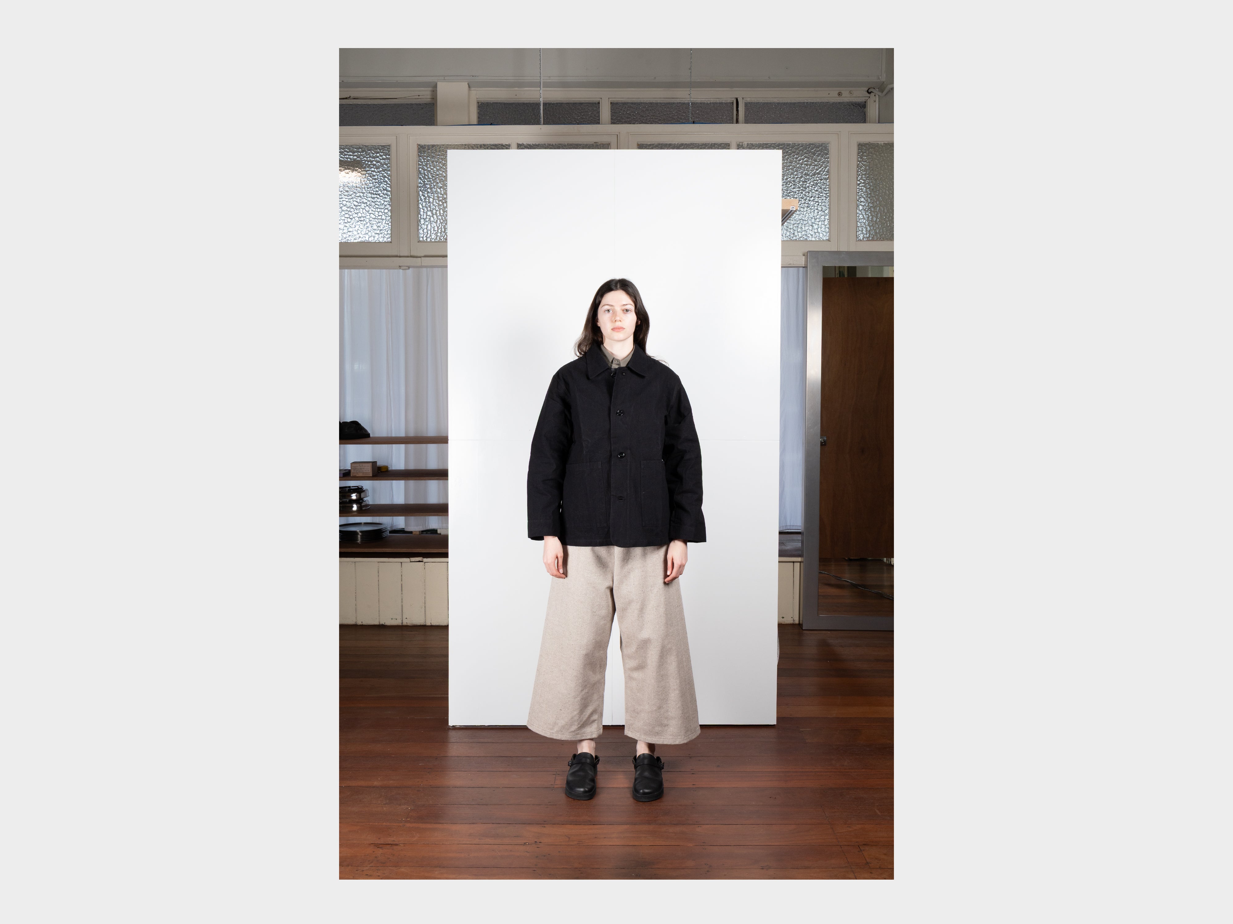 +100% cotton with a paraffin wax coating. Yarn spun and dyed in Japan using cotton grown in Australia and the USA. Woven in Shizouka, then coated and baked in paraffin wax in Fukui. This original MAN–TLE cloth, MT-Wax, is designed to reveal new sound, colour, and texture over time. At first heavyweight and naturally stiff, it softens, fades, and changes form with washing and wear, becoming personal to the body it covers. Woven for MAN–TLE in Shizuoka, Japan.