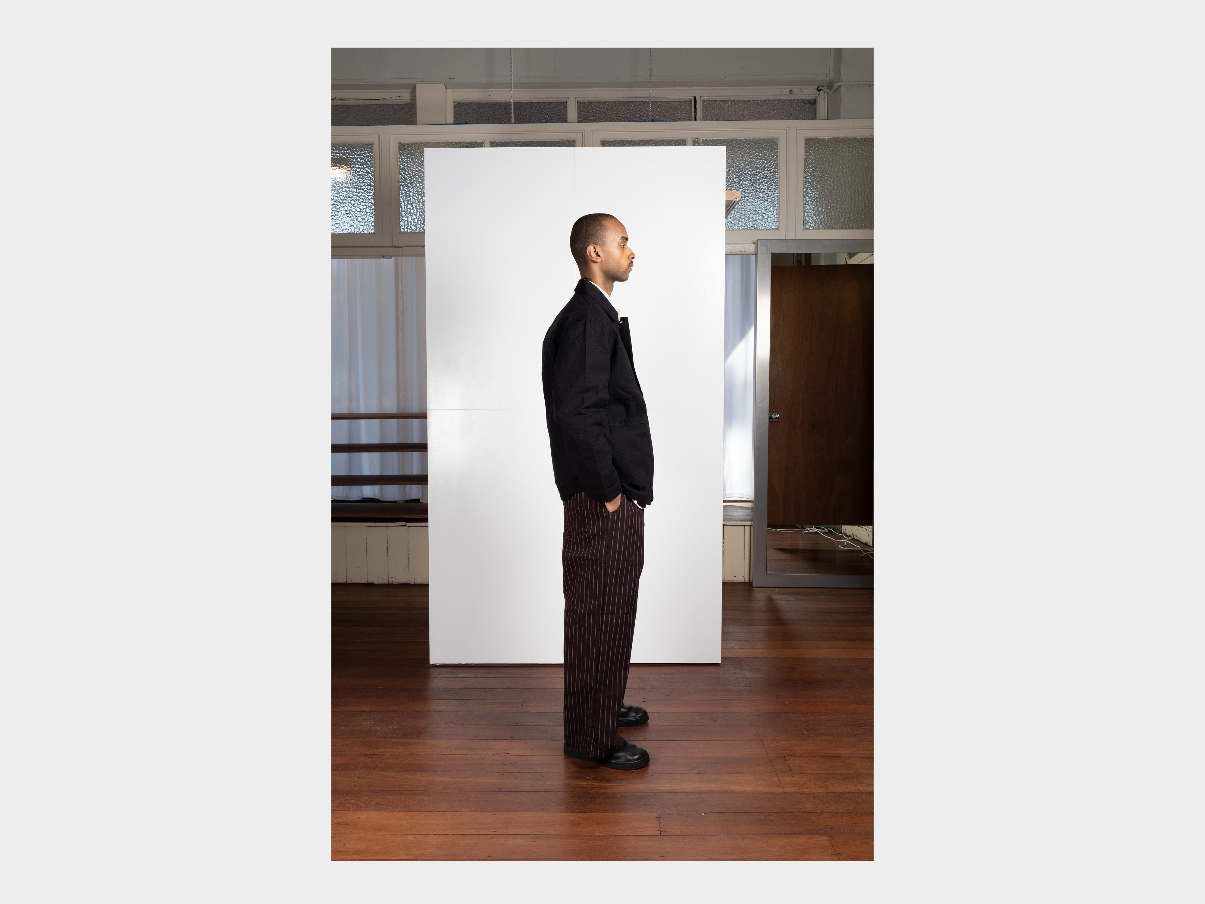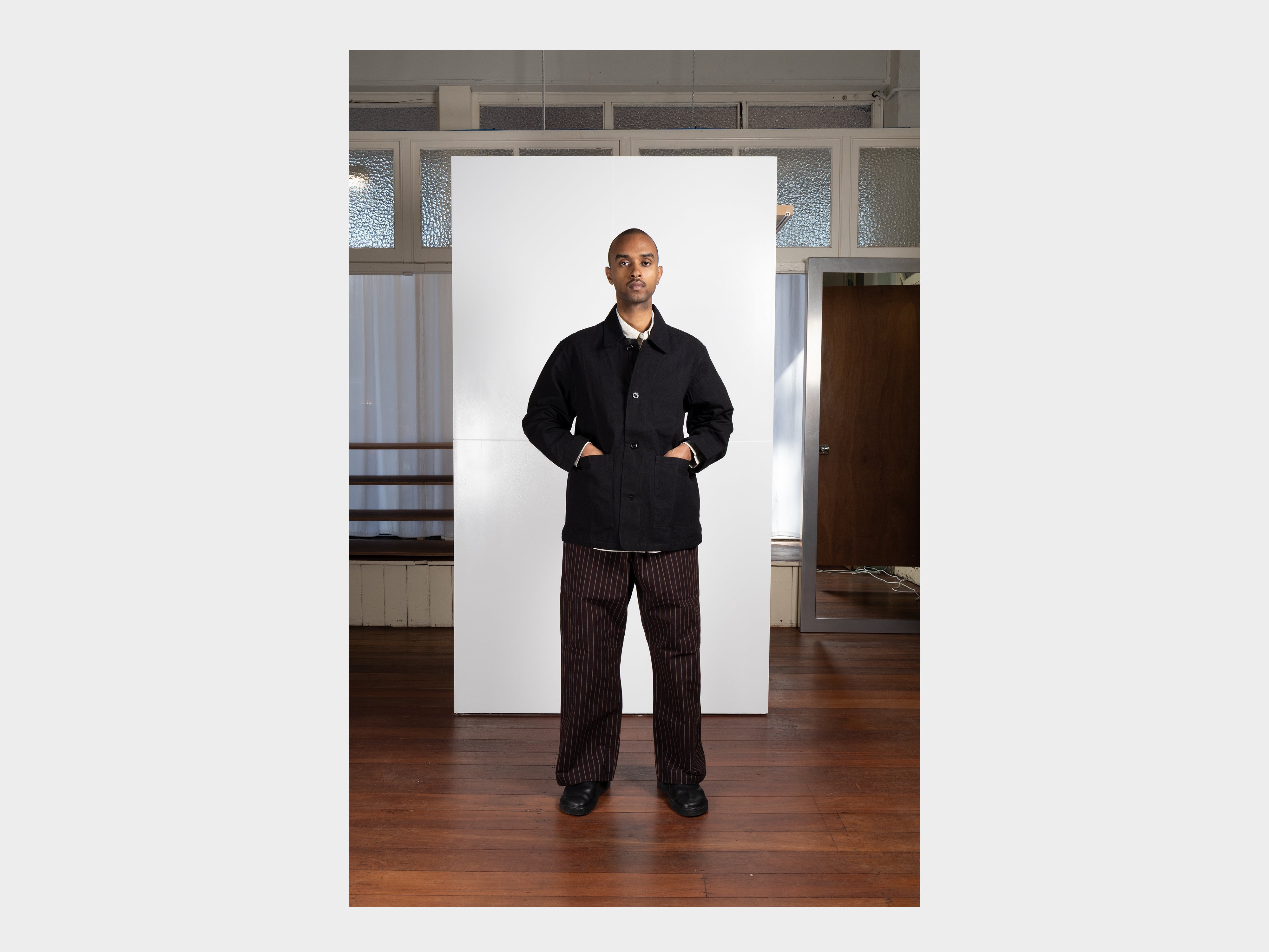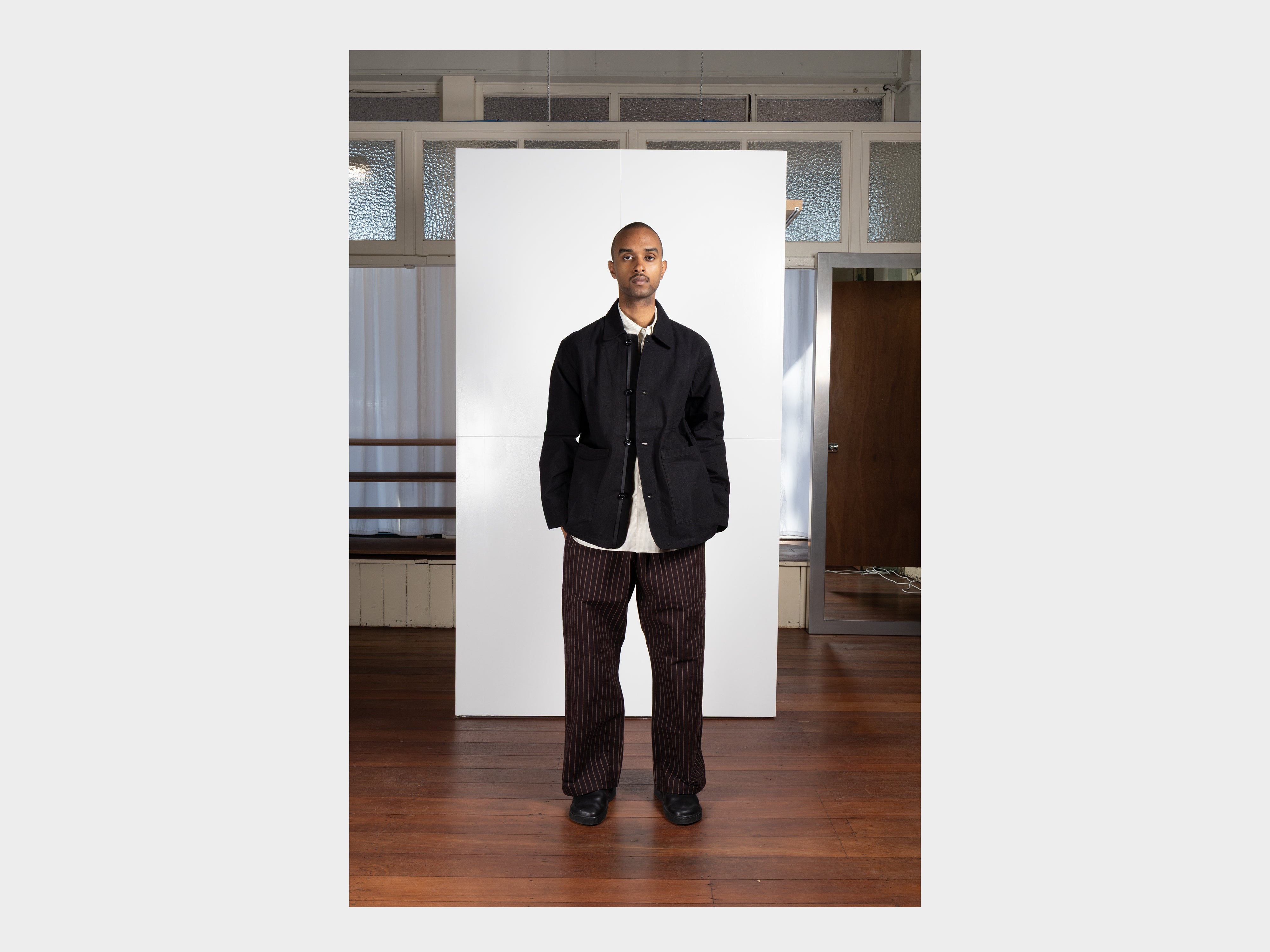 +100% cotton with a paraffin wax coating. Yarn spun and dyed in Japan using cotton grown in Australia and the USA. Woven in Shizouka, then coated and baked in paraffin wax in Fukui. This original MAN–TLE cloth, MT-Wax, is designed to reveal new sound, colour, and texture over time. At first heavyweight and naturally stiff, it softens, fades, and changes form with washing and wear, becoming personal to the body it covers. Woven for MAN–TLE in Shizuoka, Japan.