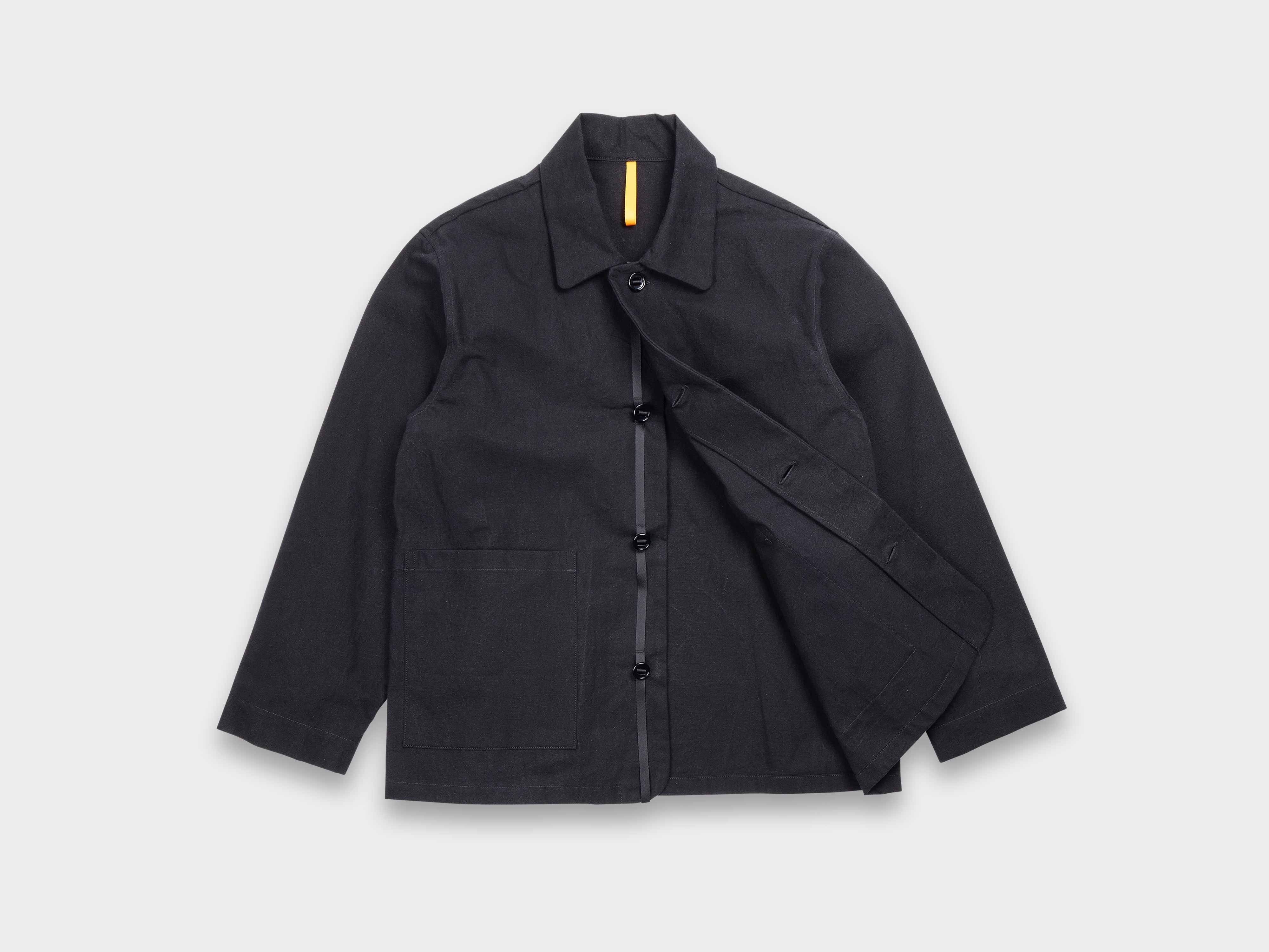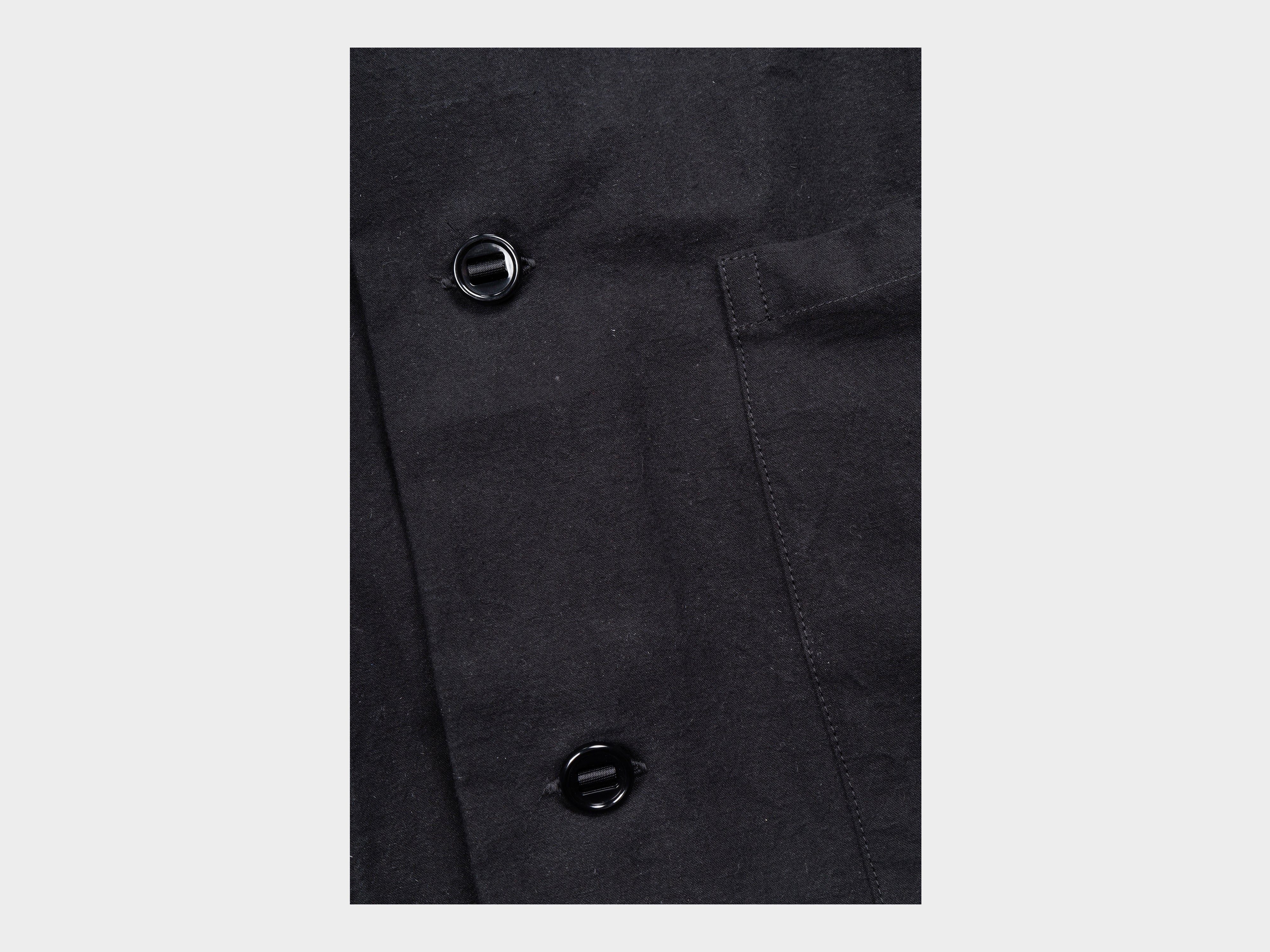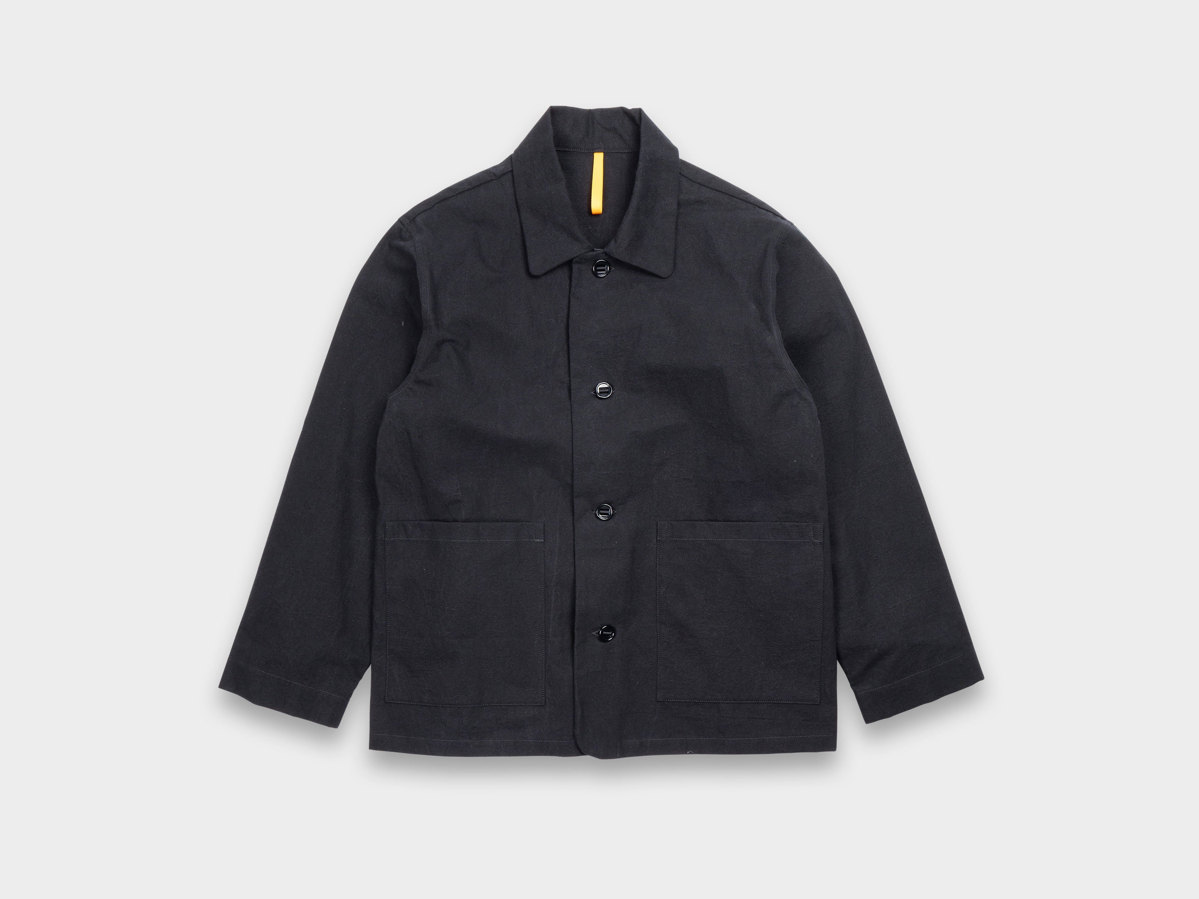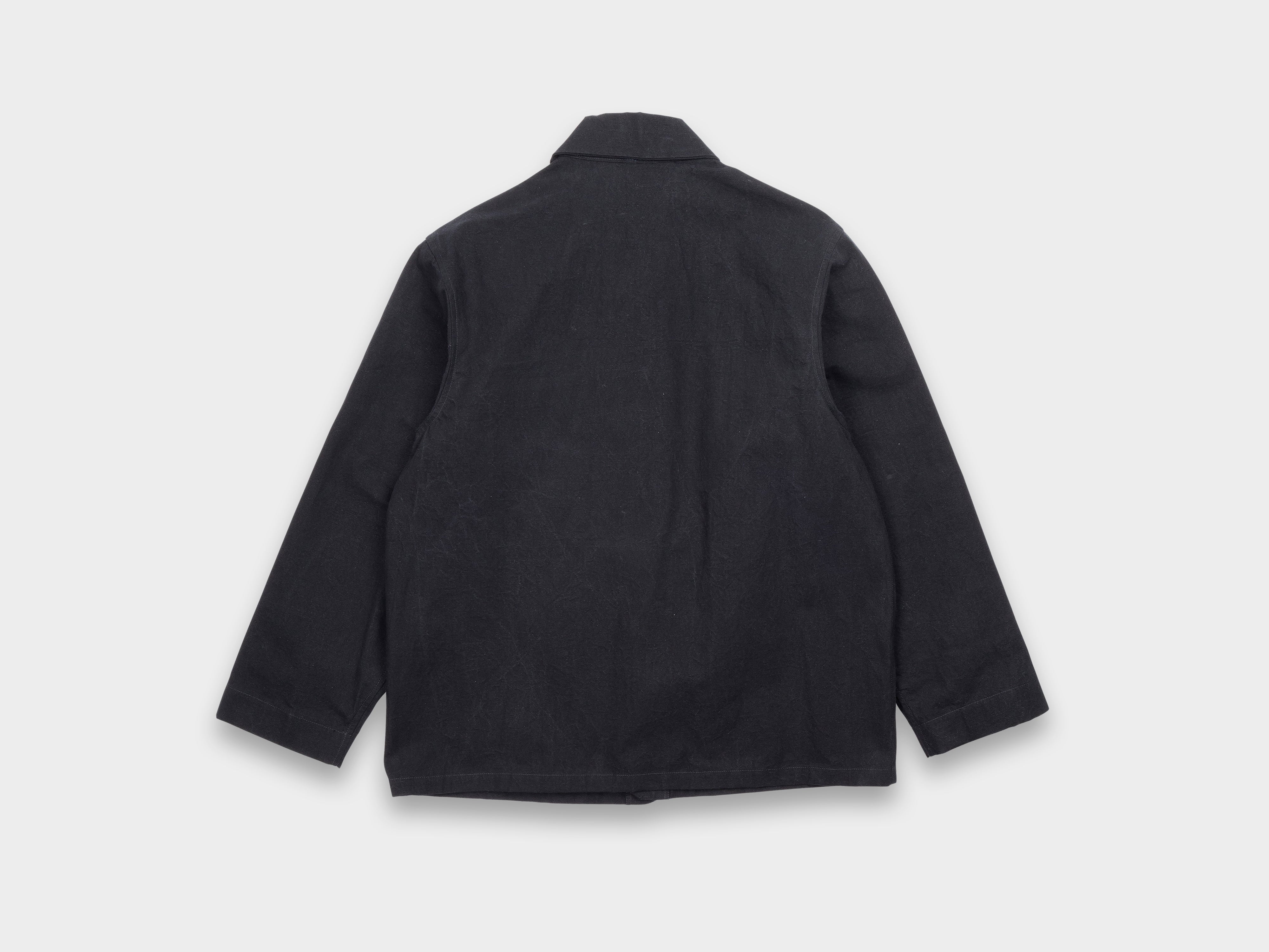 +Relaxed fitting chore coat. Enlarged front patch pockets, curved collar, straight hem, slot buttons threaded onto seatbelt tape. Made in Japan.