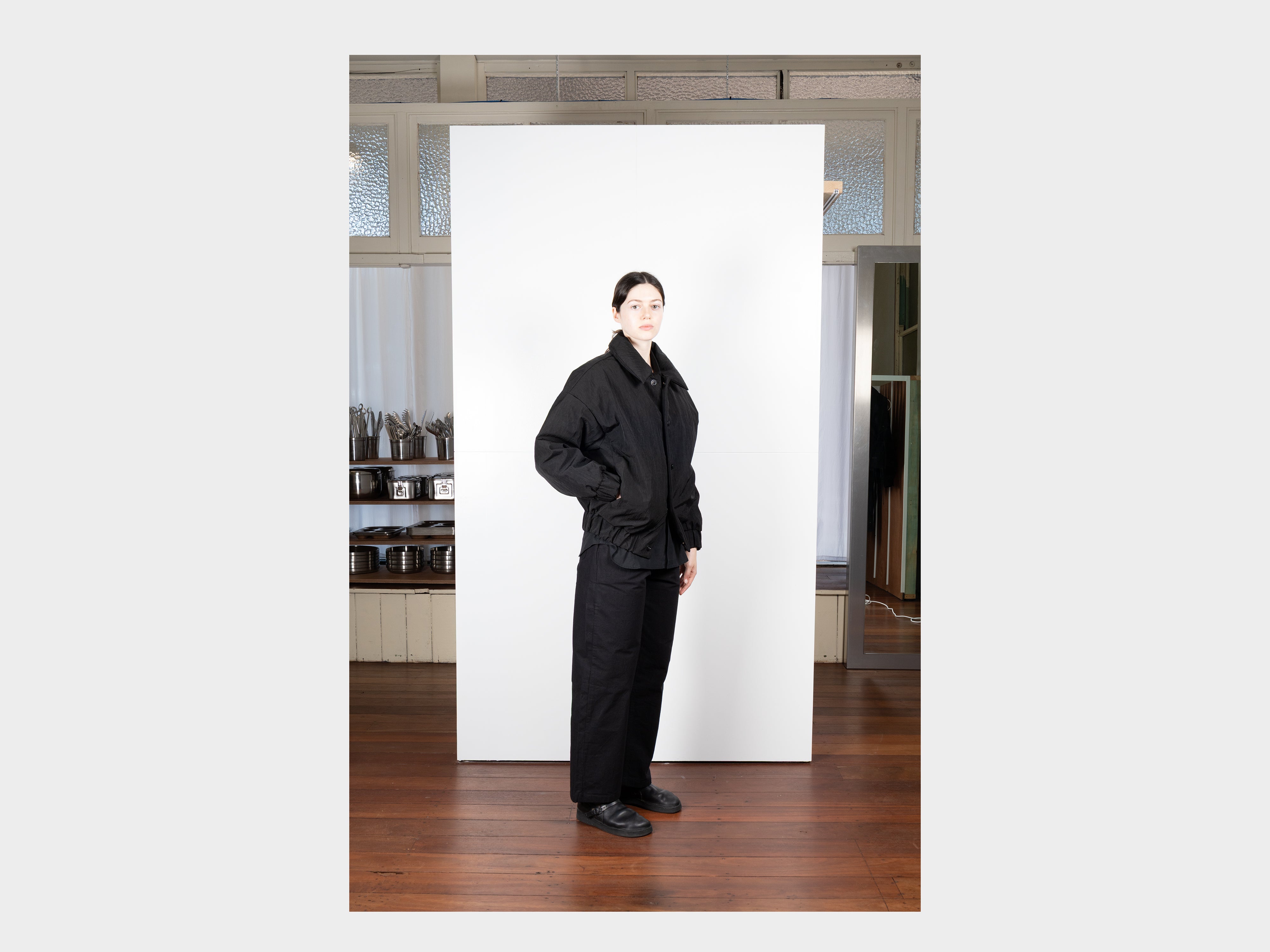 +Oversized down-filled blouson. Features ethically farmed European silver goose down, cleaned and processed in Japan by Kawada Feather. This down retains its original mottled colour, as no bleach is used. To showcase its unique tone, the garment is lined with a transparent 100% nylon micro-ripstop developed by Toray. Comprising 90% down and 10% feather to reduce clumping, this product has a fill-power rating of 850. Snap hardware closures, dropped shoulders, elastic cuffs and hem, generous sleeve and body. Read our Kawada Feather story here. Made in Japan.