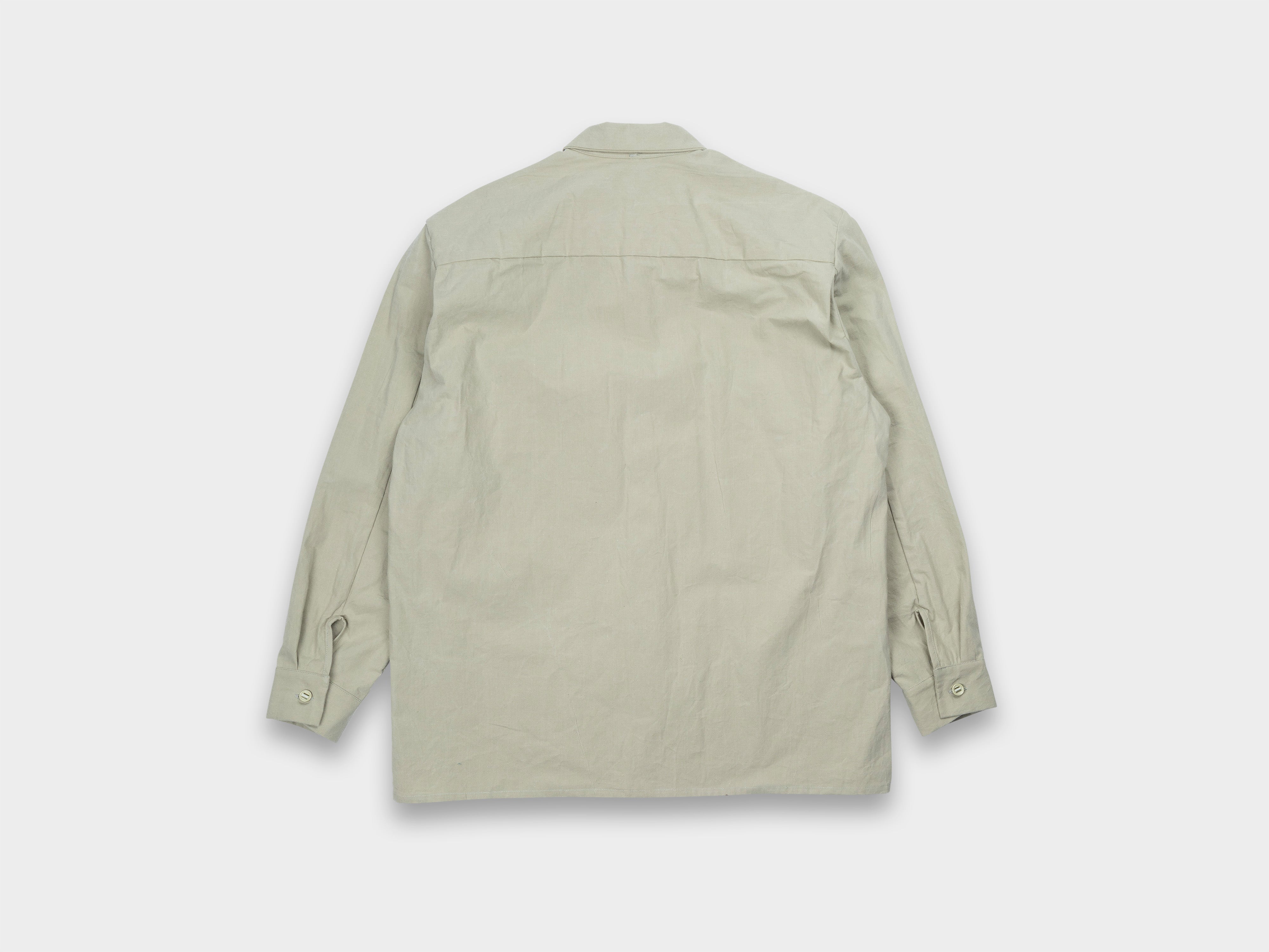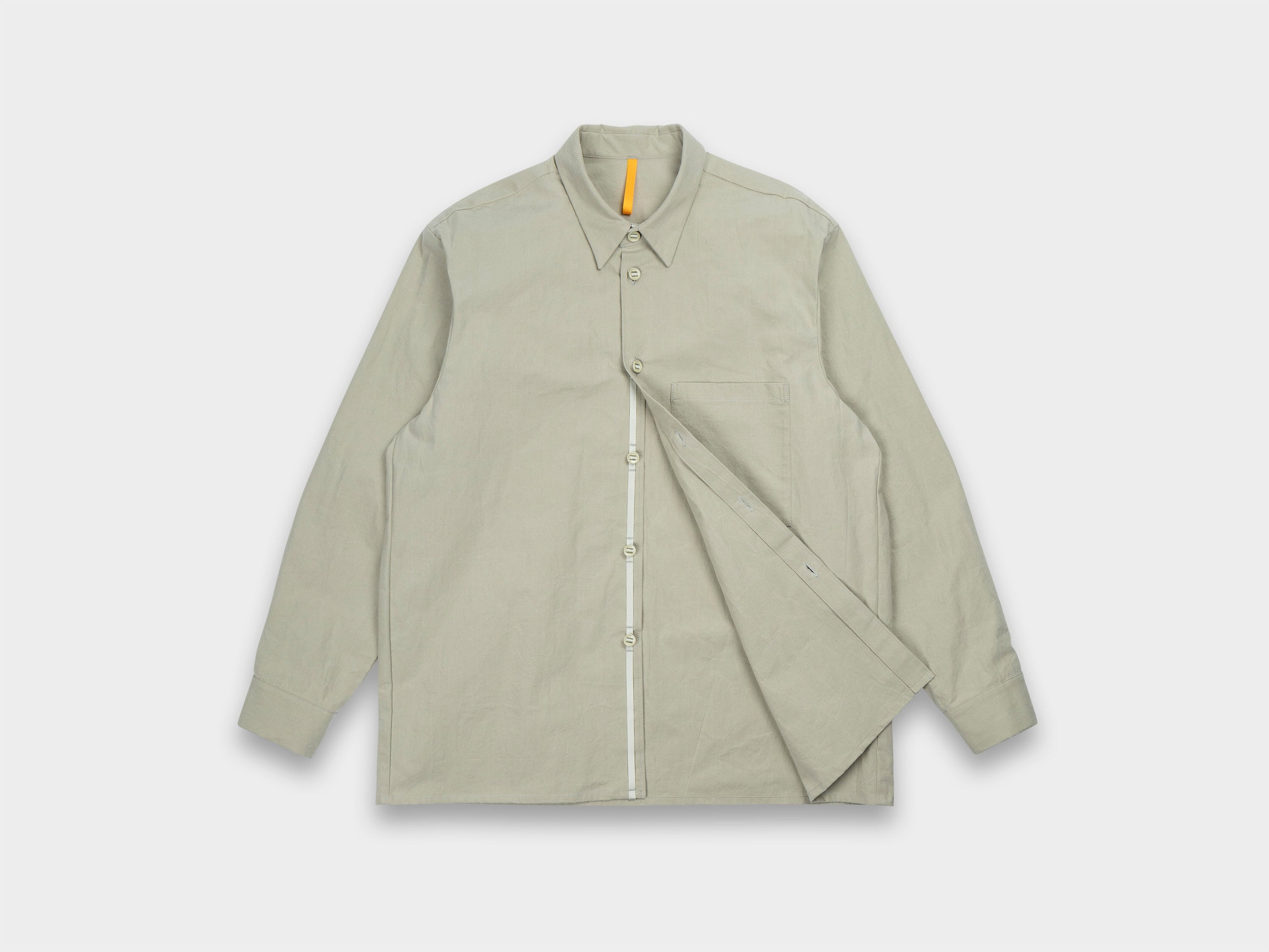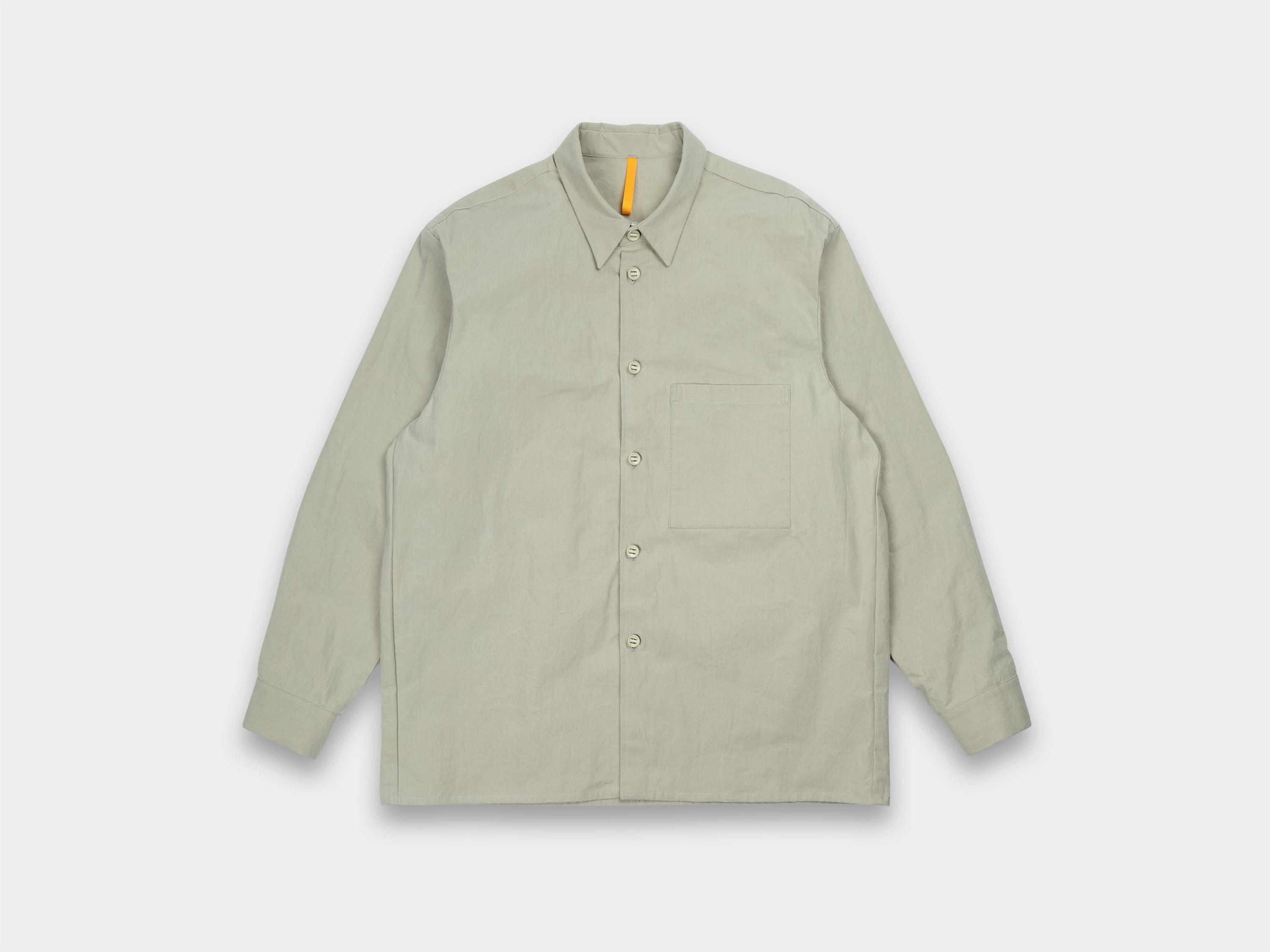 +Redesigned Shirt-1, our first shirt that had remained unchanged since Range-1, now updated with a looser fit, generous room through the armholes, a slightly higher collar, and a large patch pocket at the left chest. Relaxed sleeve with single button closure, slot buttons threaded onto seat belt tape, straight hem. Made in Japan.