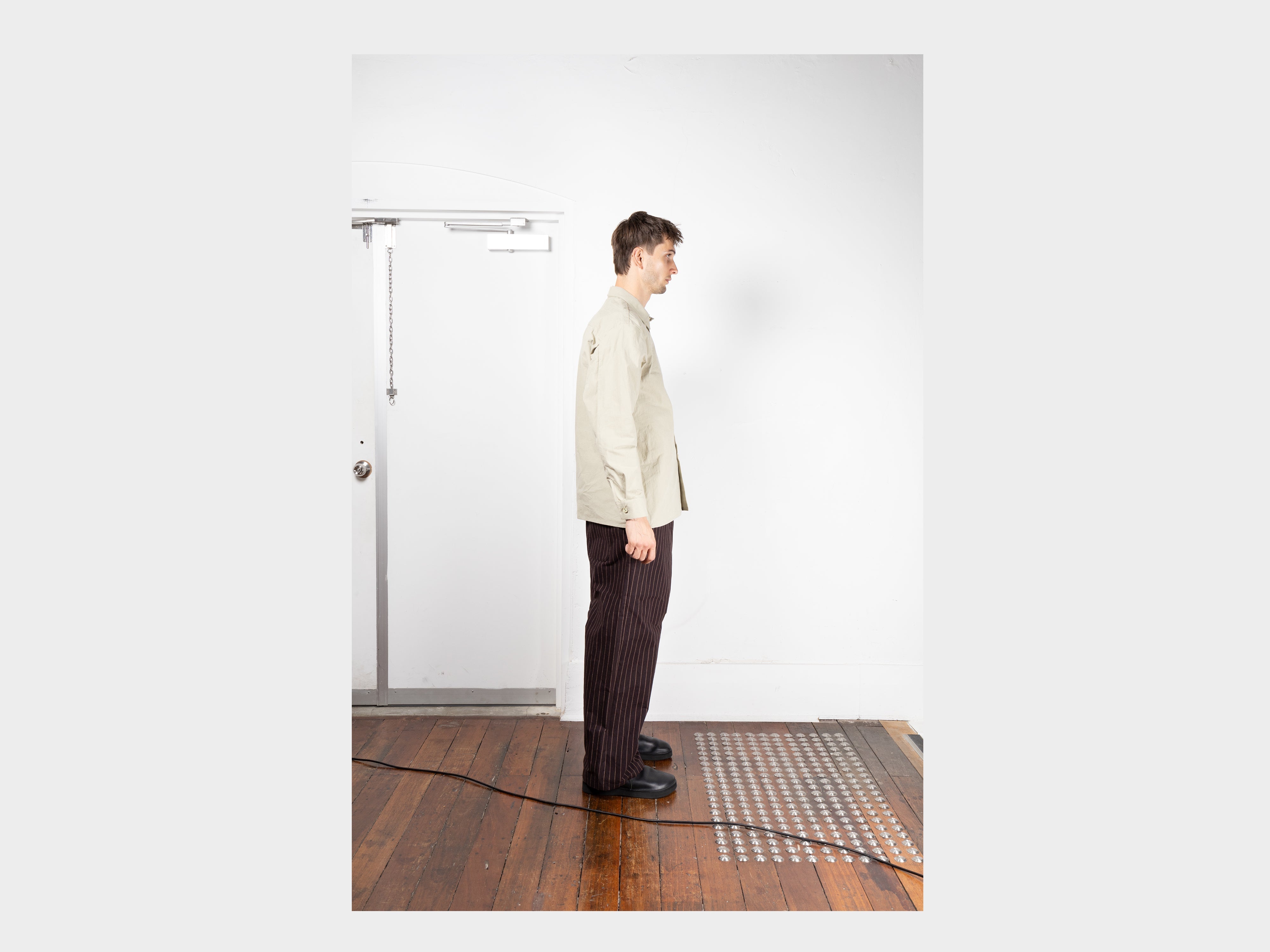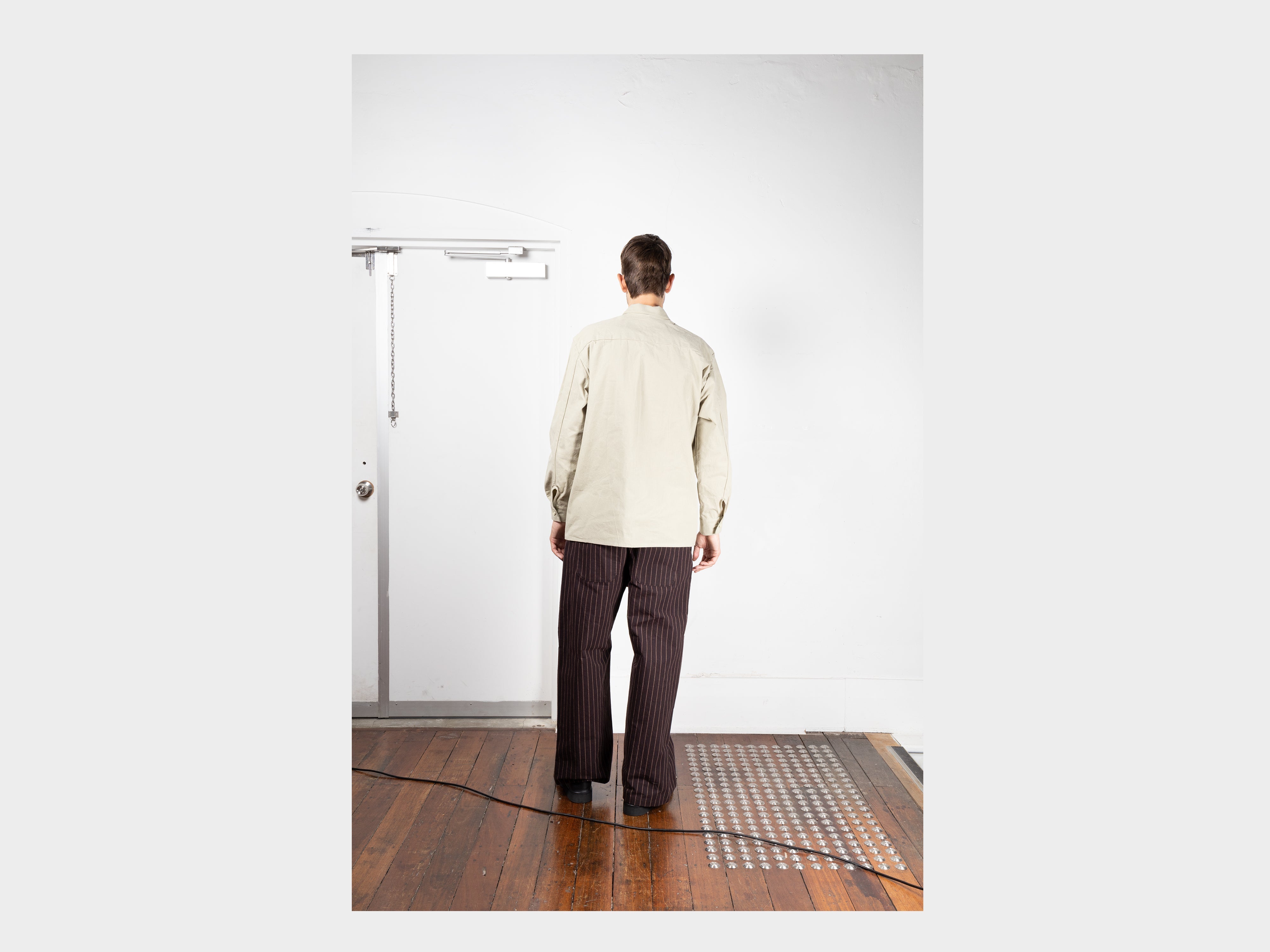 +100% cotton with a paraffin wax coating. Yarn spun and dyed in Japan using cotton grown in Australia and the USA. Woven in Shizouka, then coated and baked in paraffin wax in Fukui. This original MAN–TLE cloth, MT-Wax, is designed to reveal new sound, colour, and texture over time. At first heavyweight and naturally stiff, it softens, fades, and changes form with washing and wear, becoming personal to the body it covers. Woven for MAN–TLE in Shizuoka, Japan.