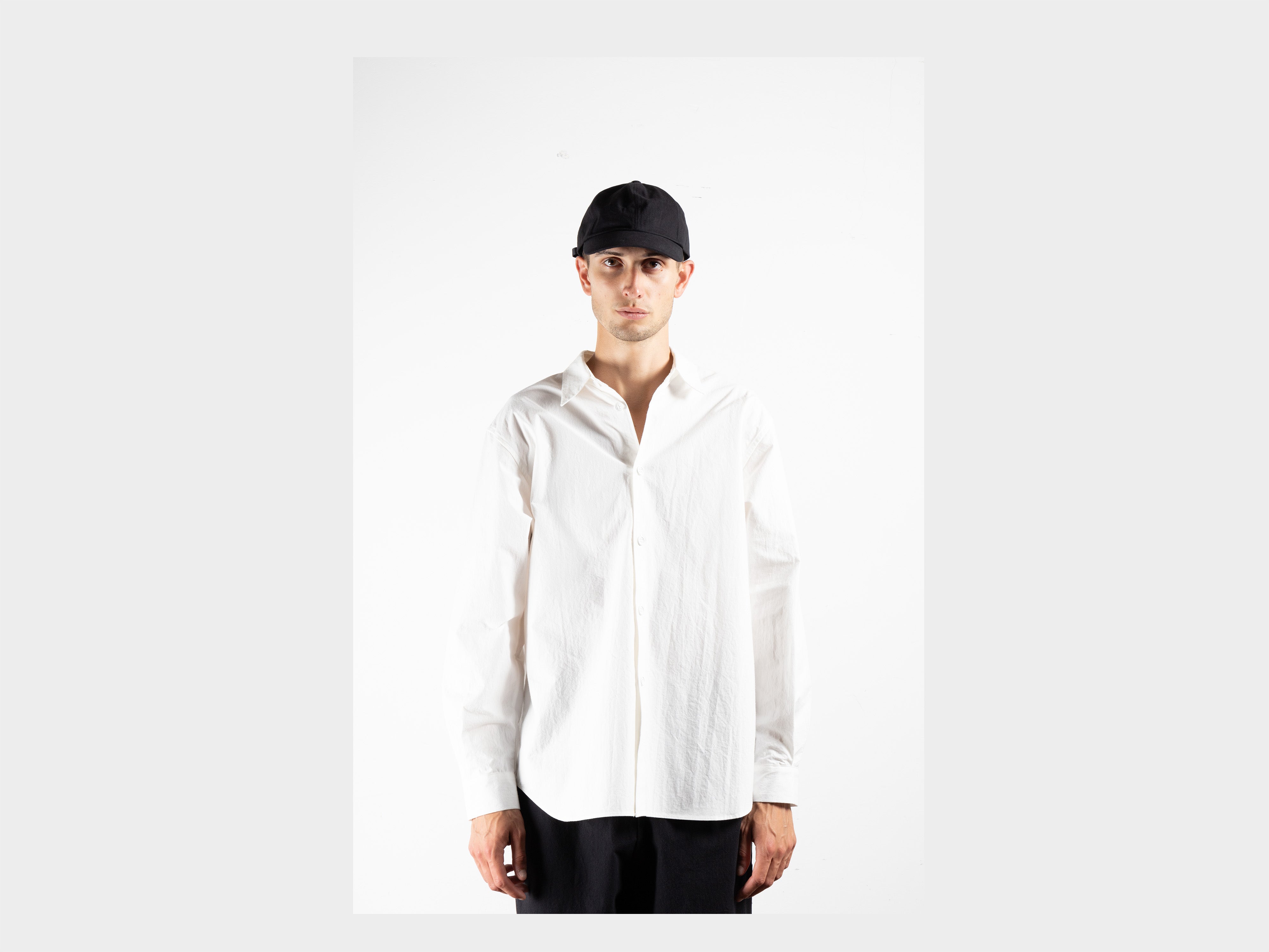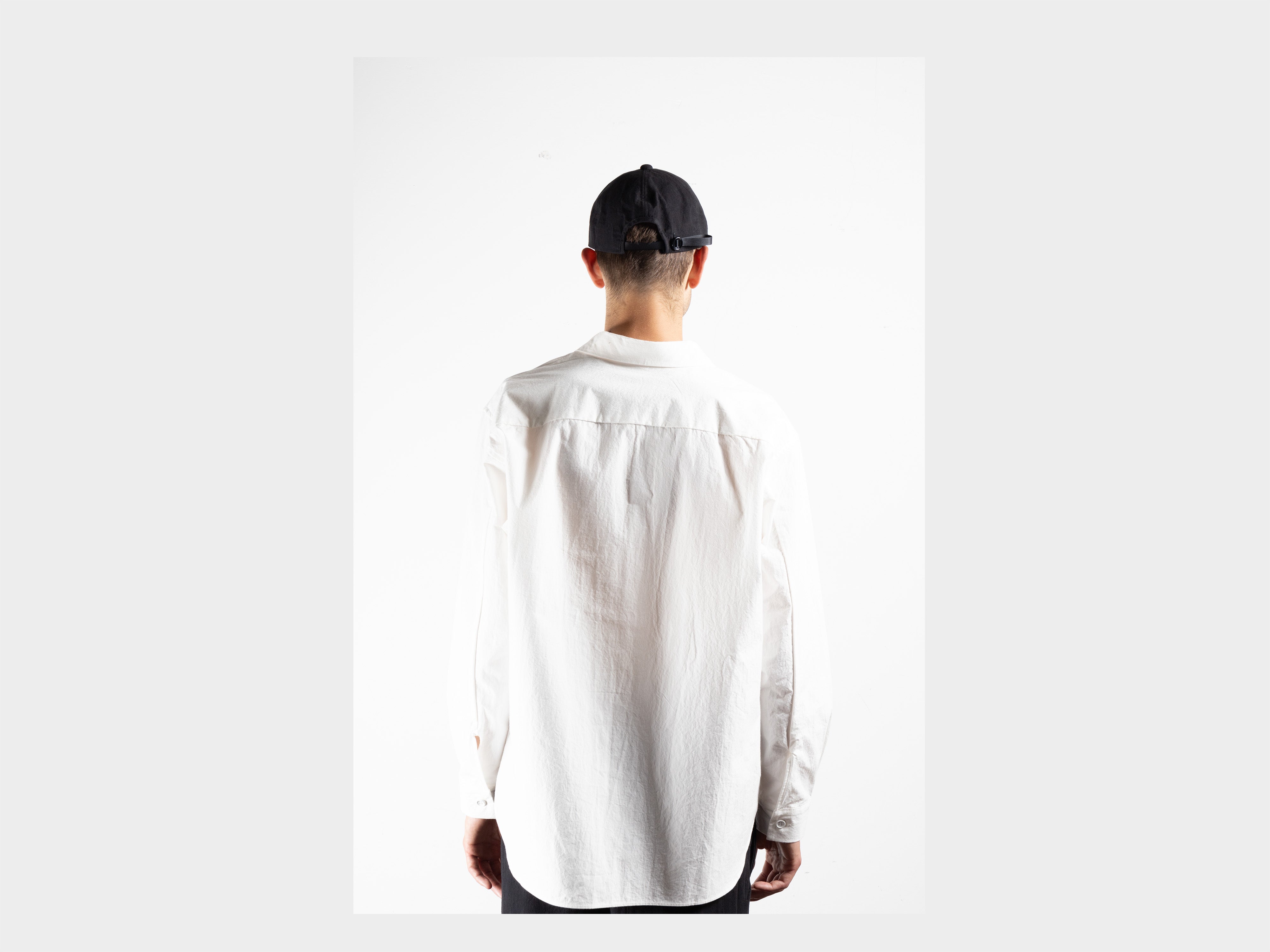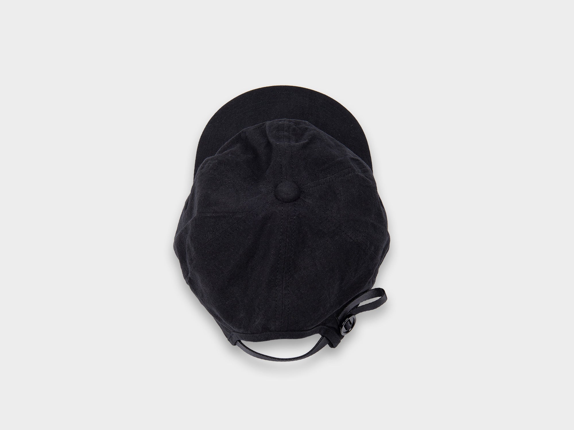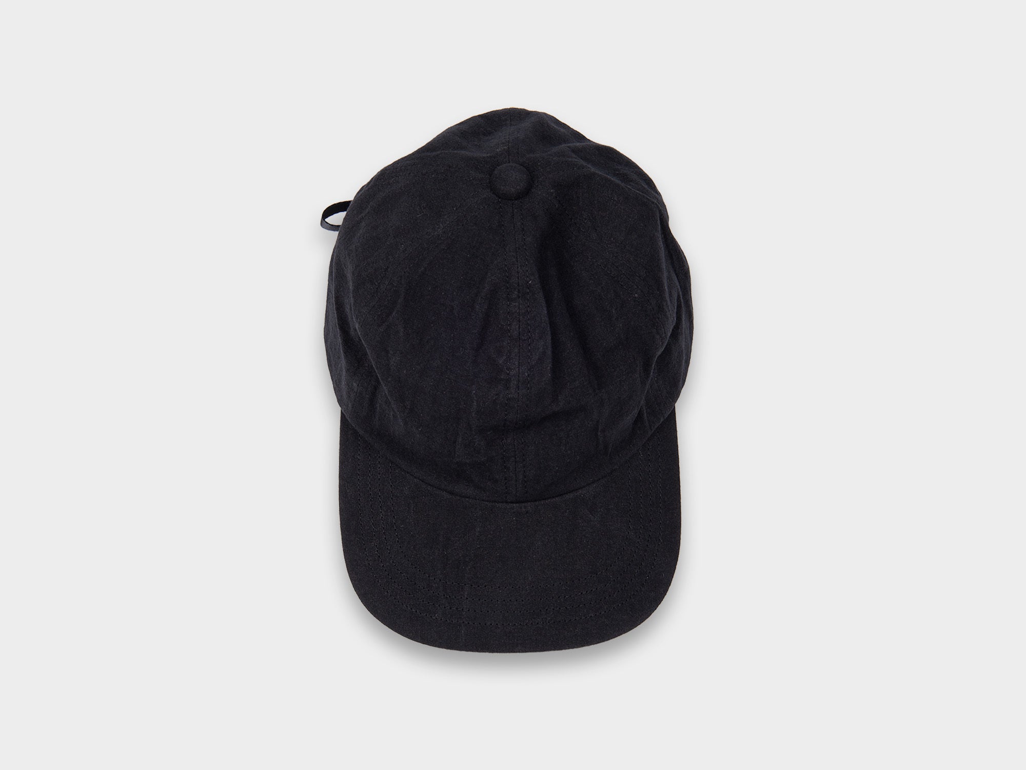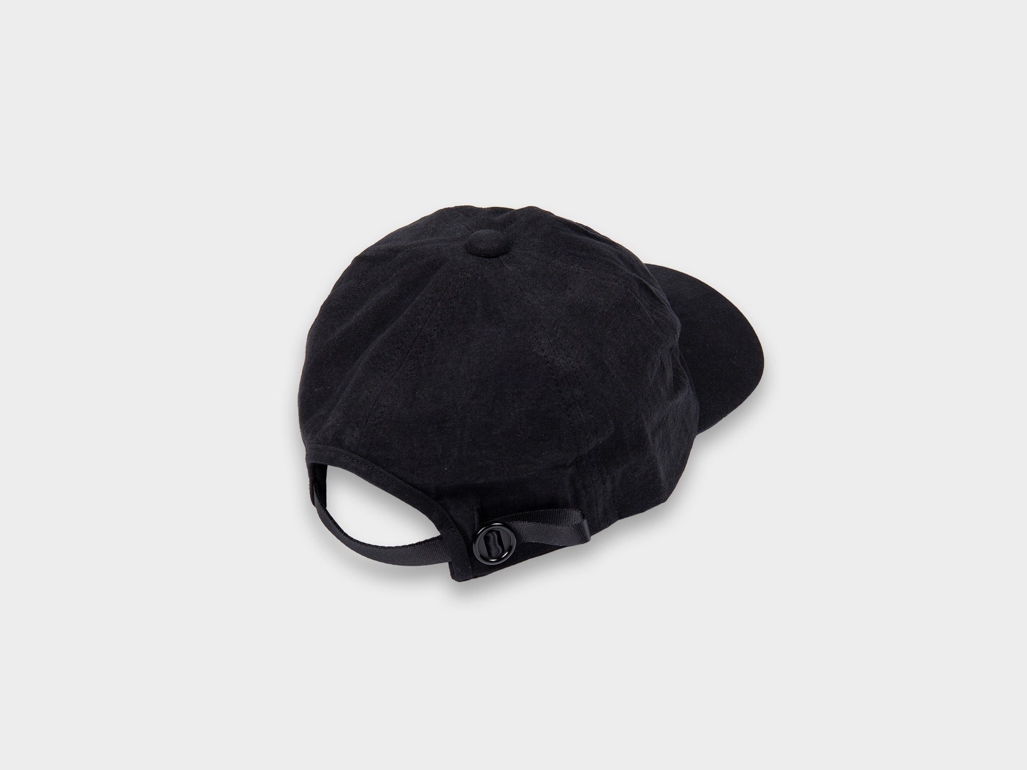 +Deep-cut six panel cap. Slot button threaded onto seatbelt tape, used to adjust size. Made in Japan.