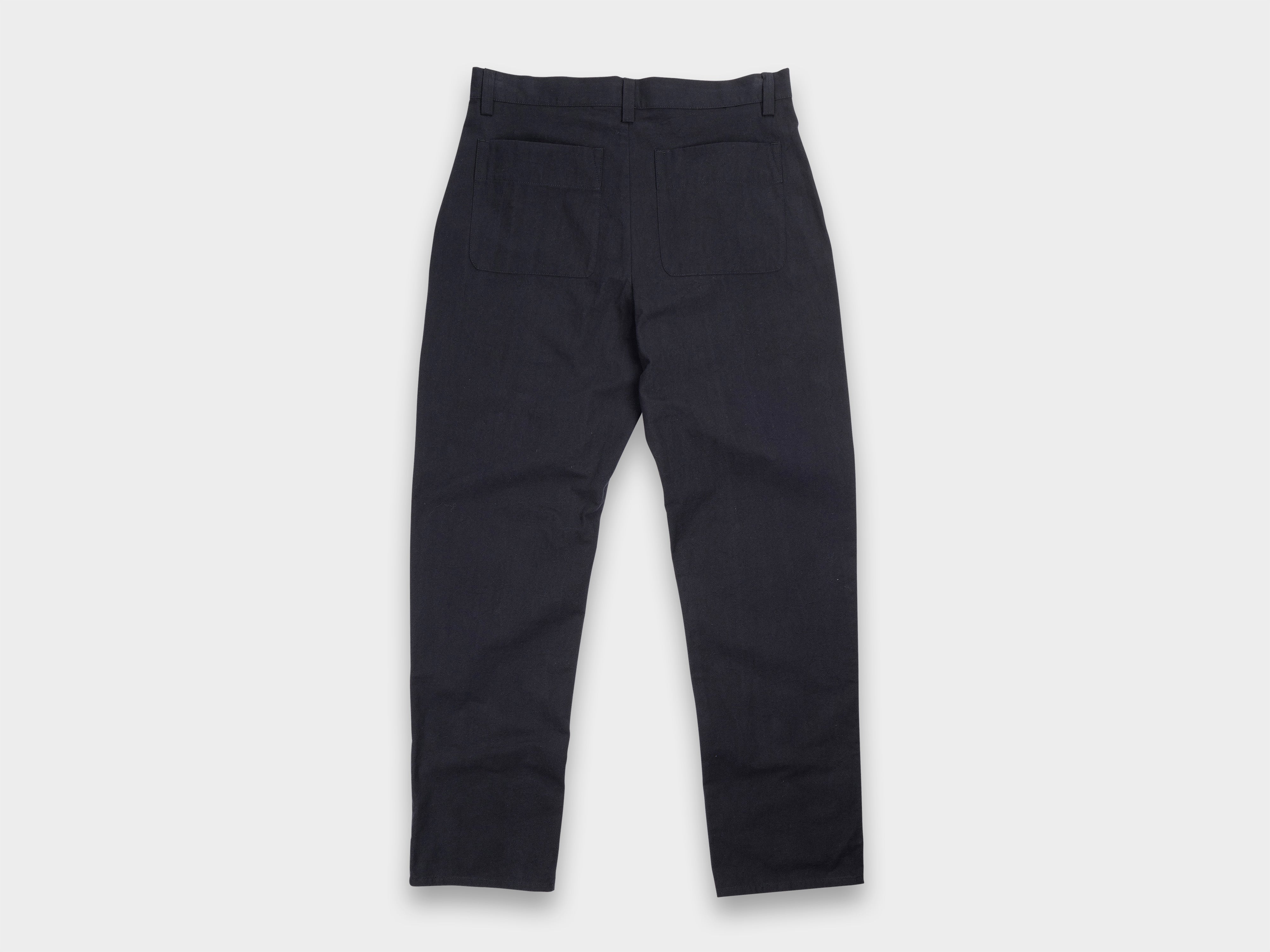 Relaxed straight-leg pants. Seat belt tape with adjustable button at the front, side-seam pockets and back patch pockets. Made in Japan.
