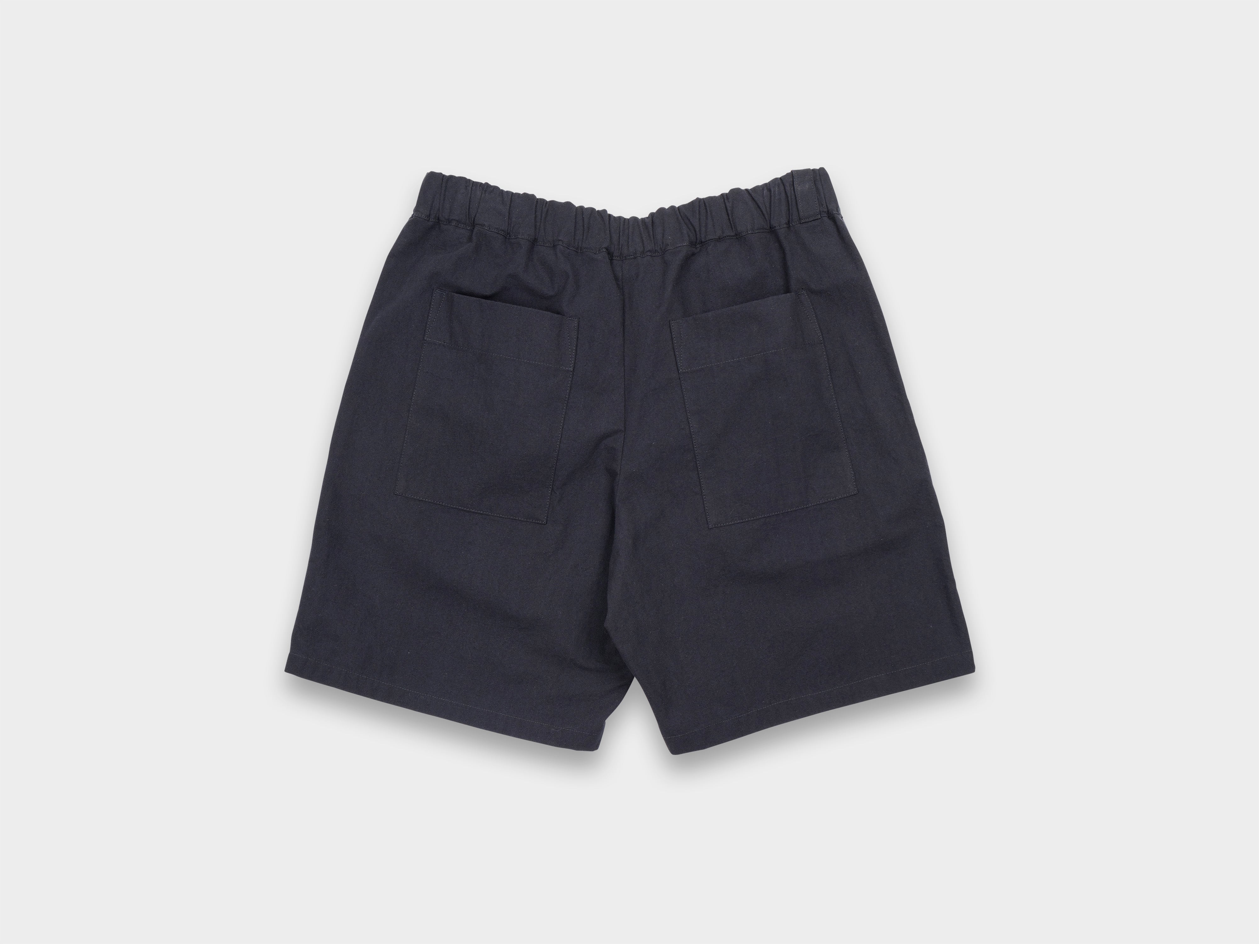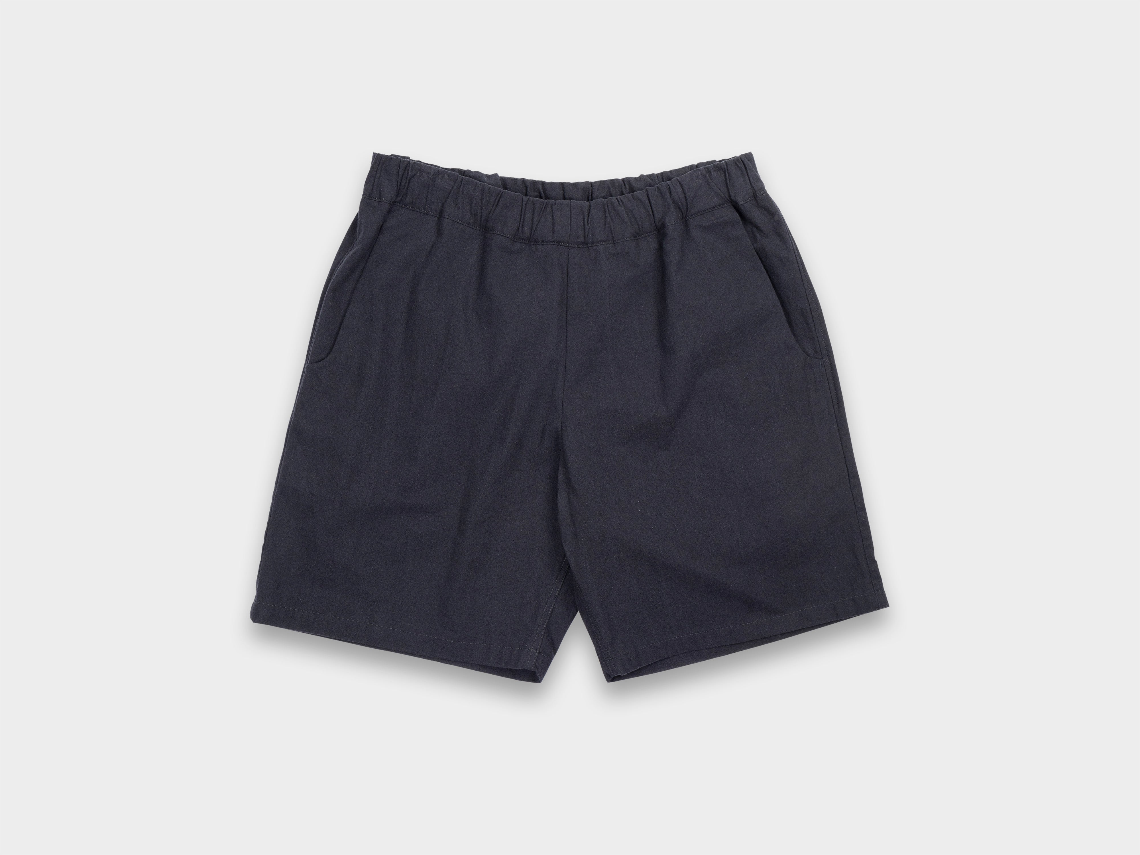 Relaxed-fit elastic waist shorts. Long rise, cut-away front pockets, rear patch pockets, drawstring waist. Made in Japan.