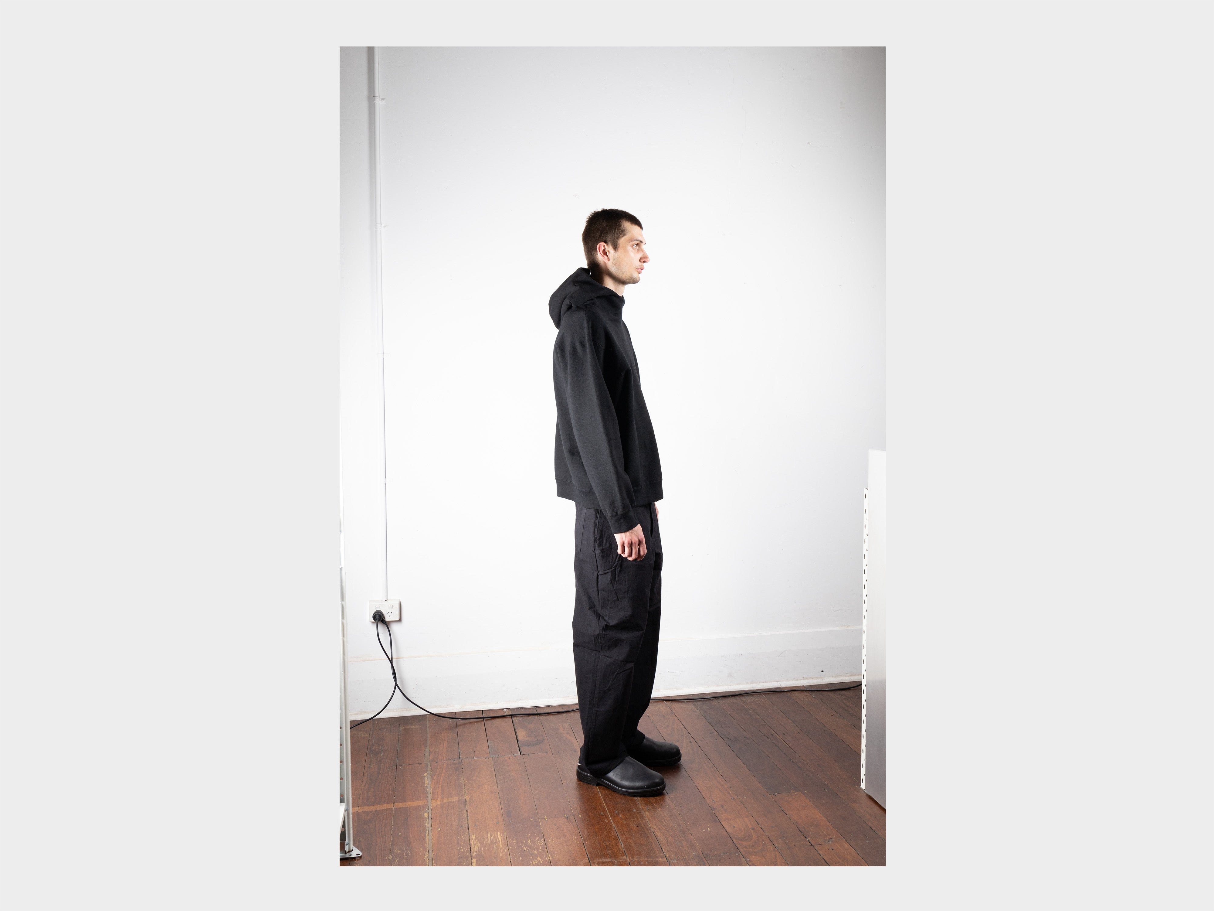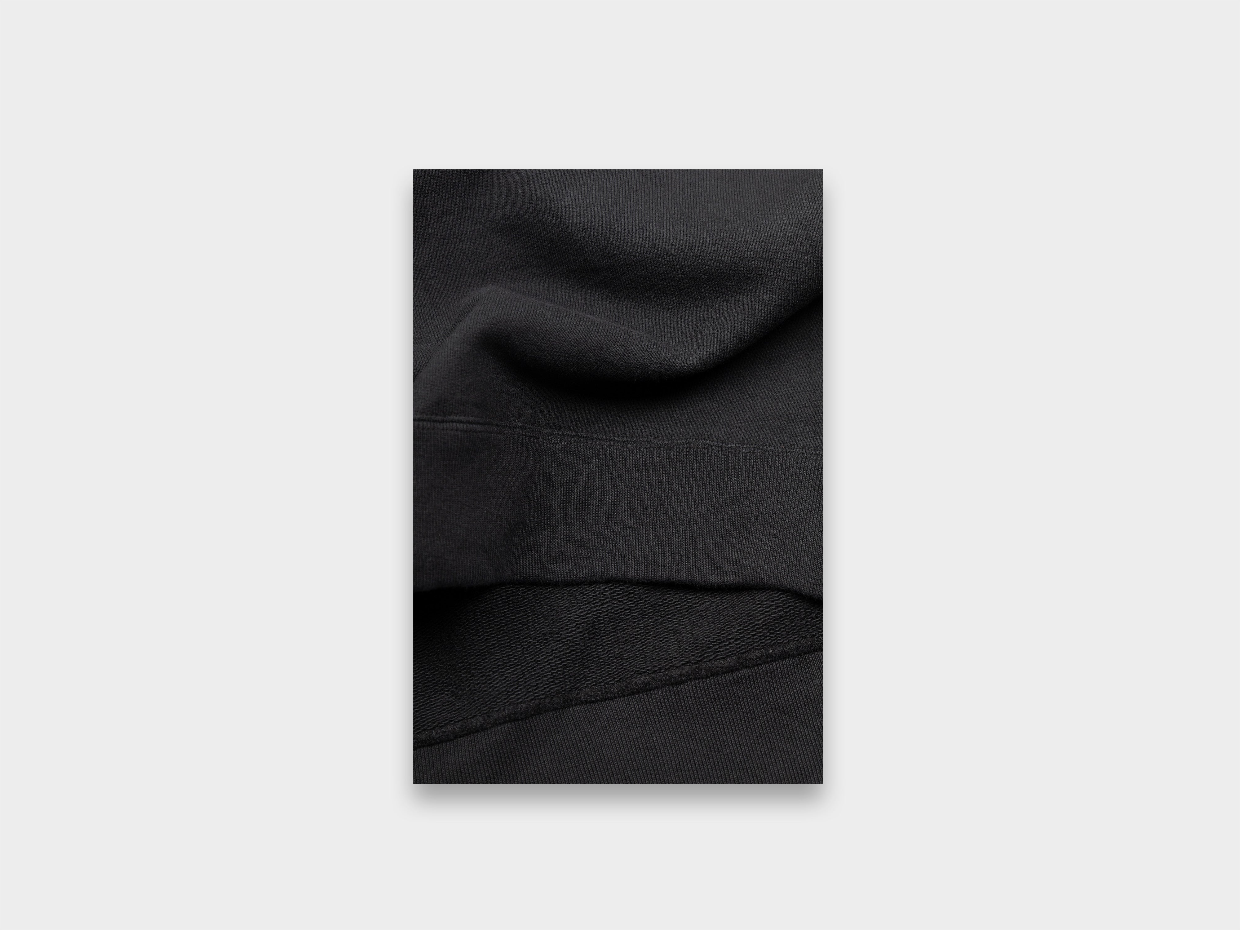 +100% cotton. Heavyweight 578gsm loopback fleece, pre-shrunk. Knitted in Wakayama, Japan.